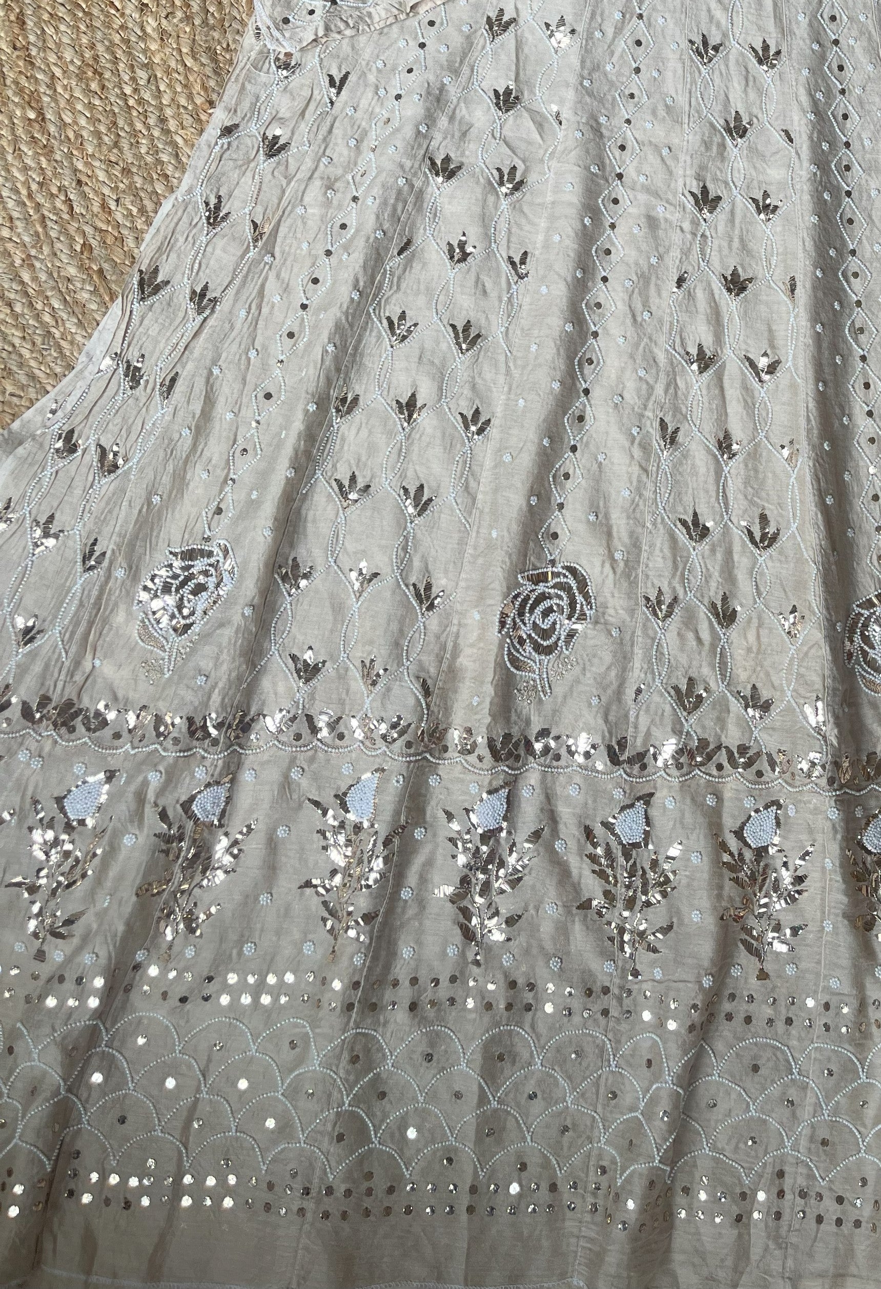 Beige Moonga Silk Mukaish/Badla Anarkali with Pearl Cutdana Embellishments