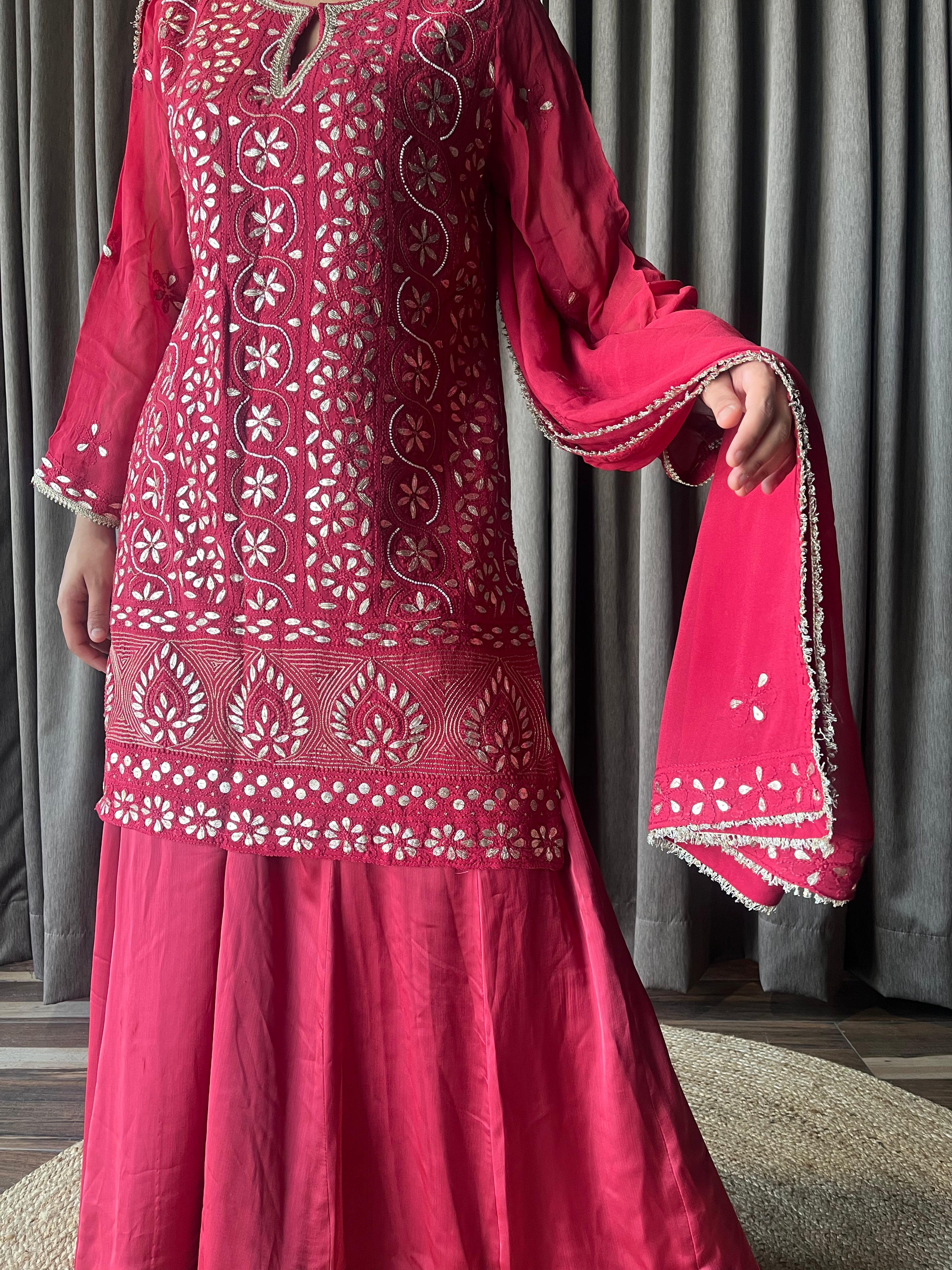 Burgundy colour sharara set in georgette with chikankari & gotapatti embellished with pearls