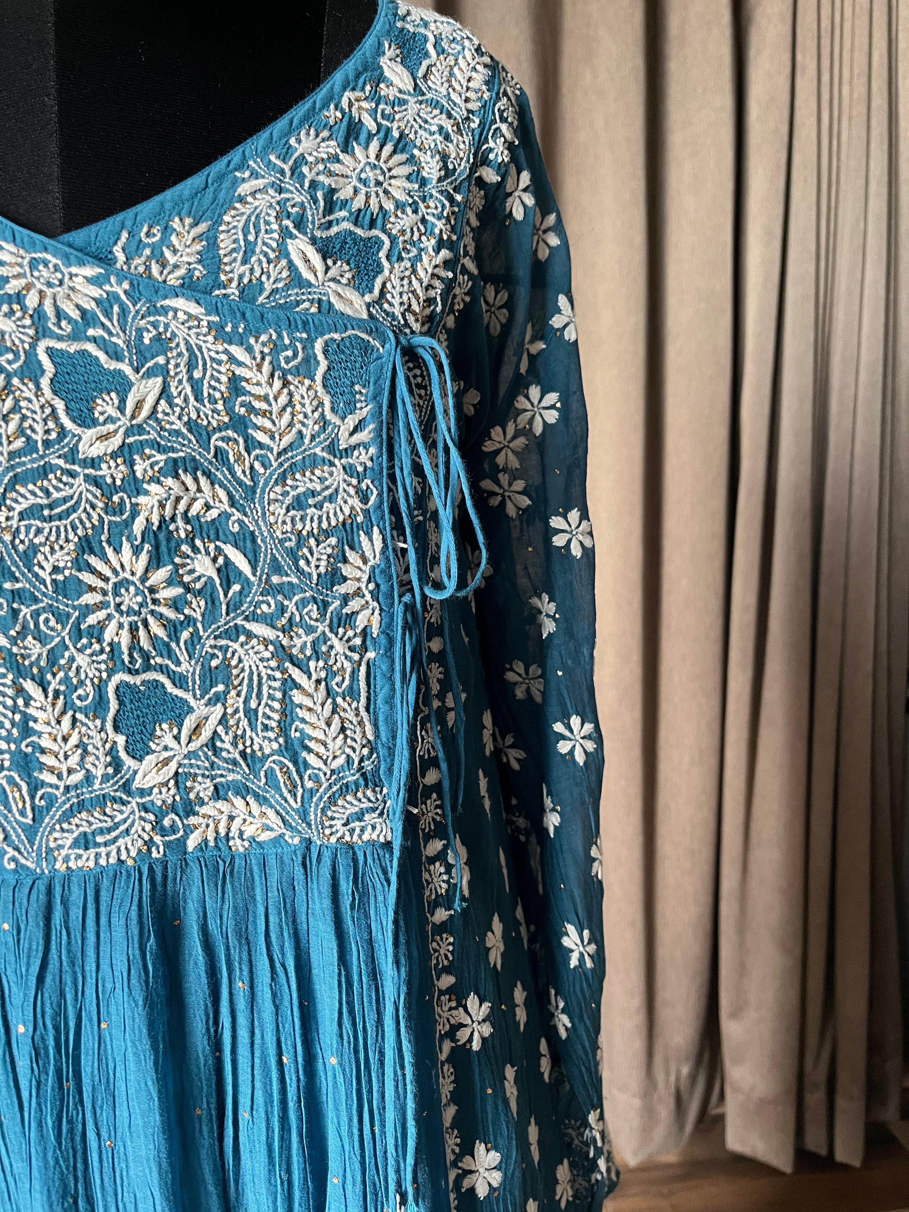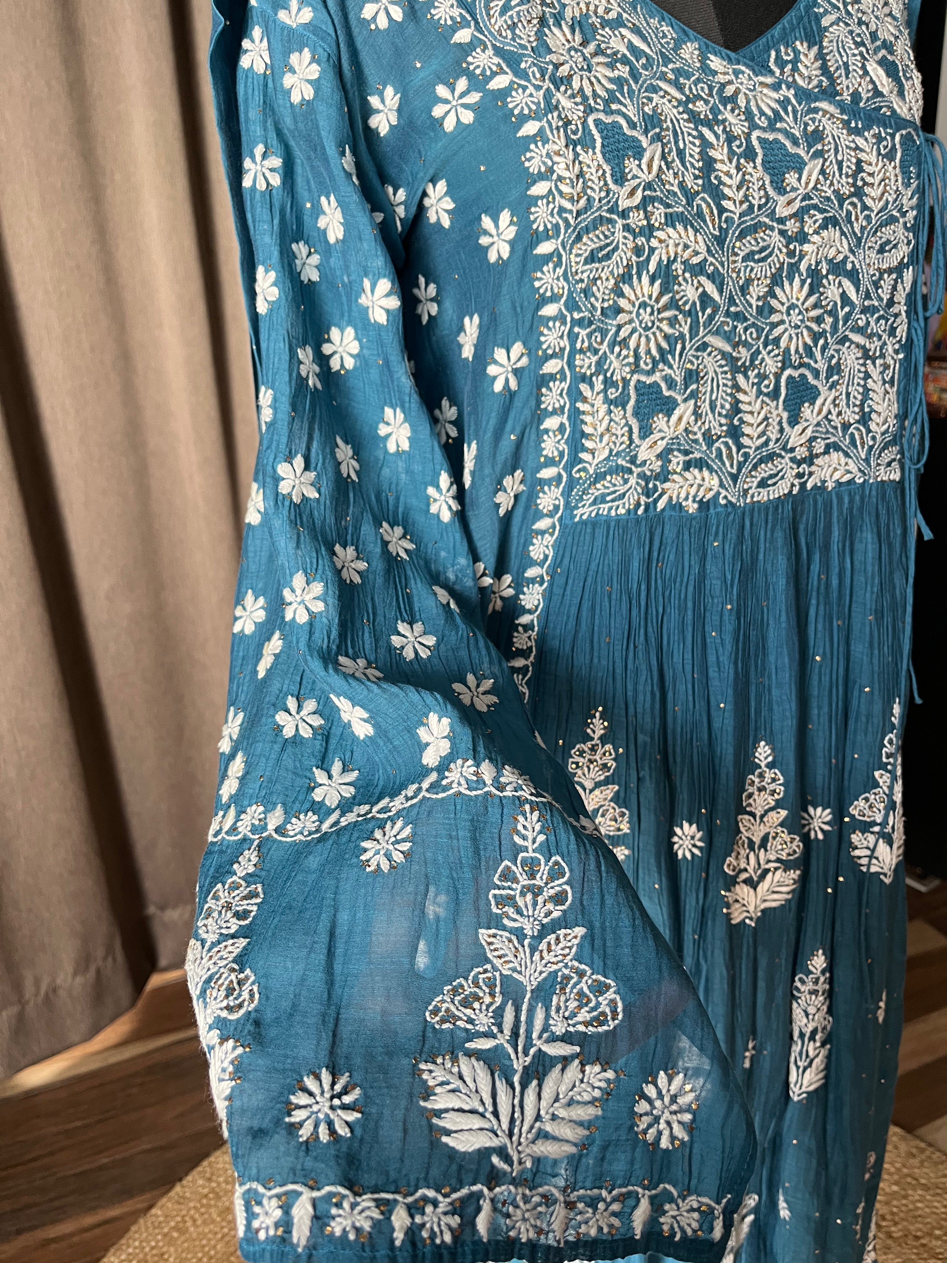 Electric blue colour mal chanderi angrakha suit set with chikankari and mukaish/badla work