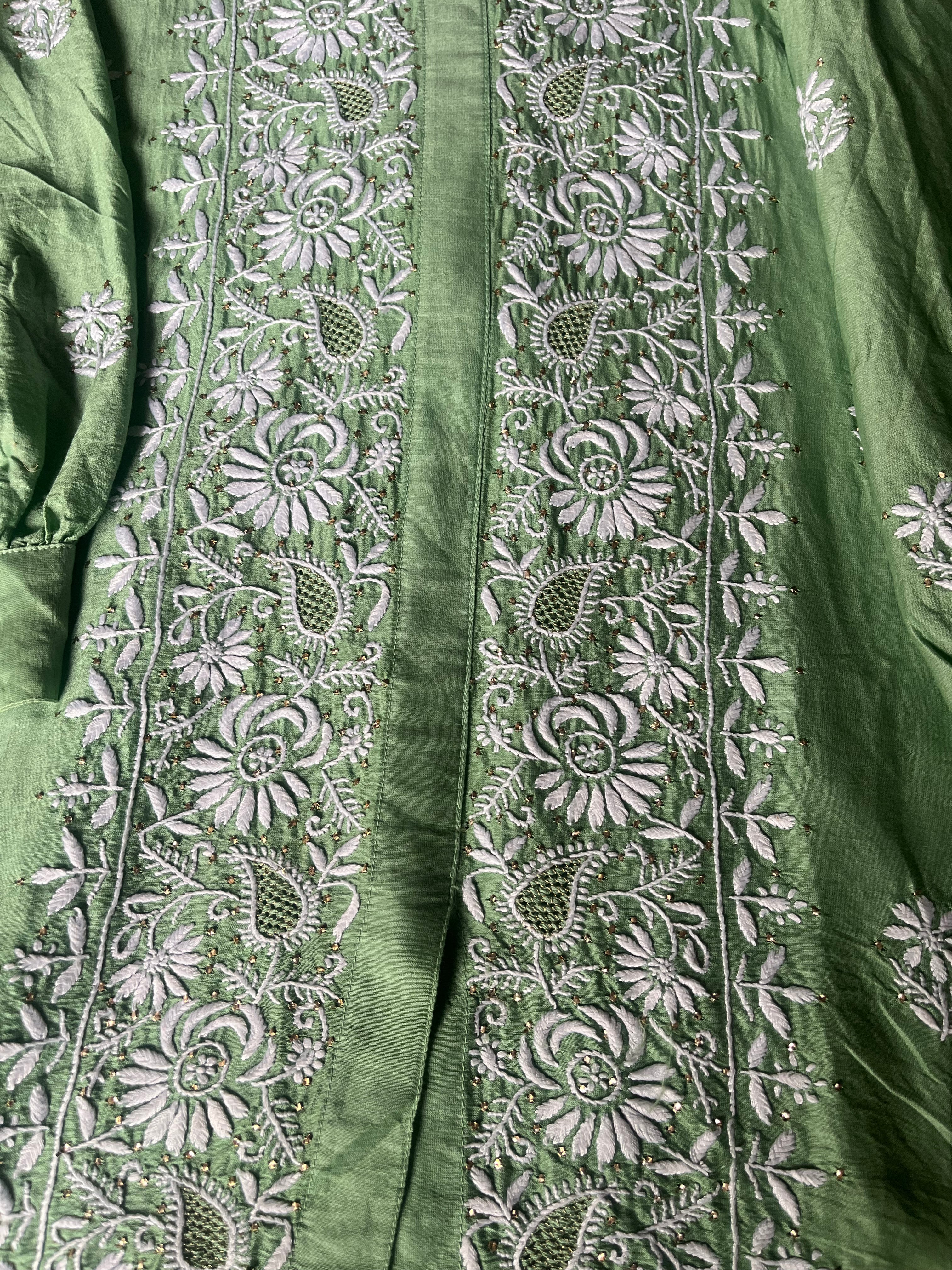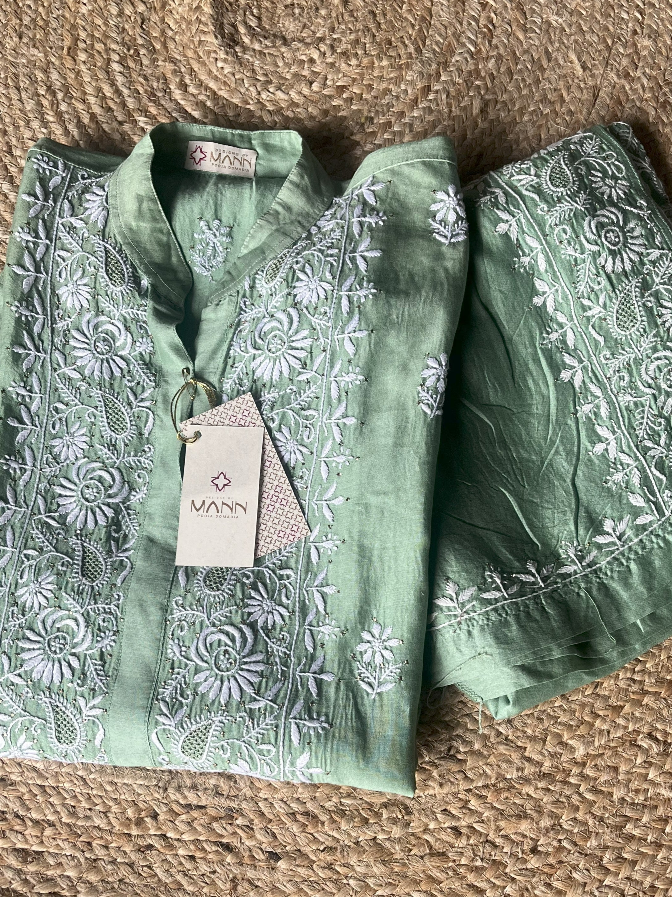 Semi - Stitched Green Colour Chanderi Silk Handcrafted Chikankari Co-ord Set