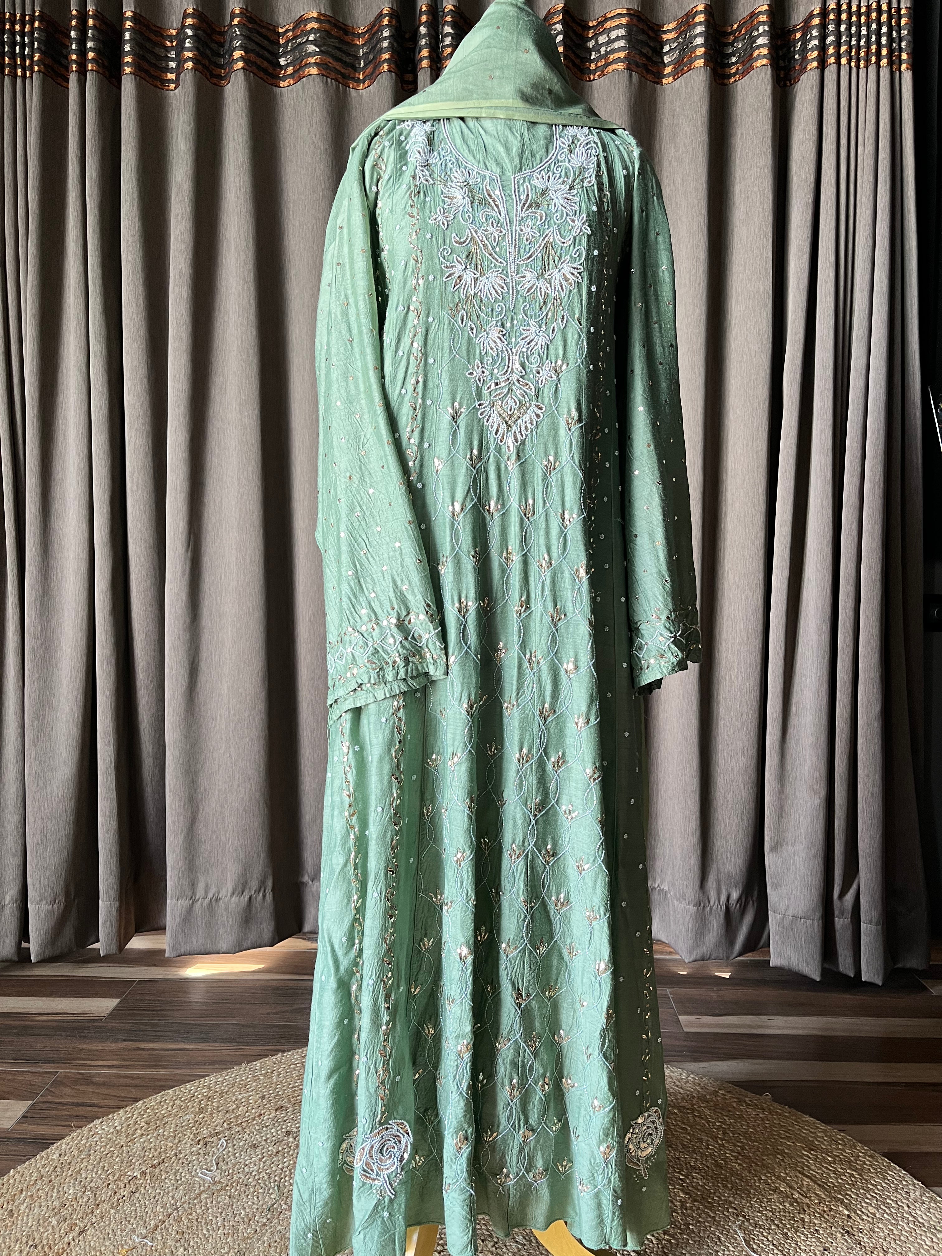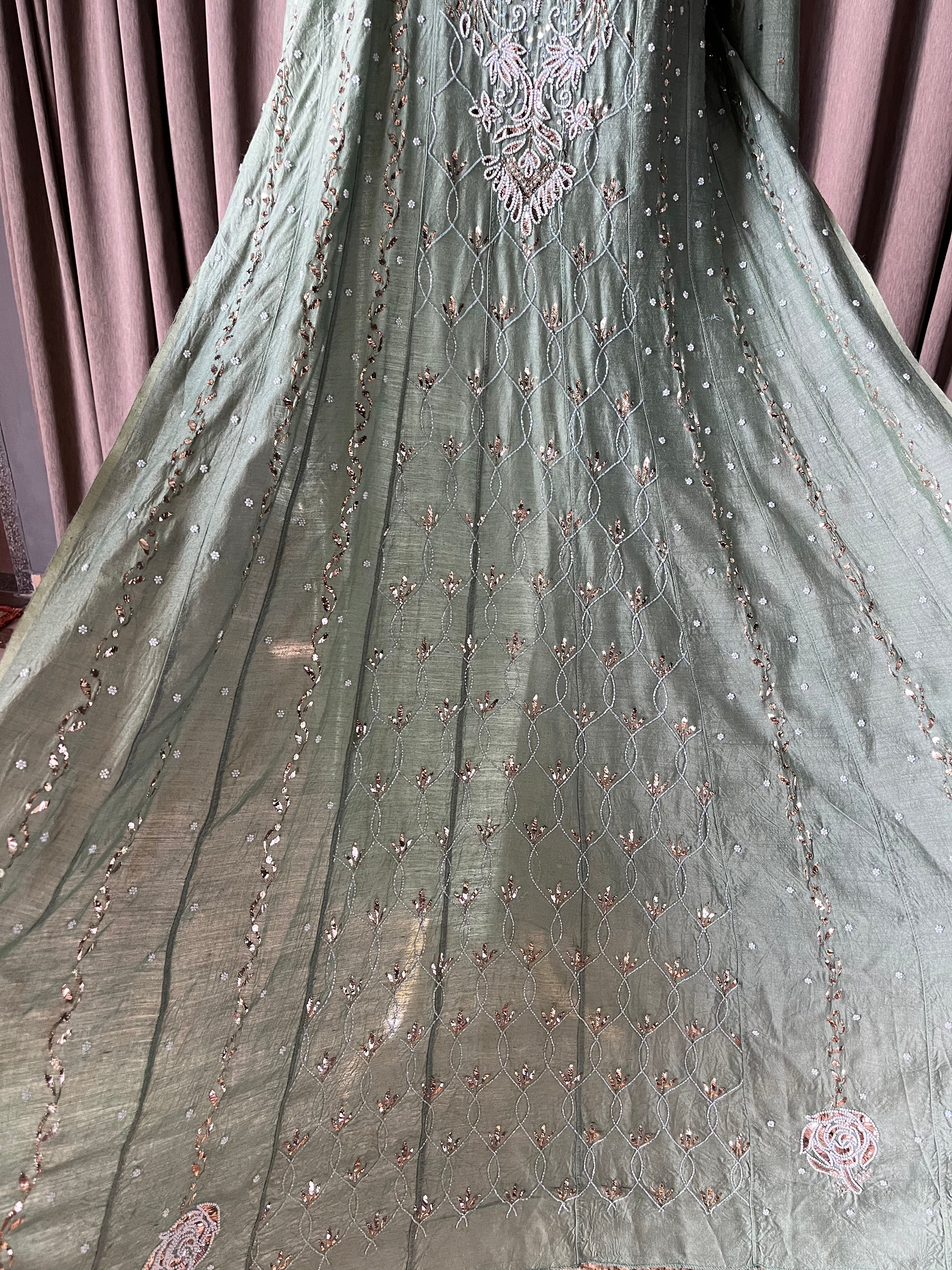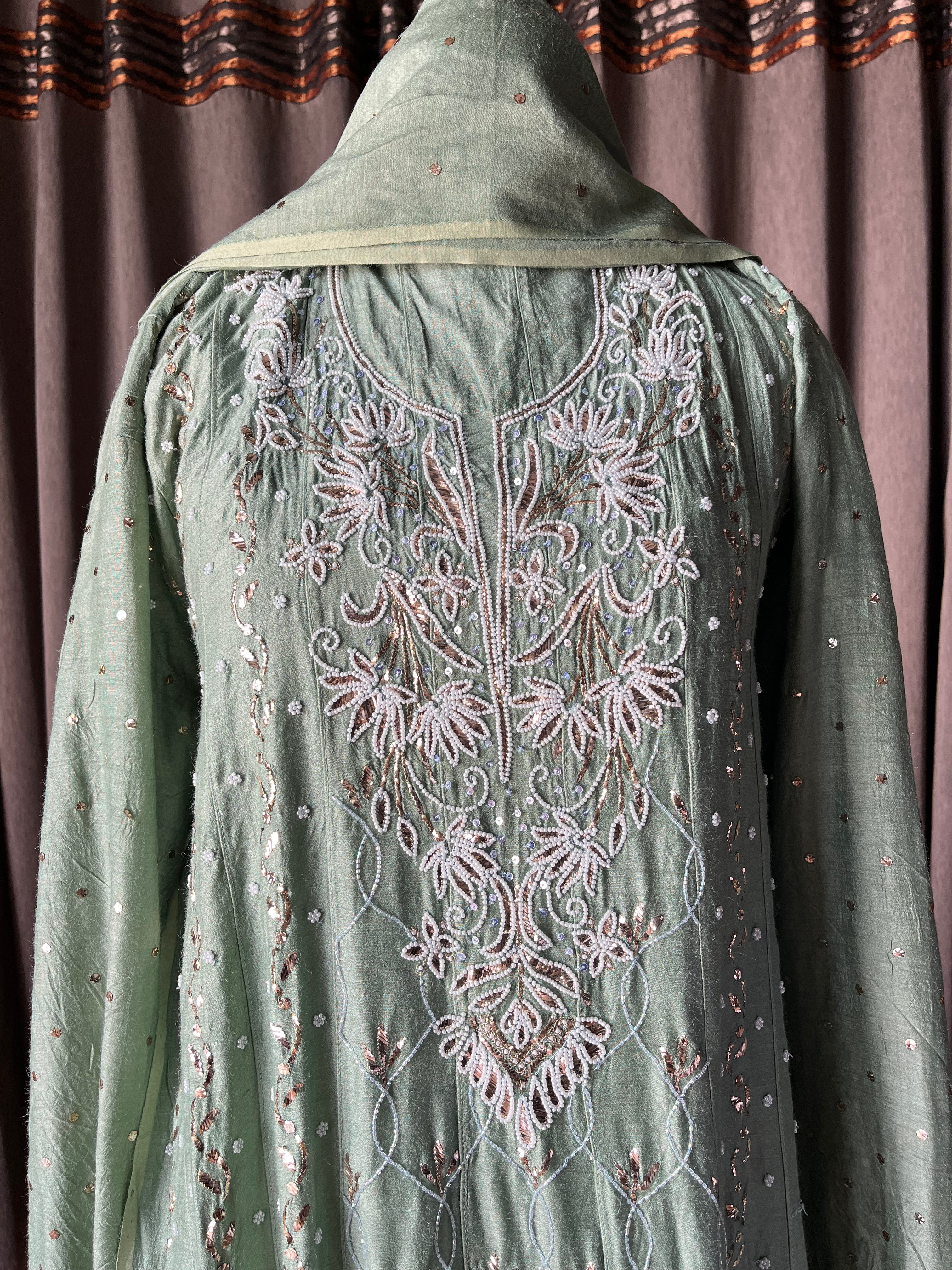 Green Moonga Silk Mukaish/Badla Anarkali with Pearl Cutdana Embellishments