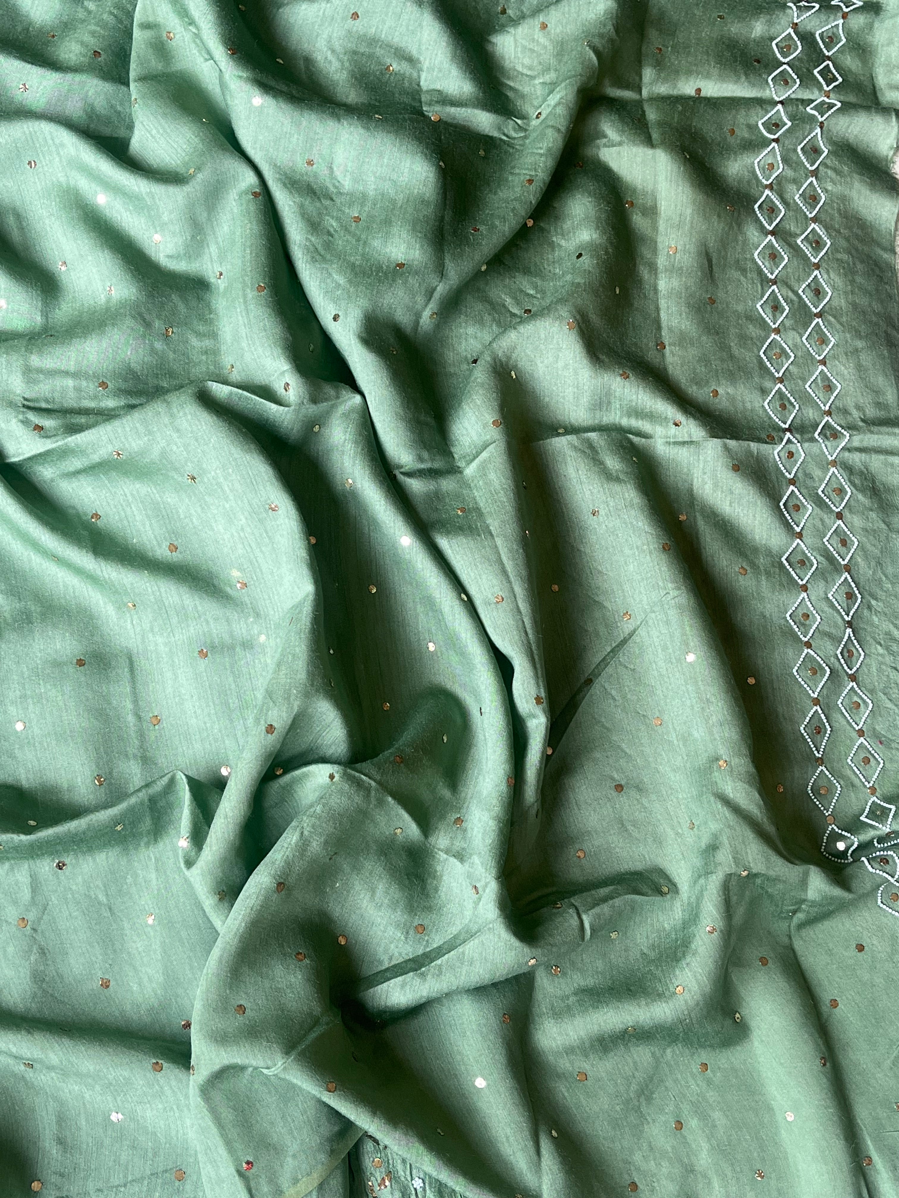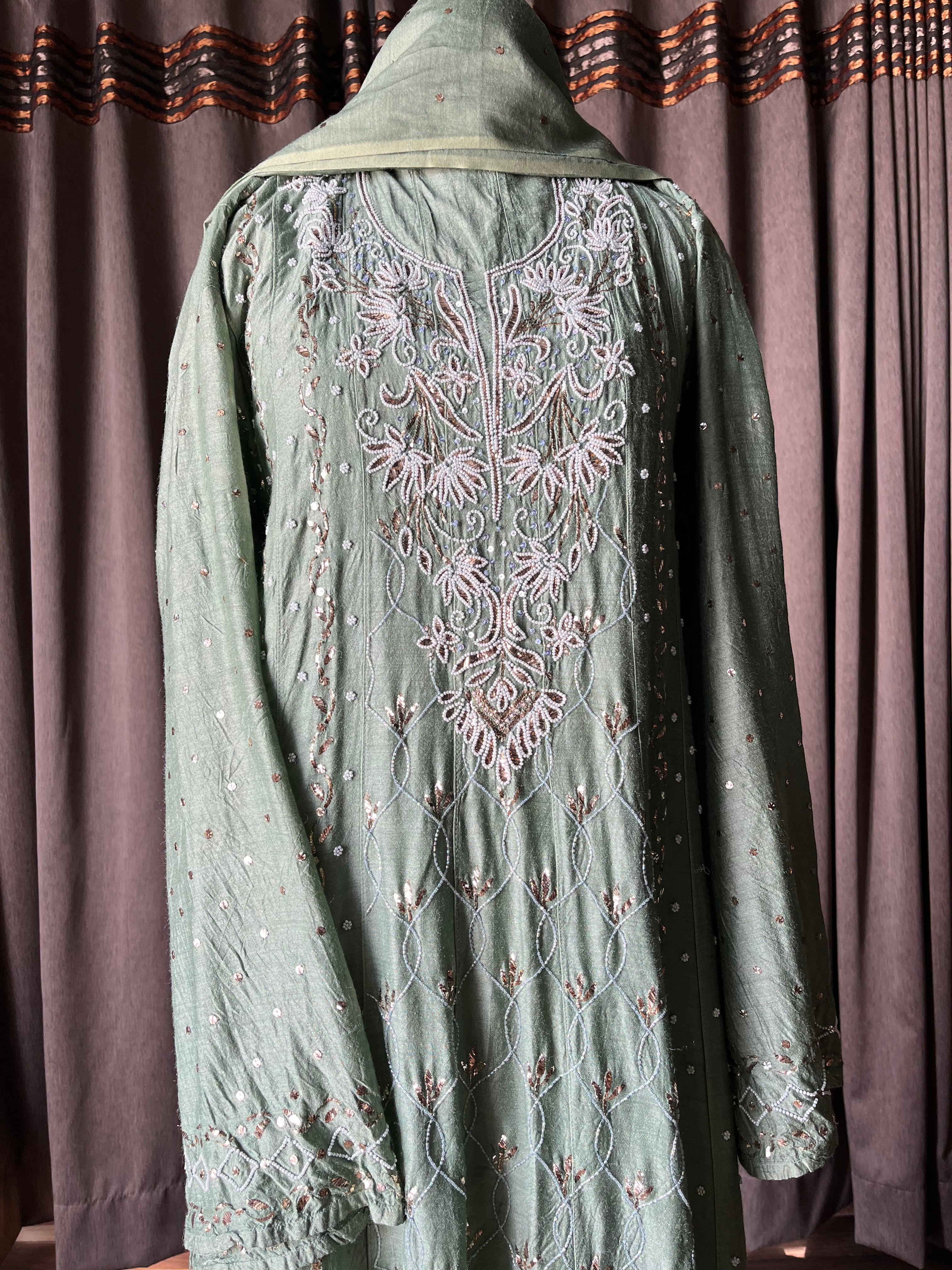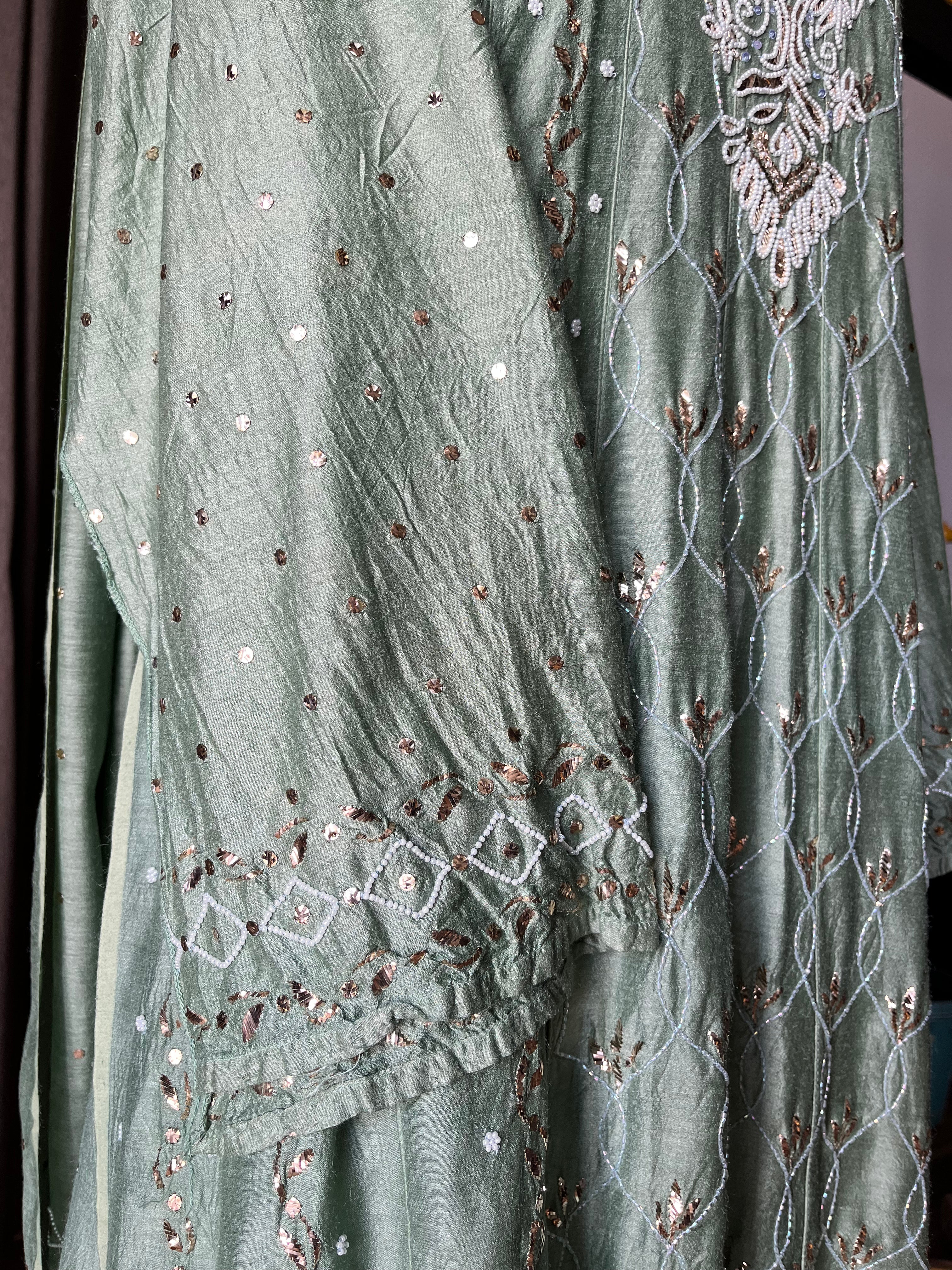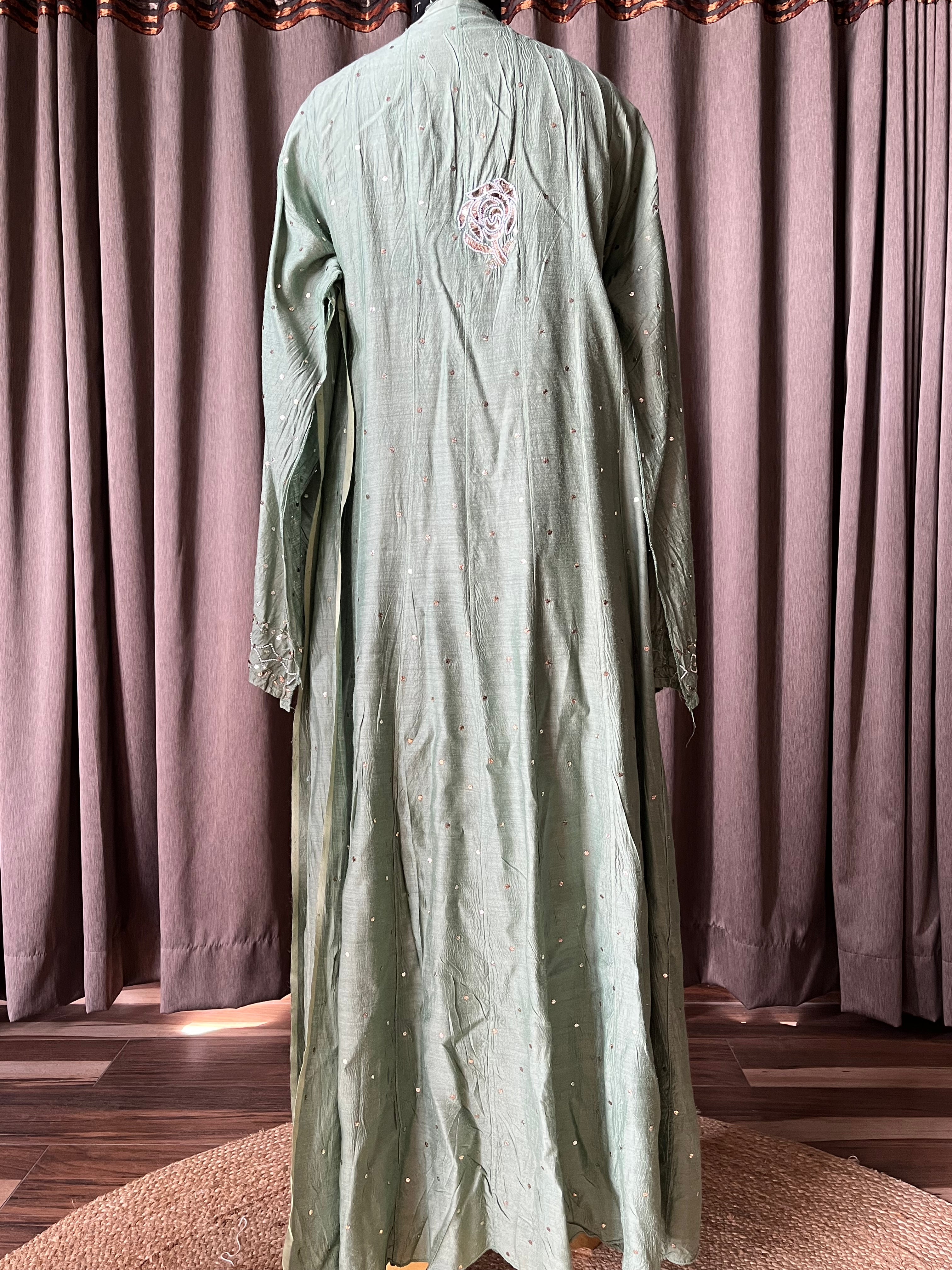 Green Moonga Silk Mukaish/Badla Anarkali with Pearl Cutdana Embellishments