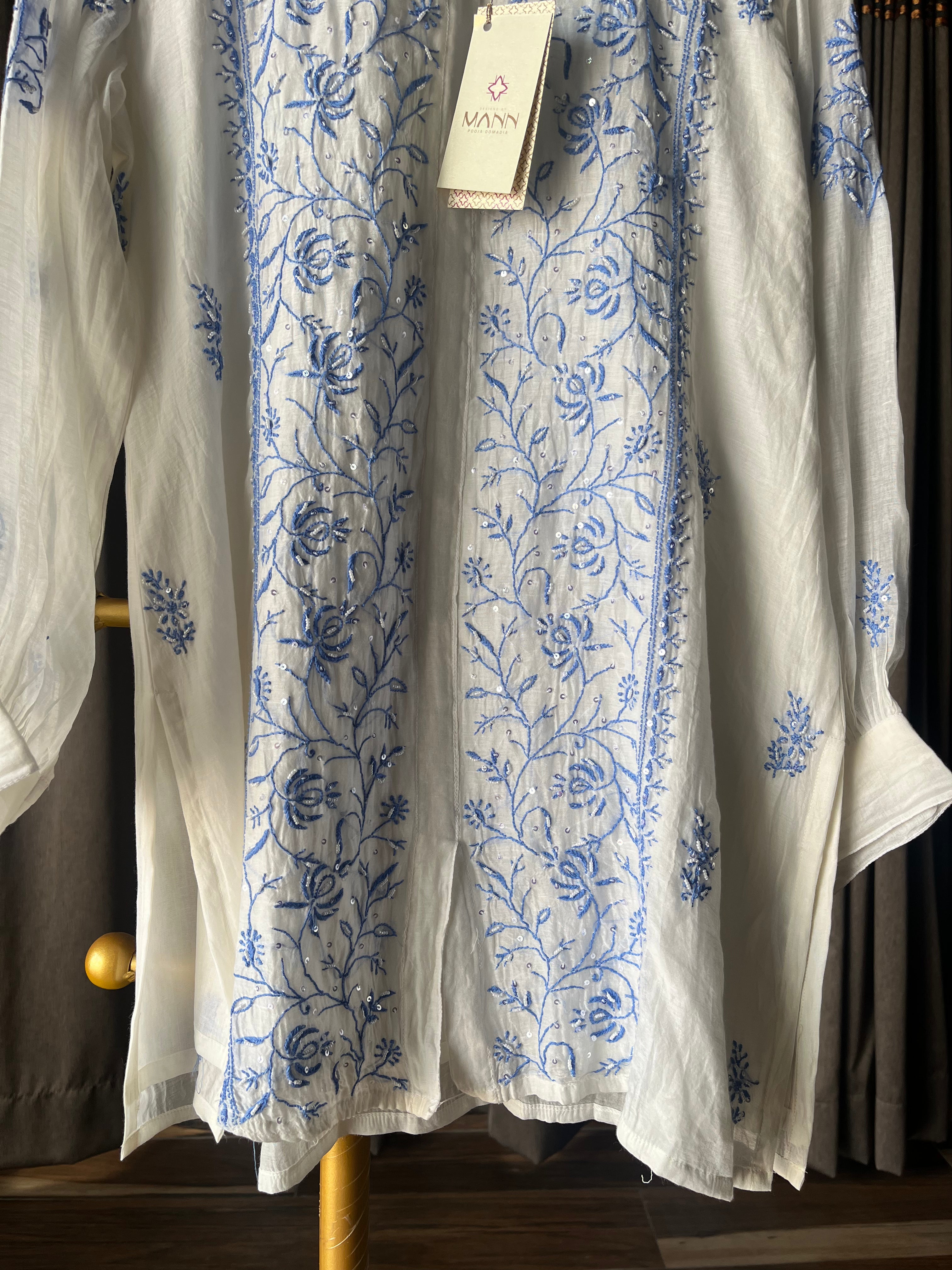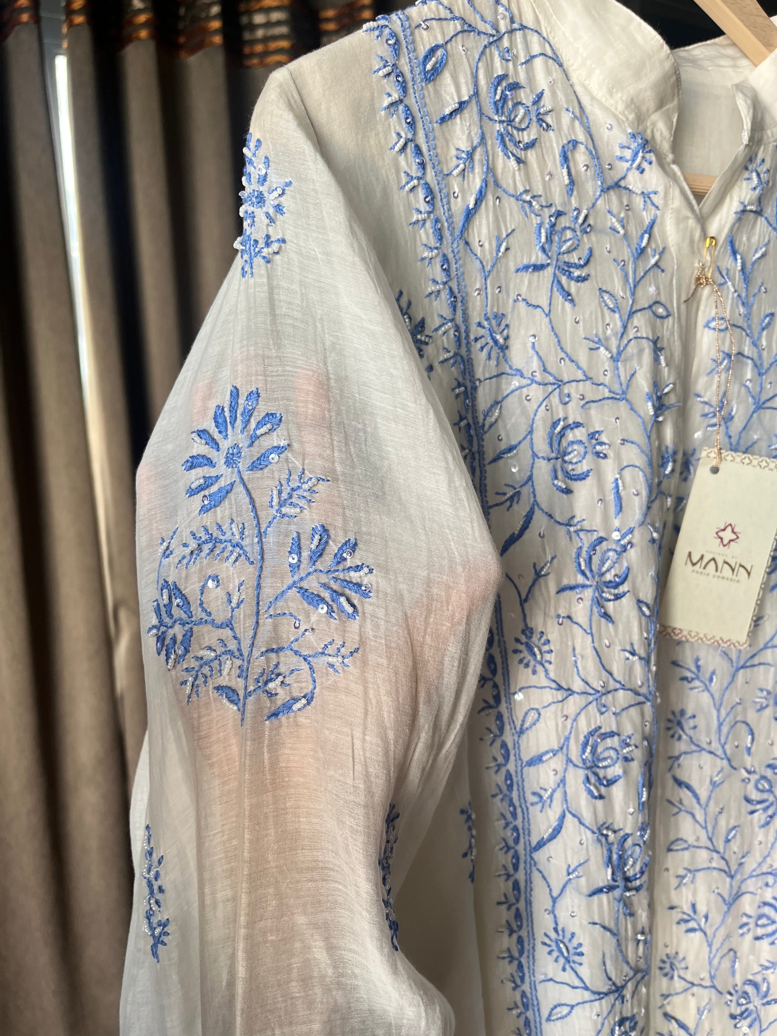 Ivory & blue mal chanderi top with chikankari work & moti/sequins embellishments