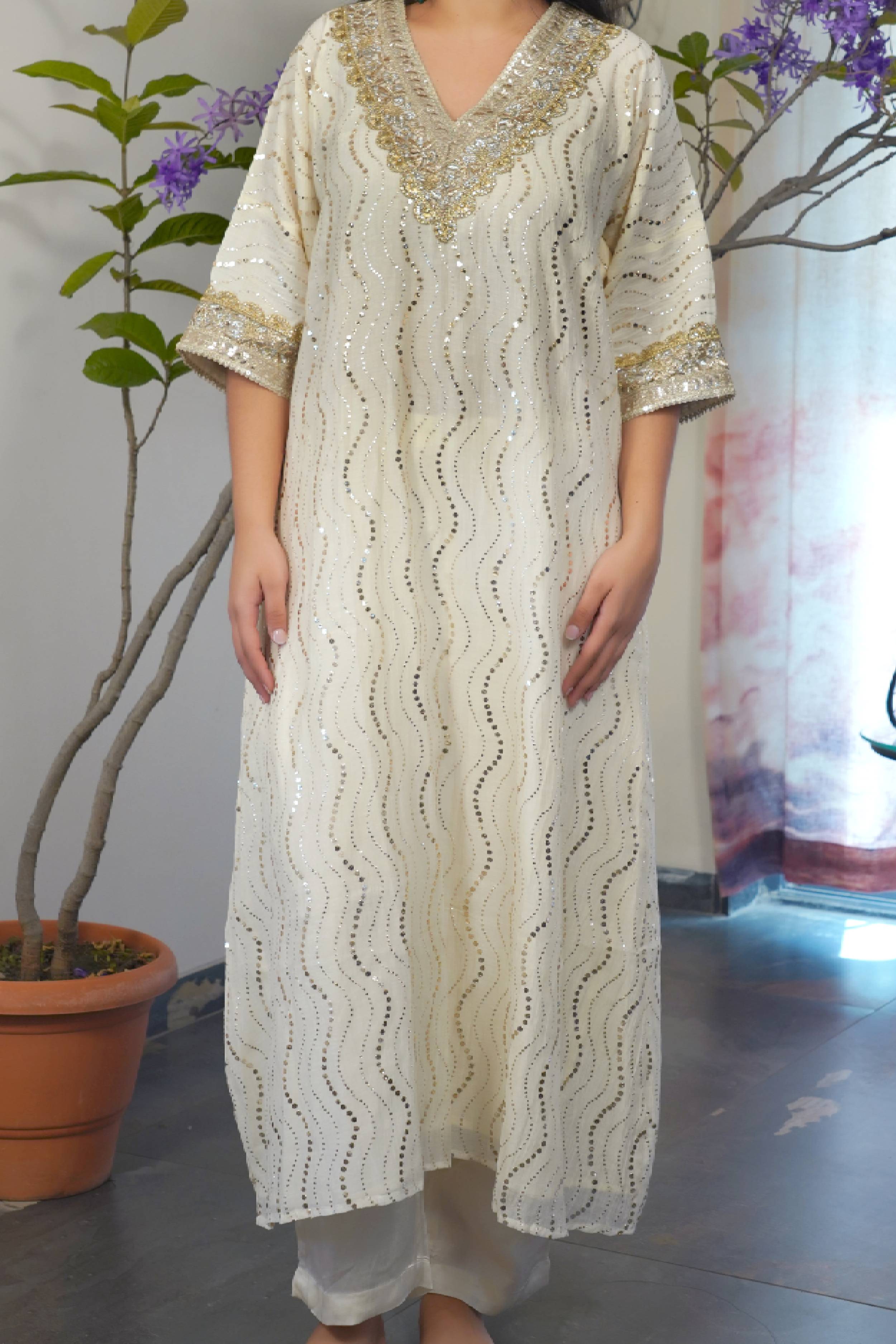 Ivory Pure Georgette Co-ord set suit with mukaish work.