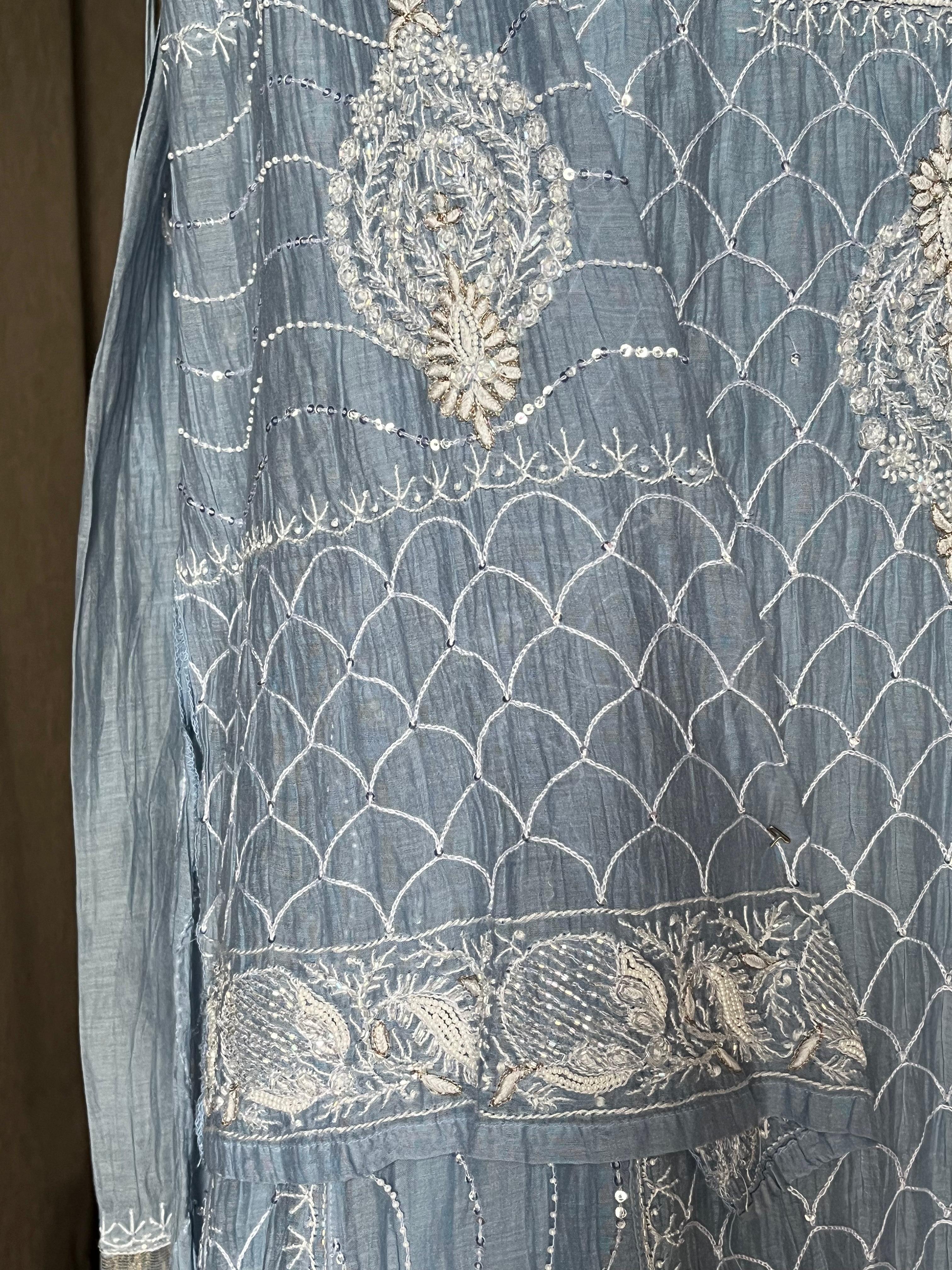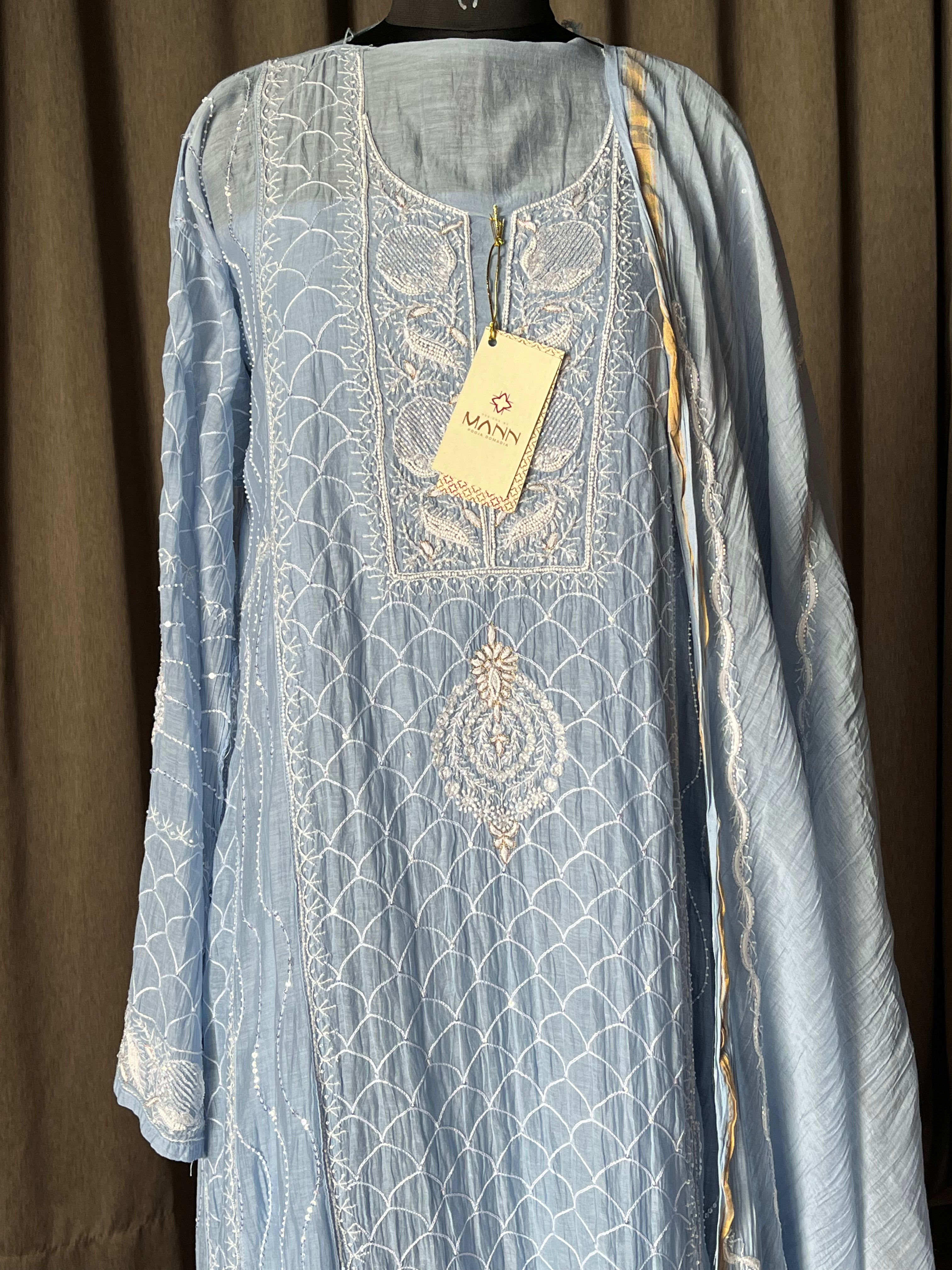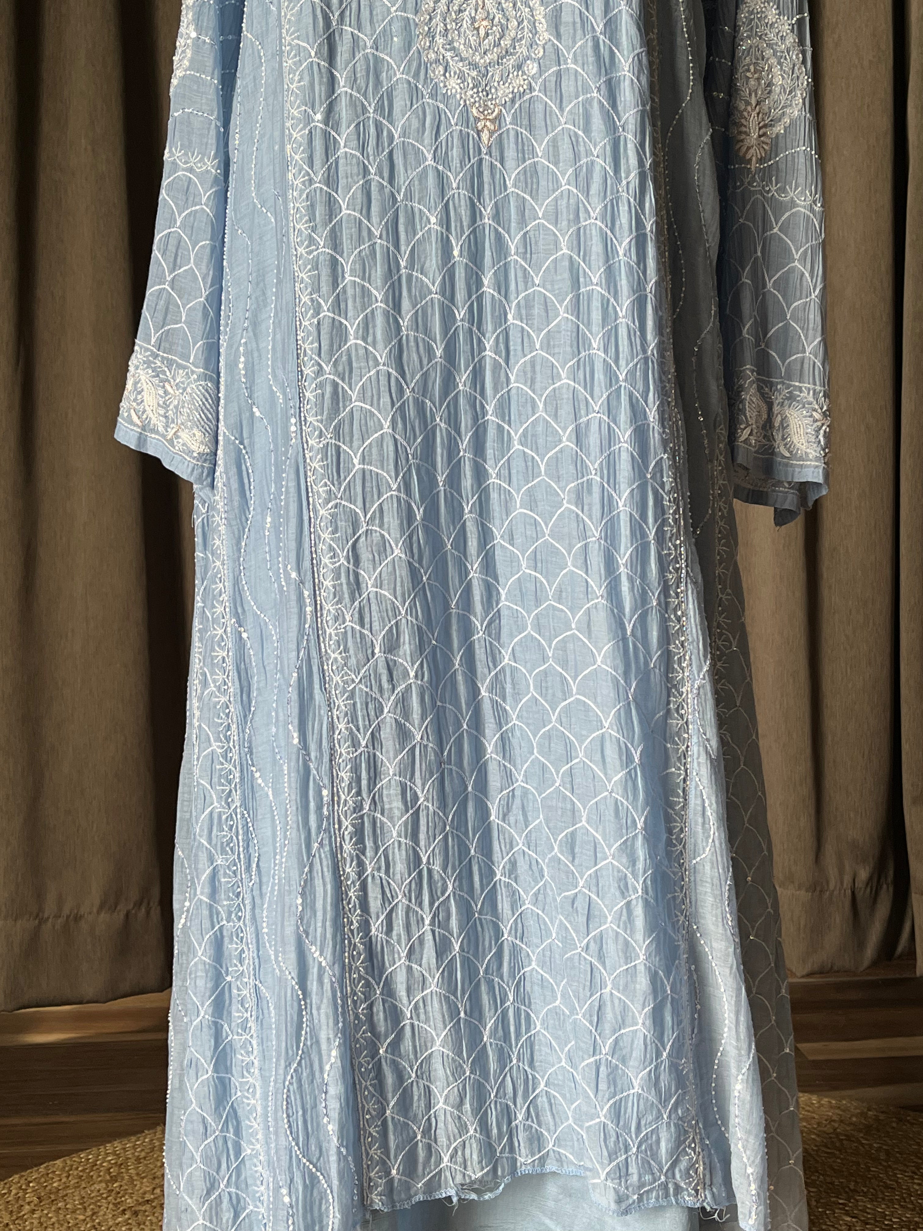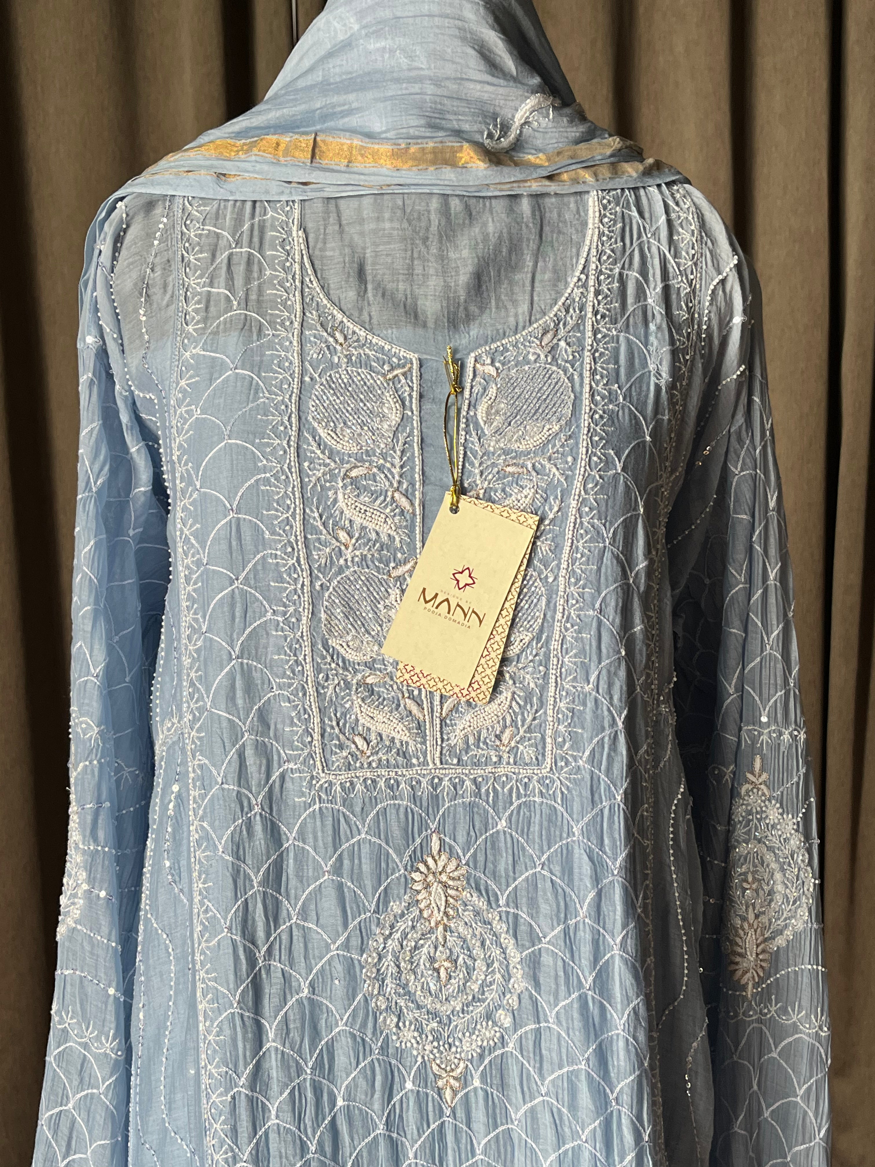 Semi - stitched light Blue colour mal chanderi kalidar kurta/suit set with chikankari work and Moti, cutdana & sequins embellishments