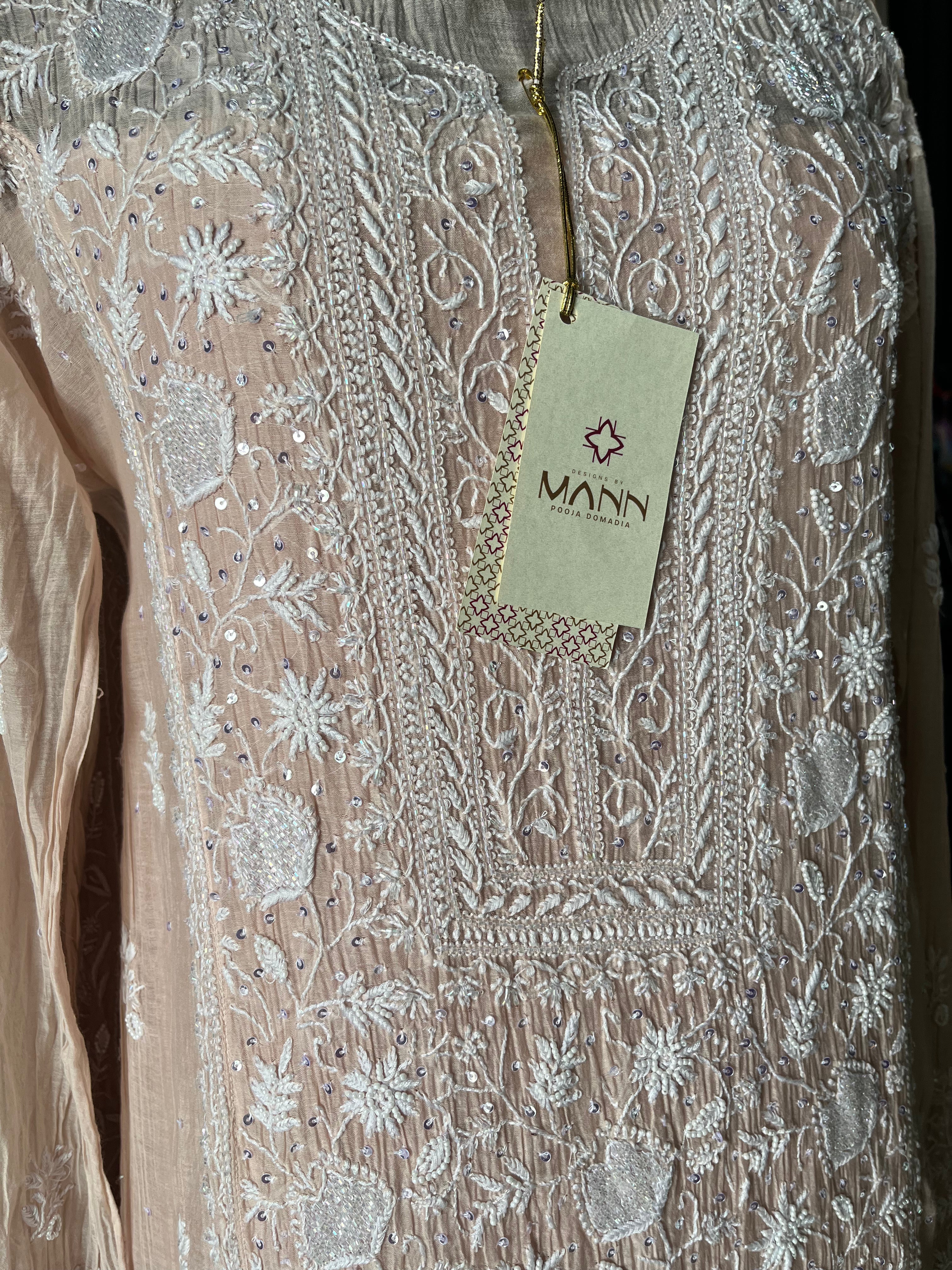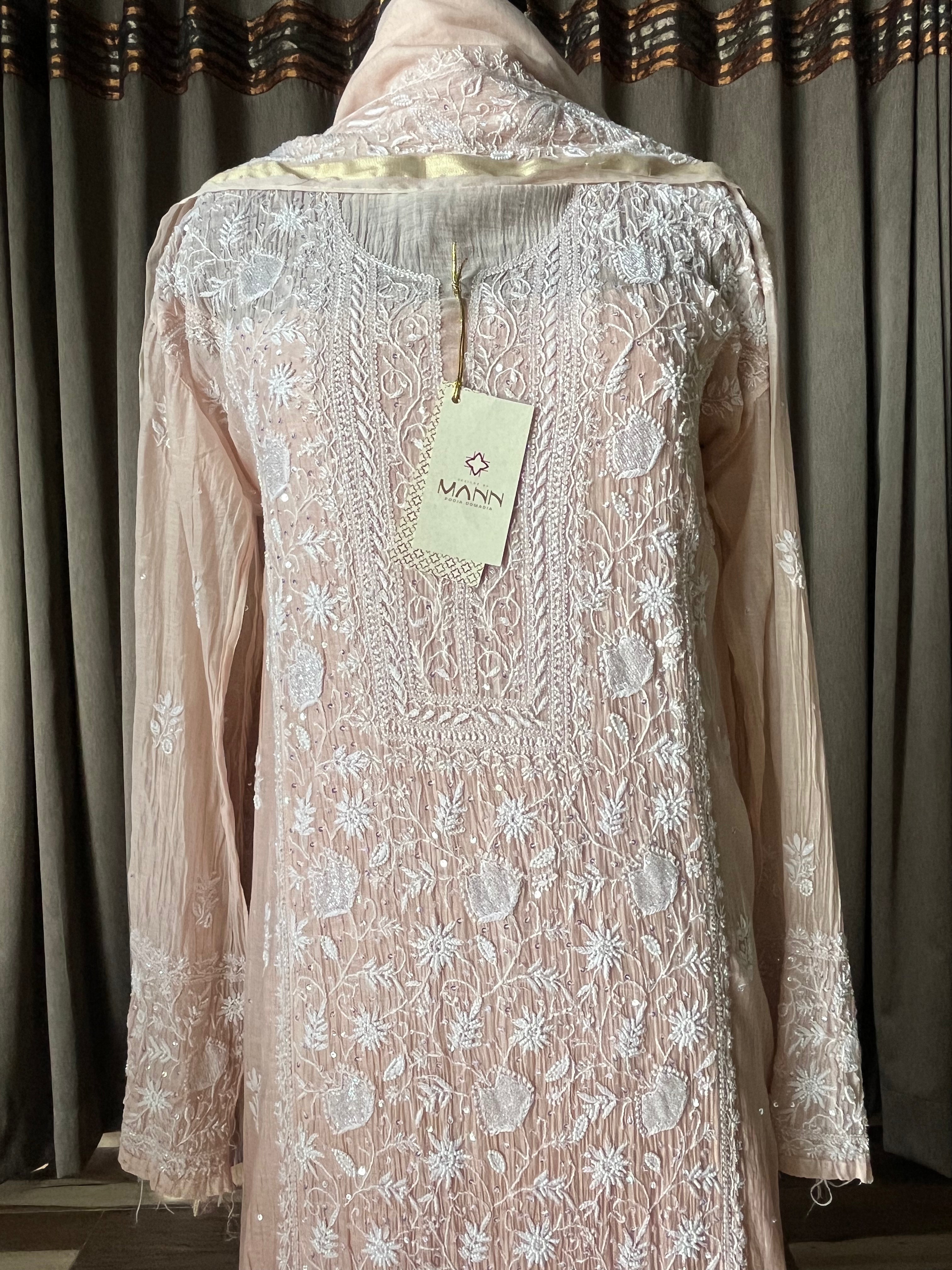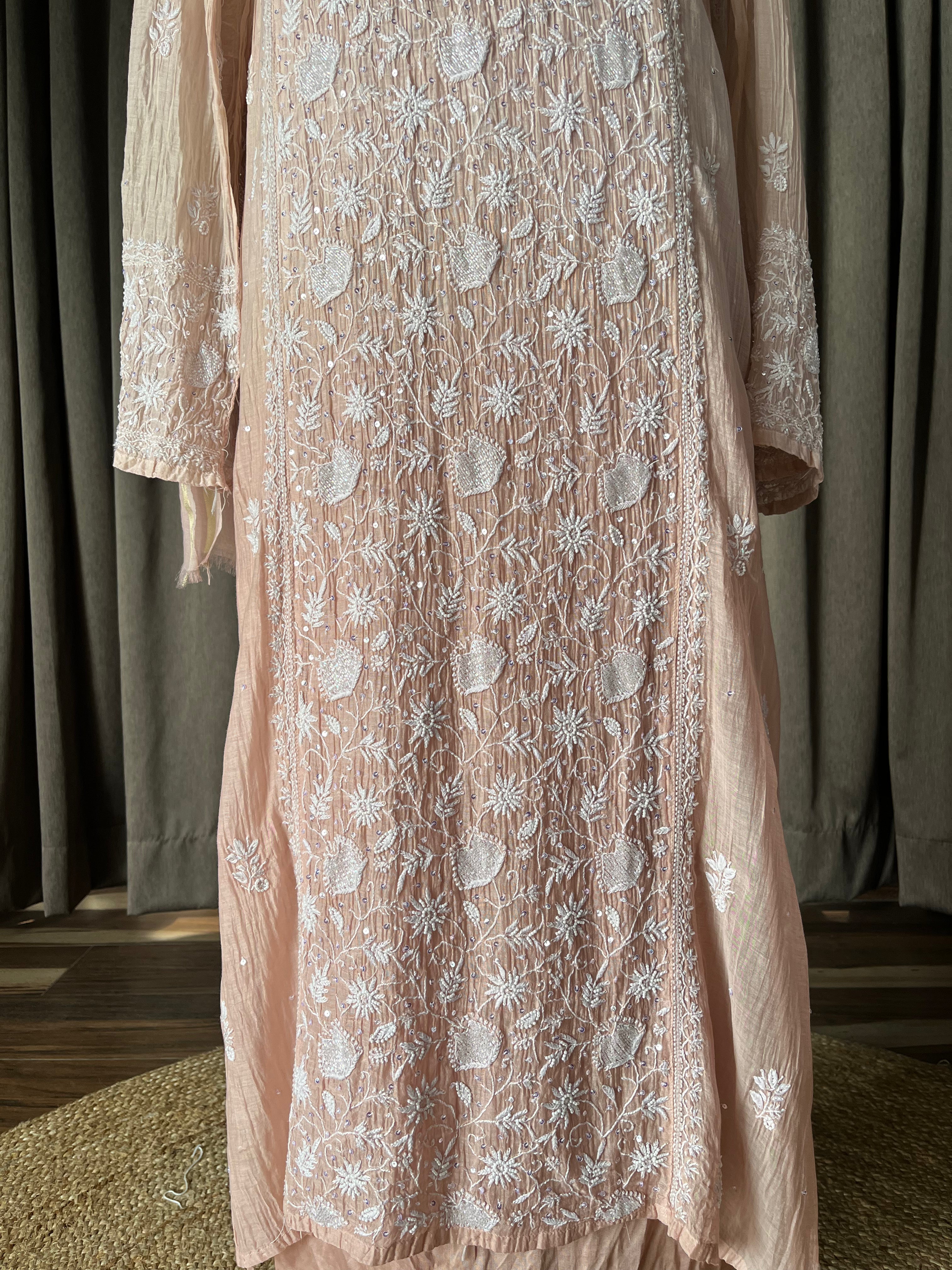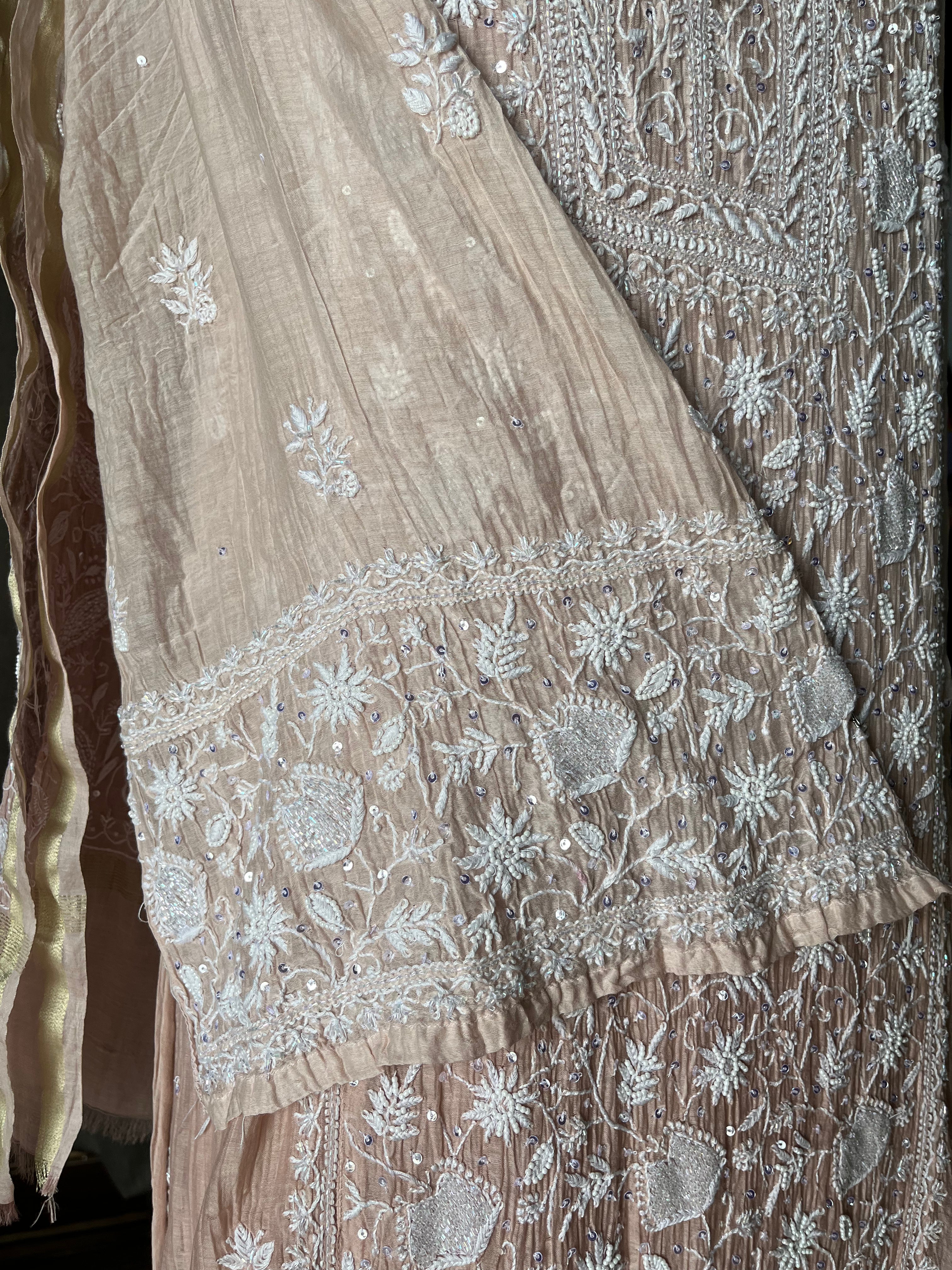 Light brown-peach ombré colour mal chanderi suit set with handcrafted chikankari and moti, cutdana & sequins embellishments.