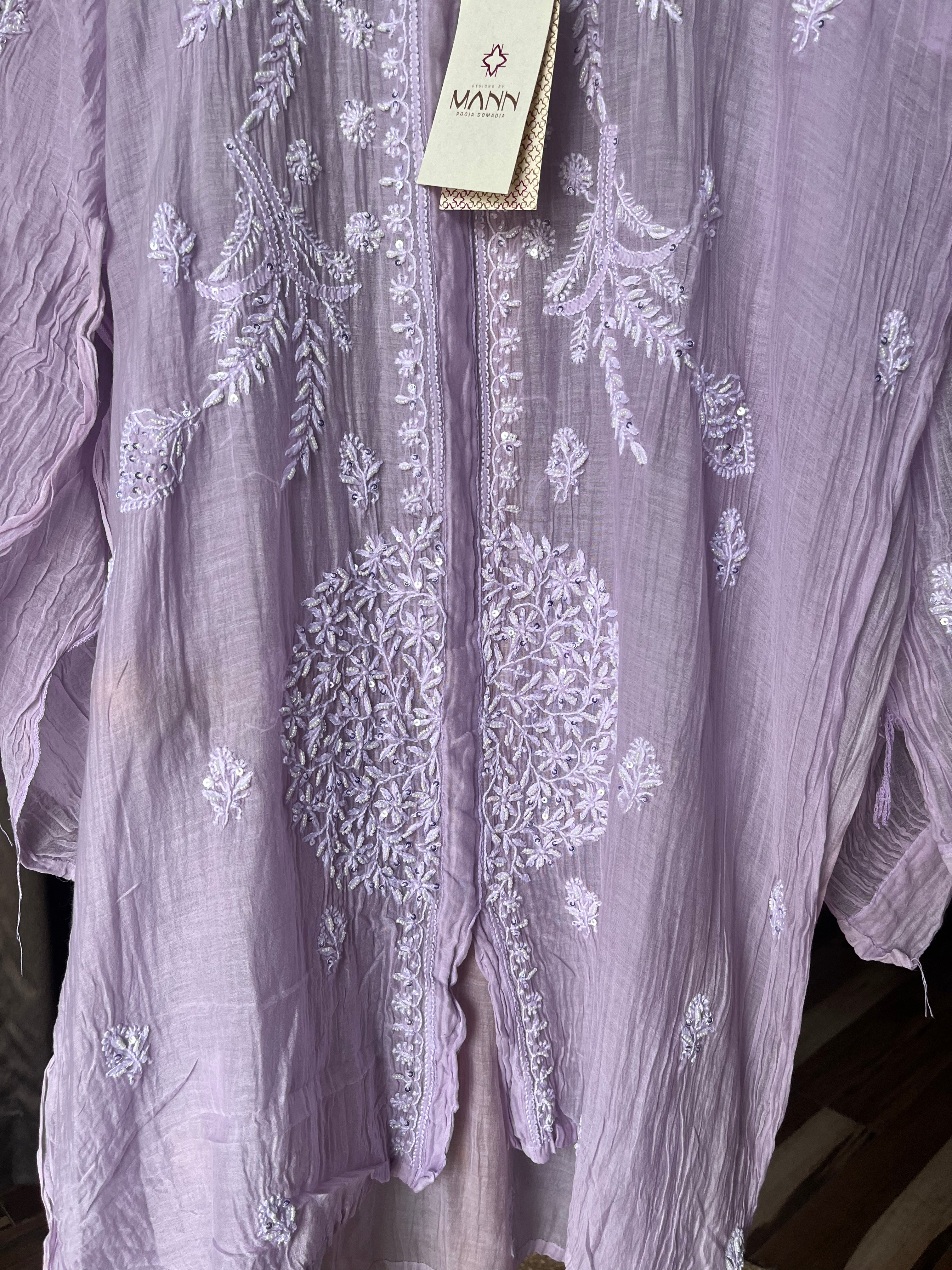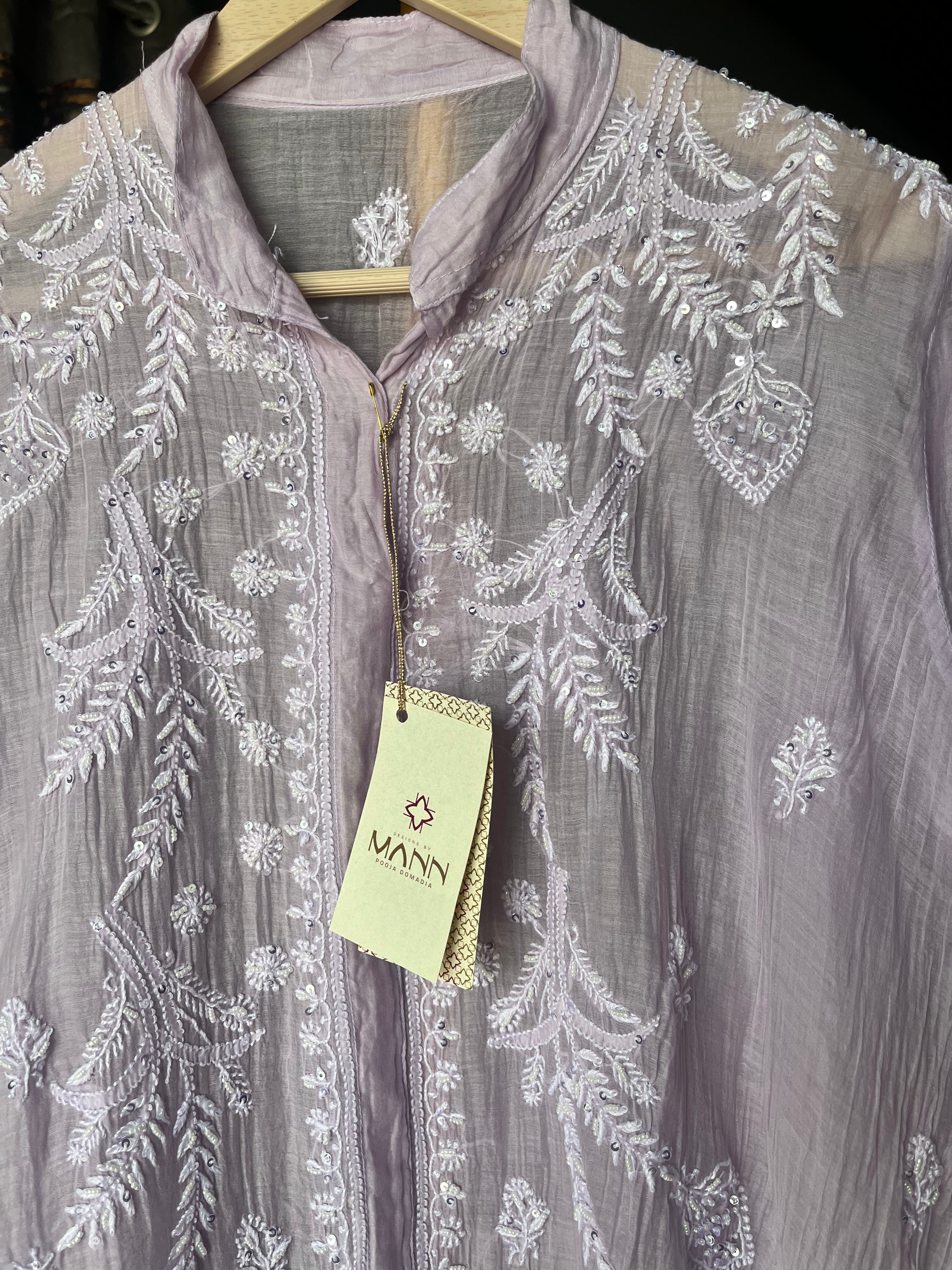 Lilac Mal Chanderi Chikanakri Shirt Top with Chikan & Pearl Cutdana Work