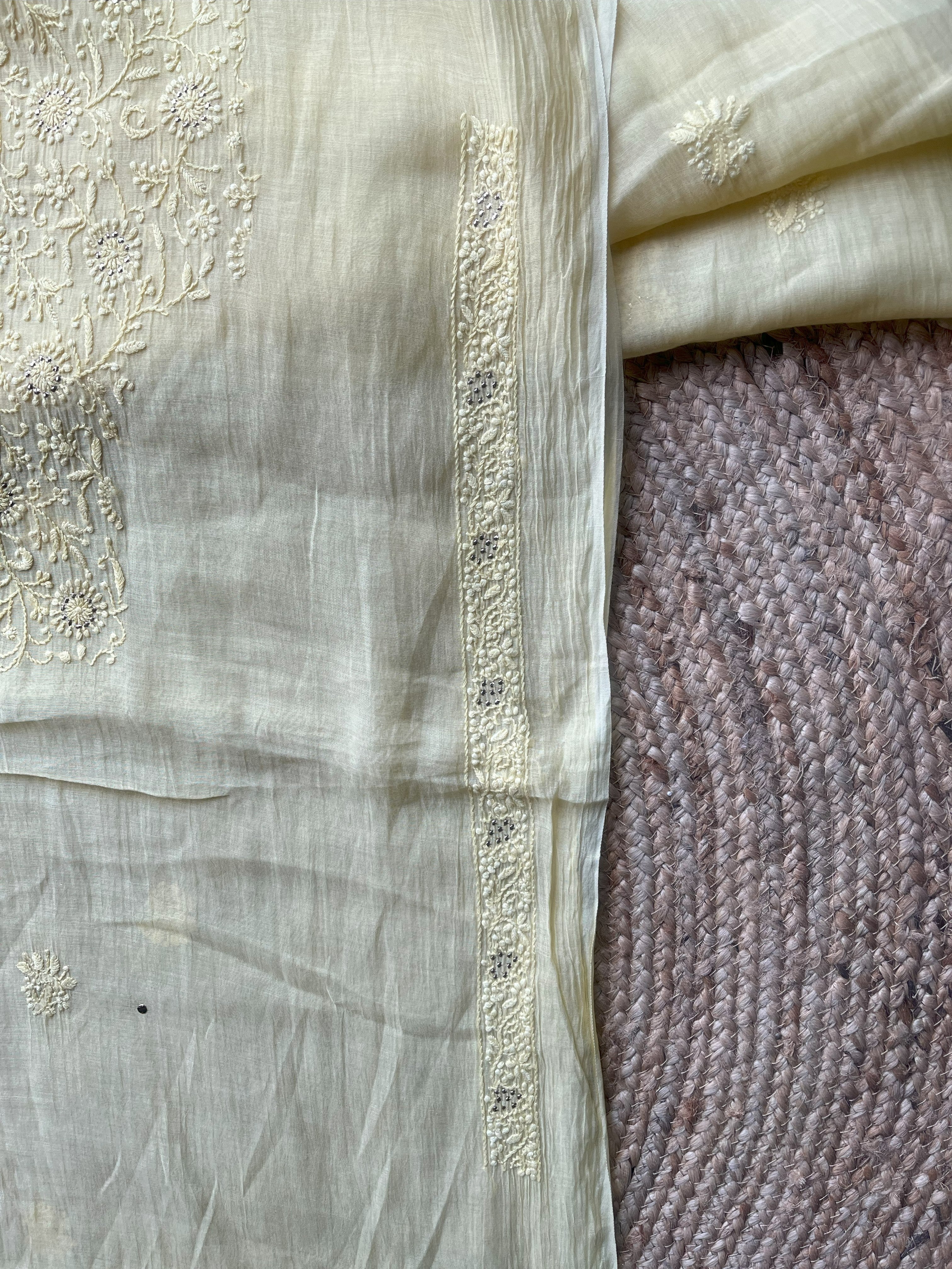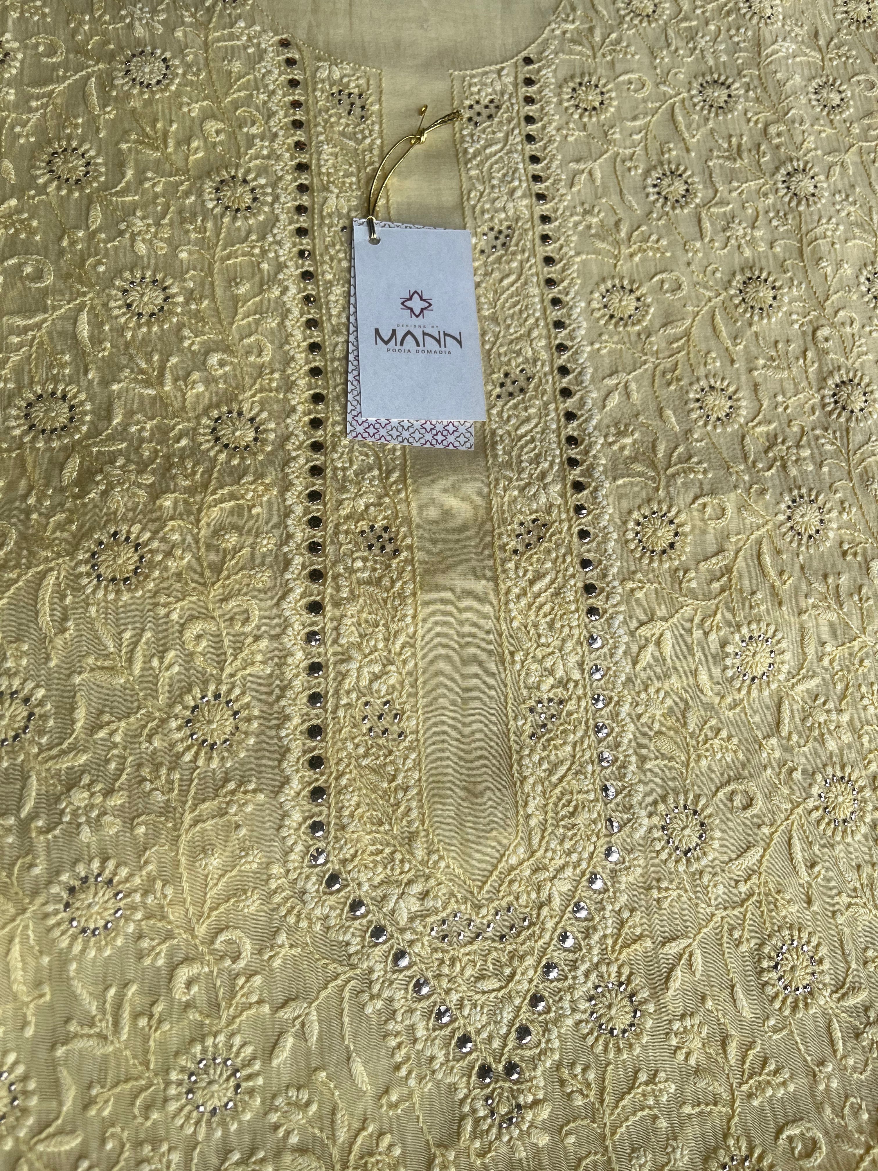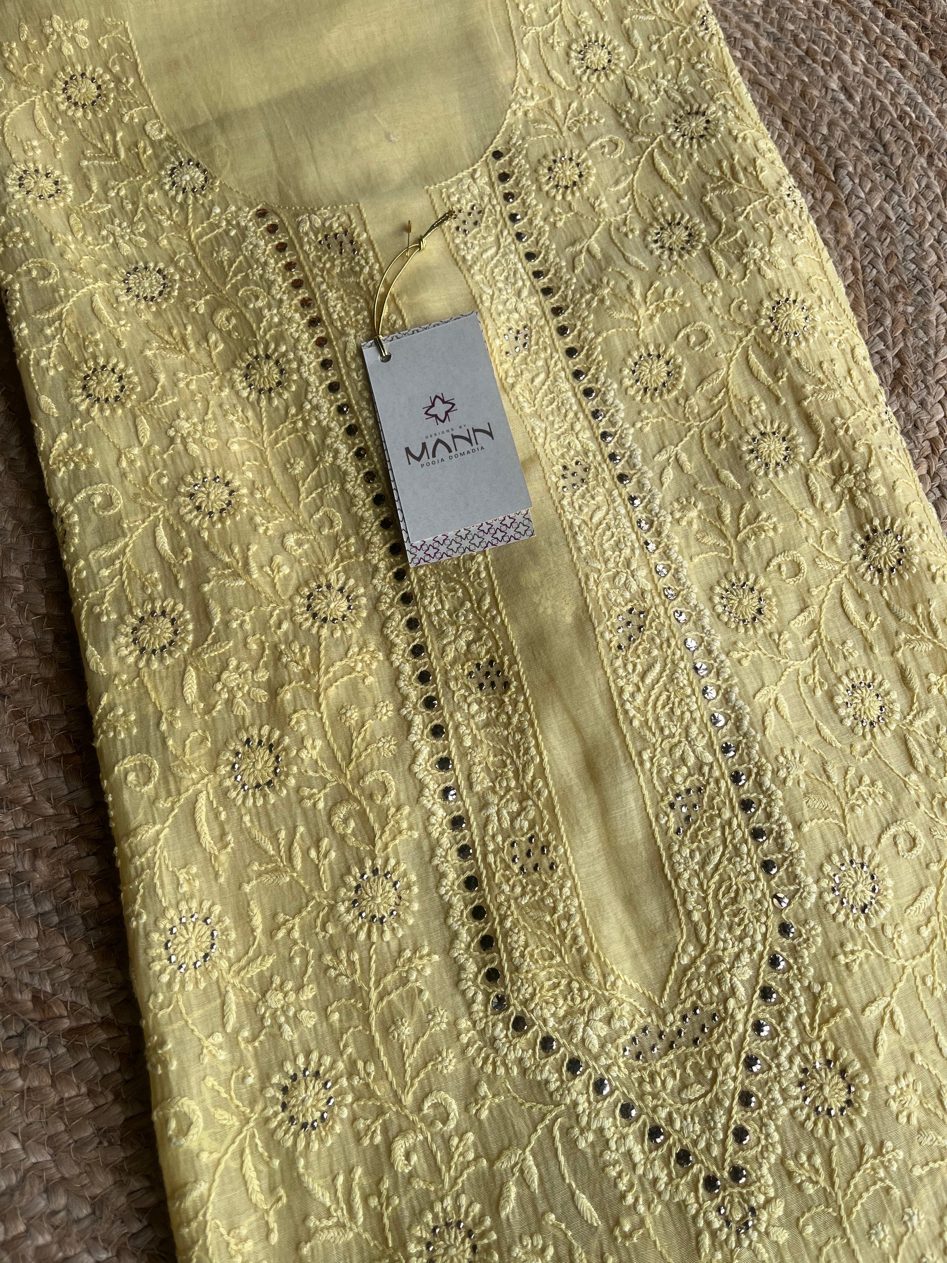 Lime yellow mal chanderi men's kurta fabric with intricate chikankari & Mukaish/badla embroidery