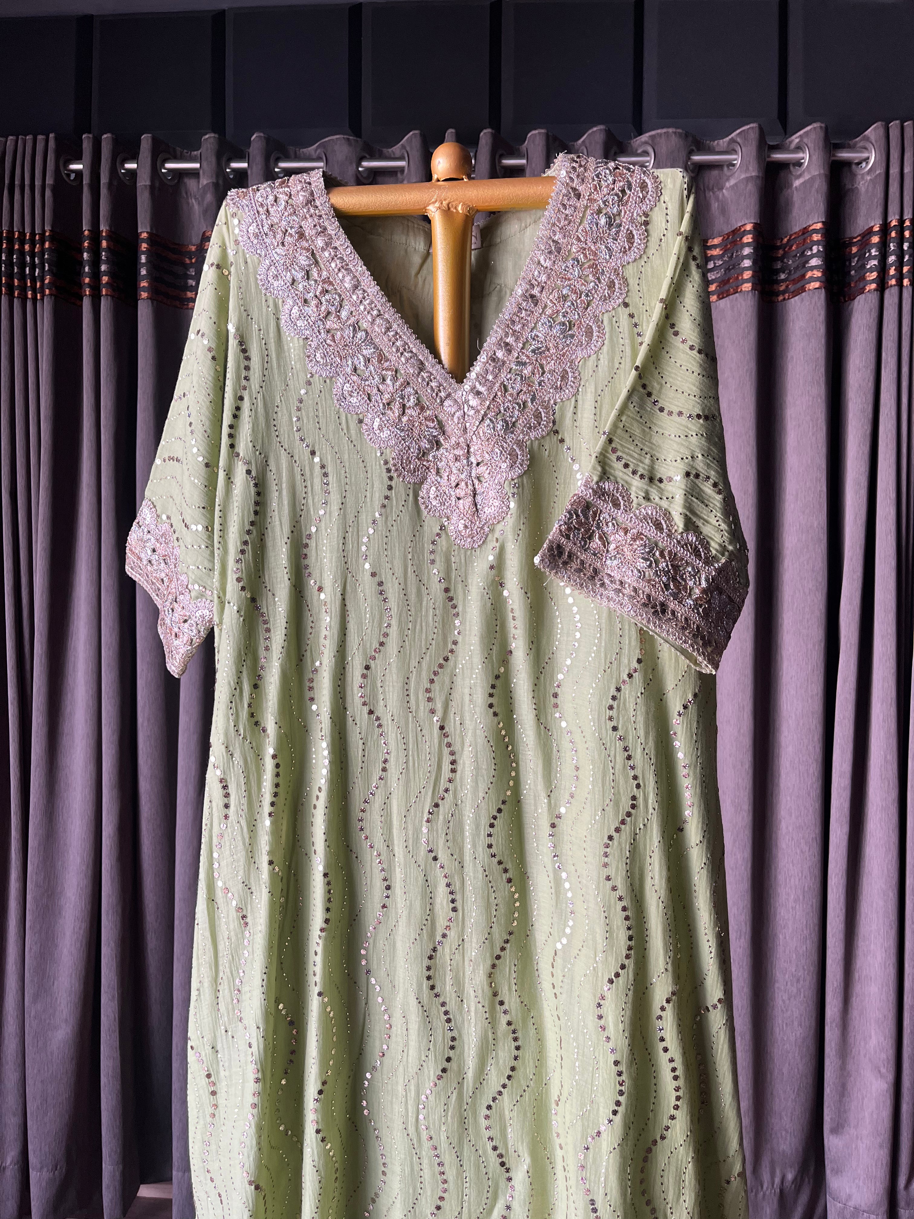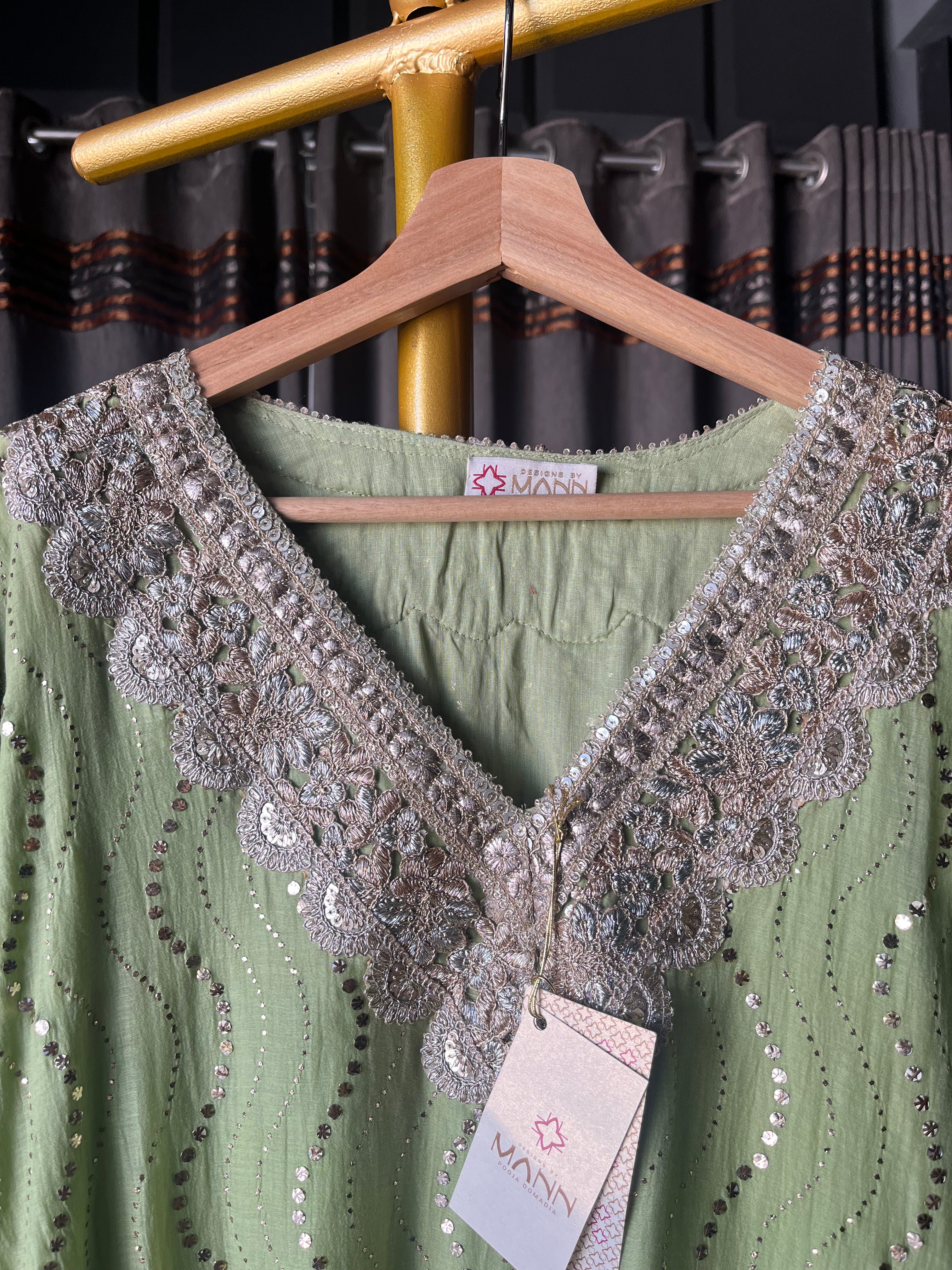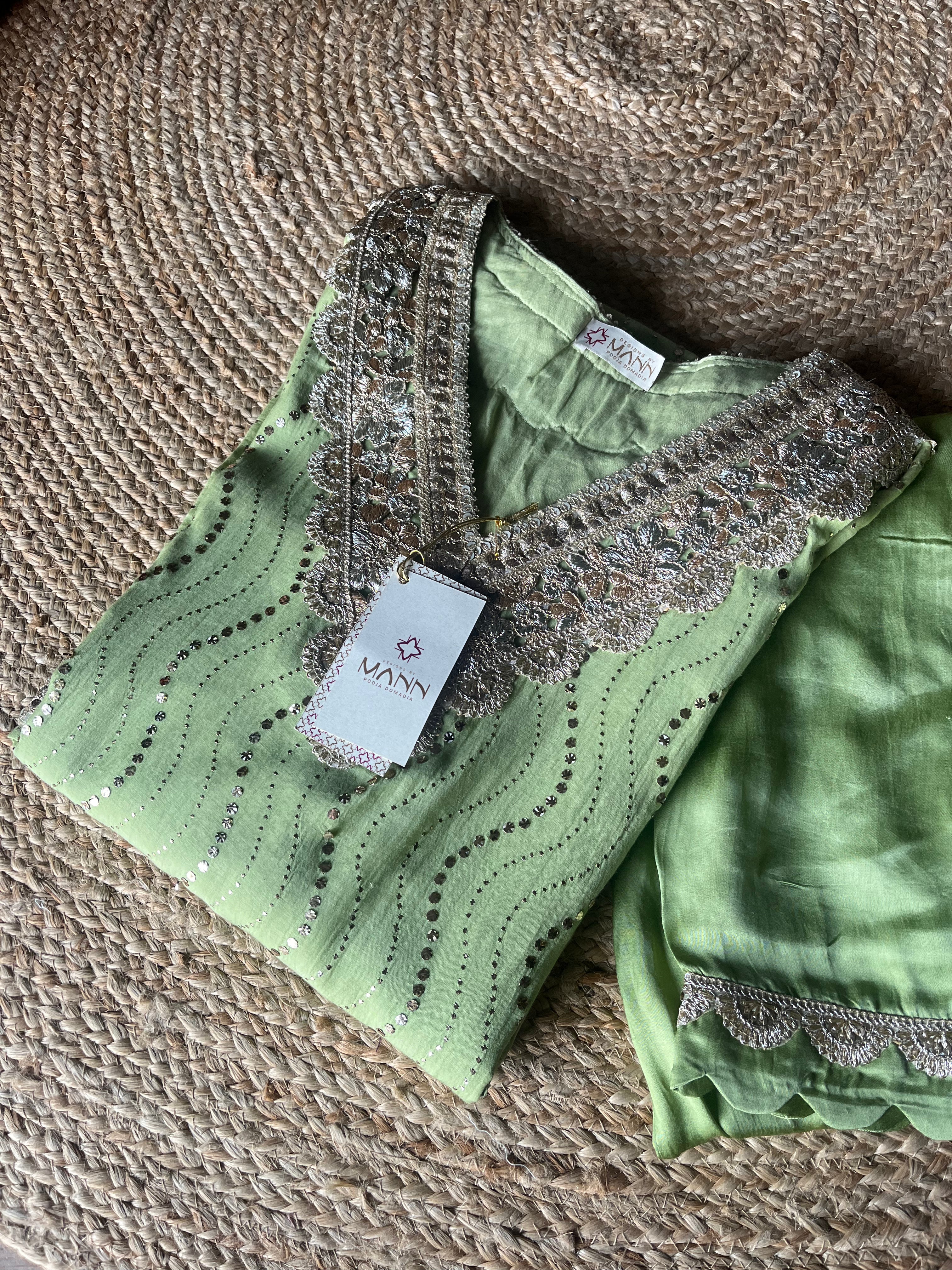 Mint green colour mal chanderi heavy mukaish/badla co-ord suit set with heavy gota on neckline & sleeves with pockets in kurta