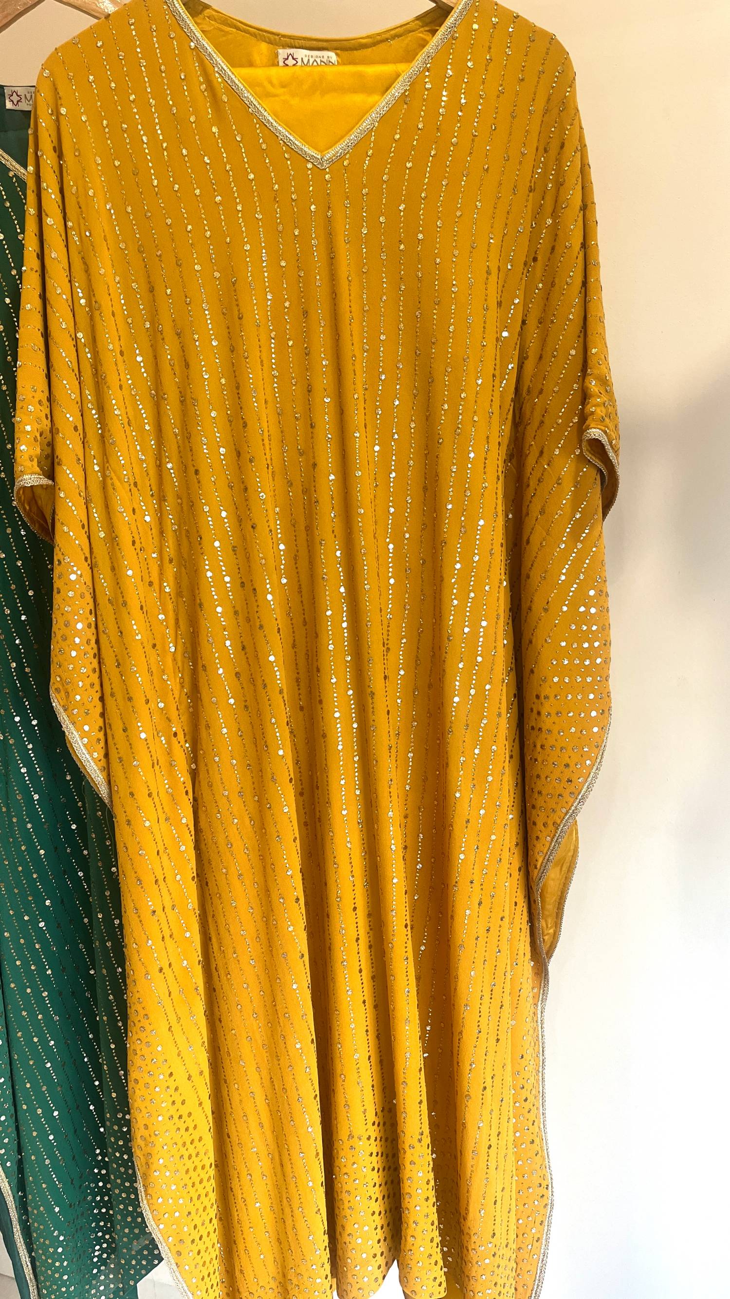 Mustard Yellow Pure Georgette Kaftaan with Mukaish work.