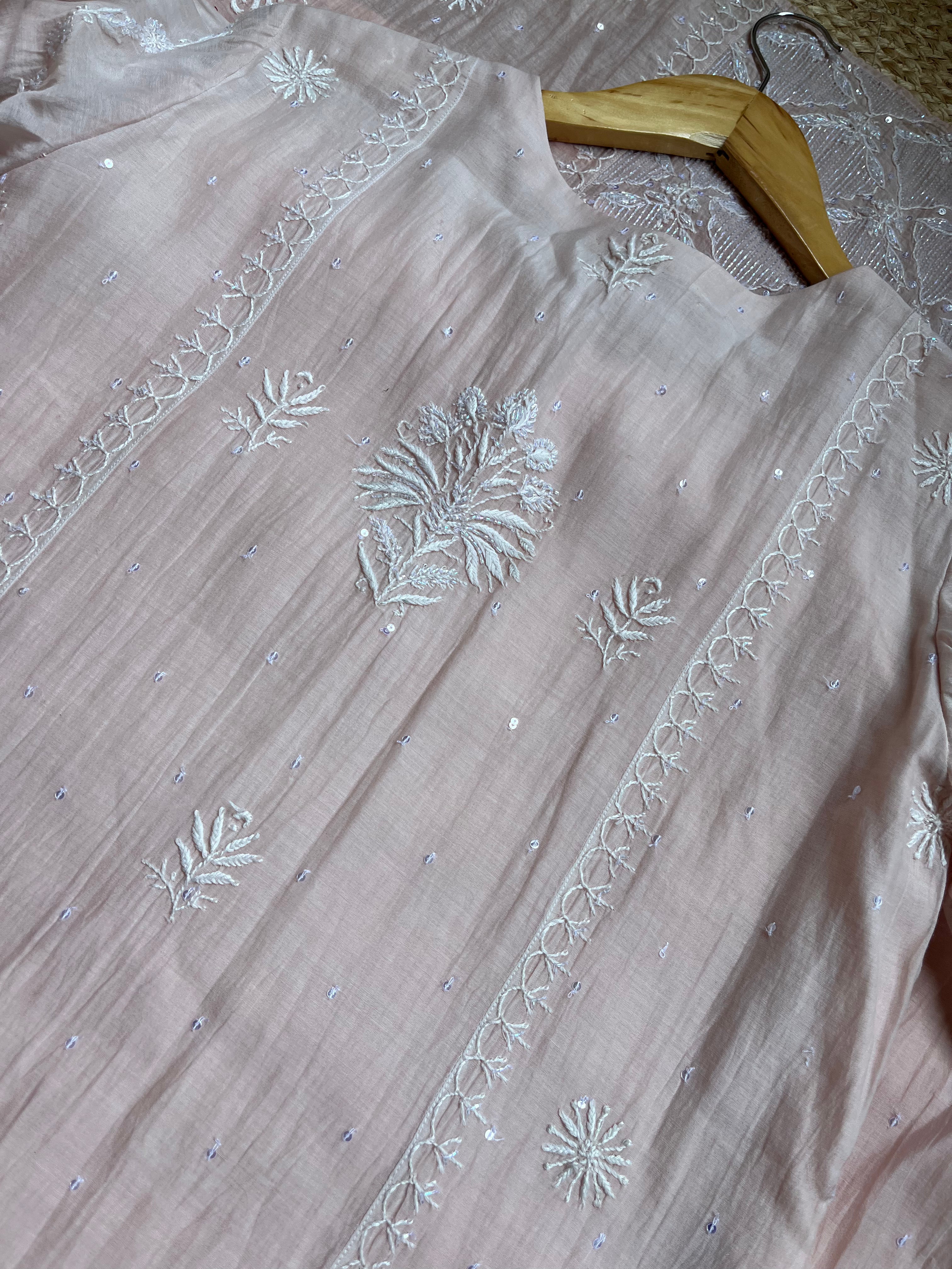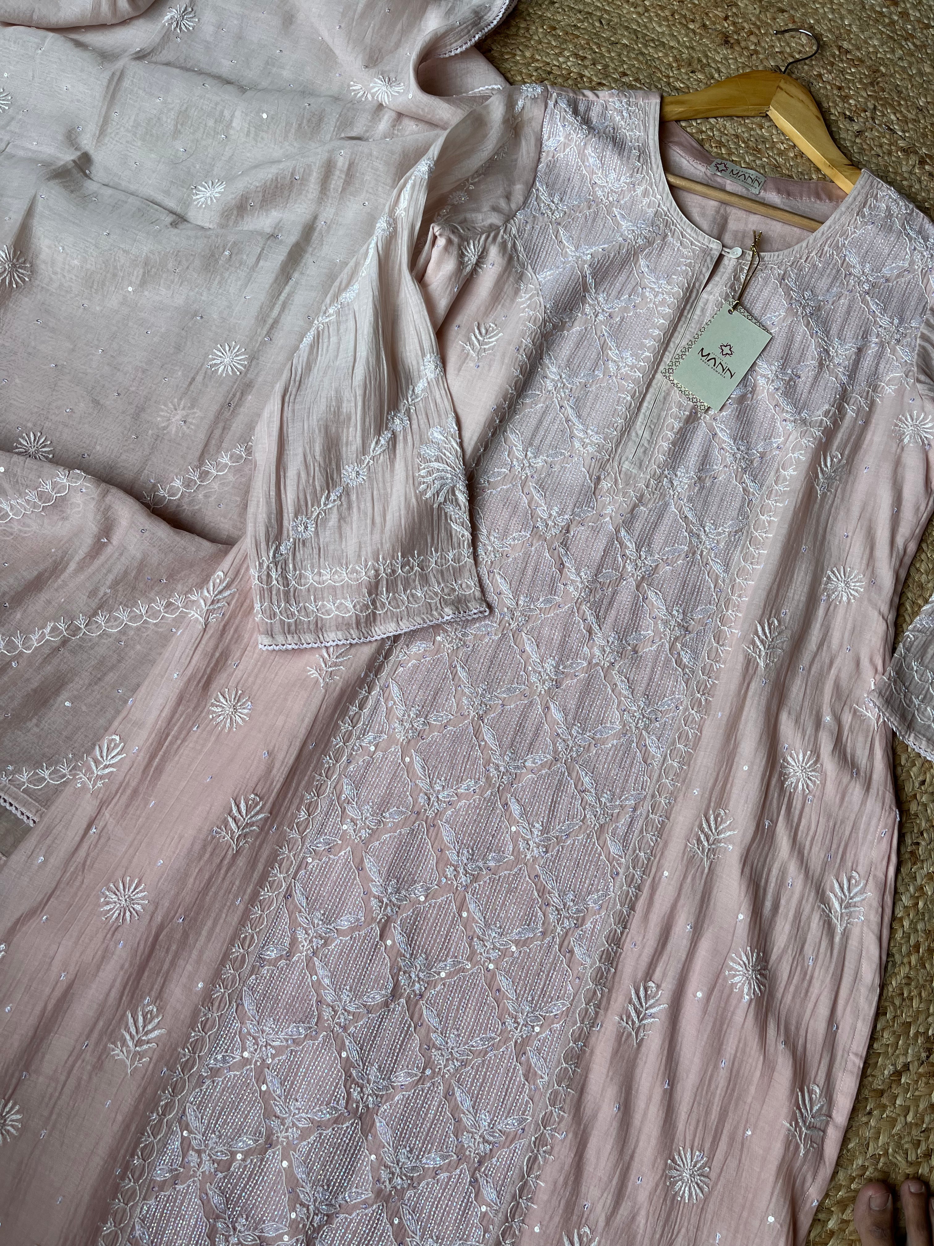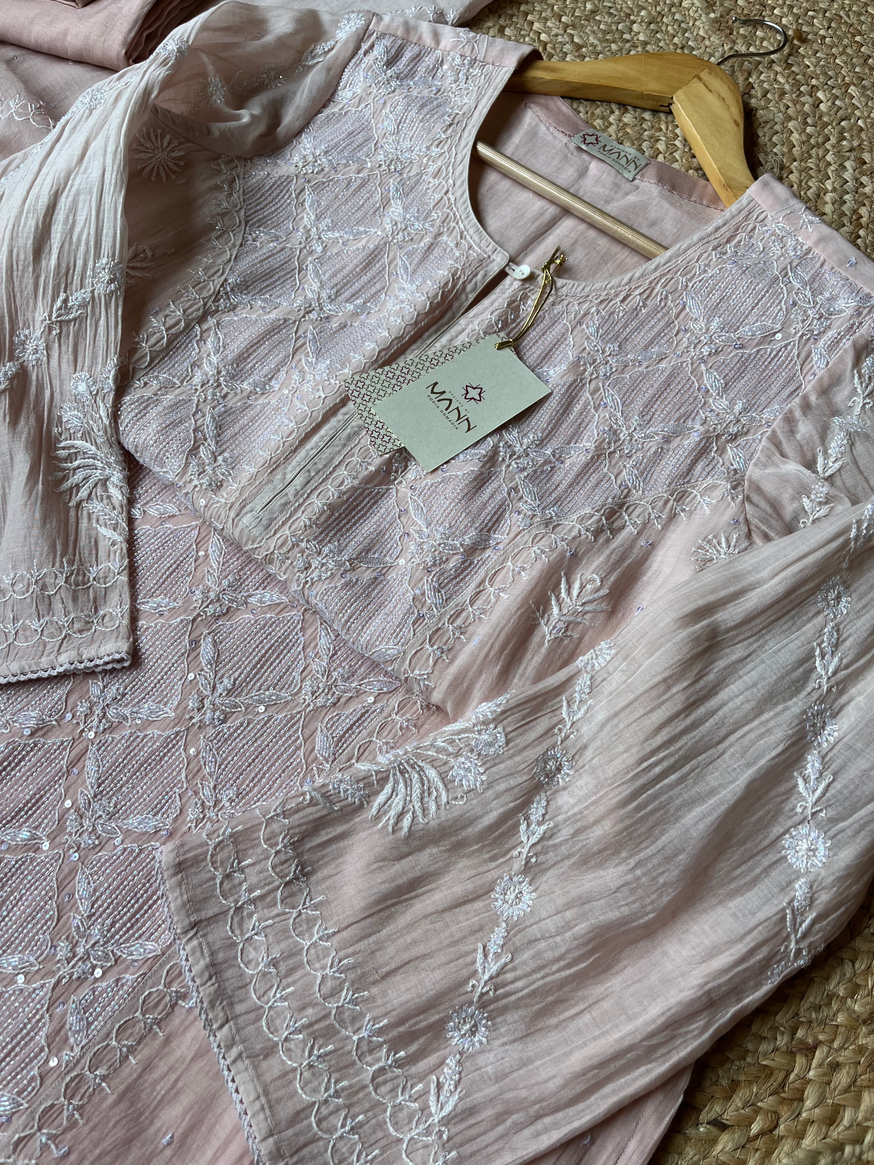 Mal Chanderi Suit Set in chikankari with embellishmnets in cutdana and sequins