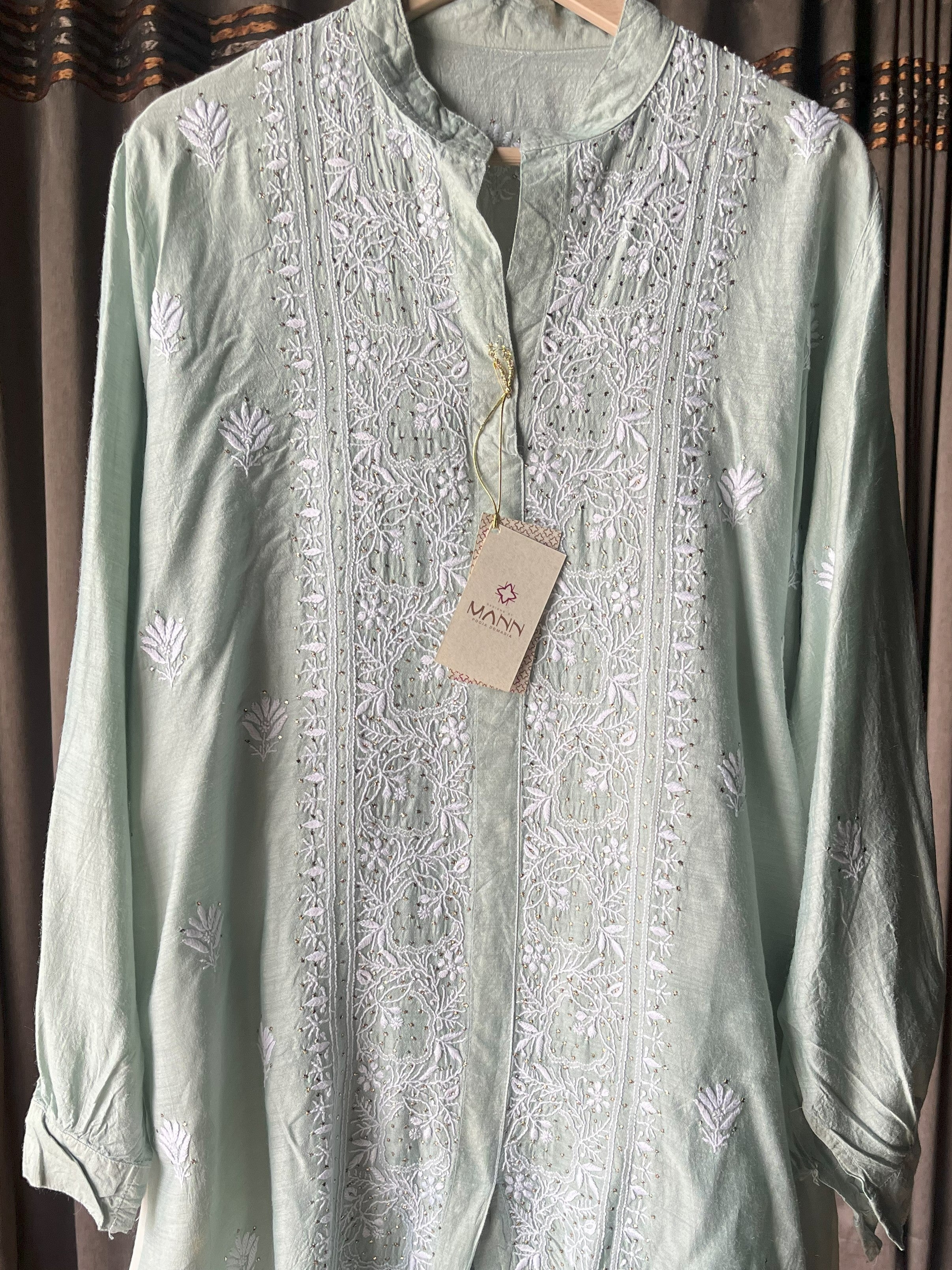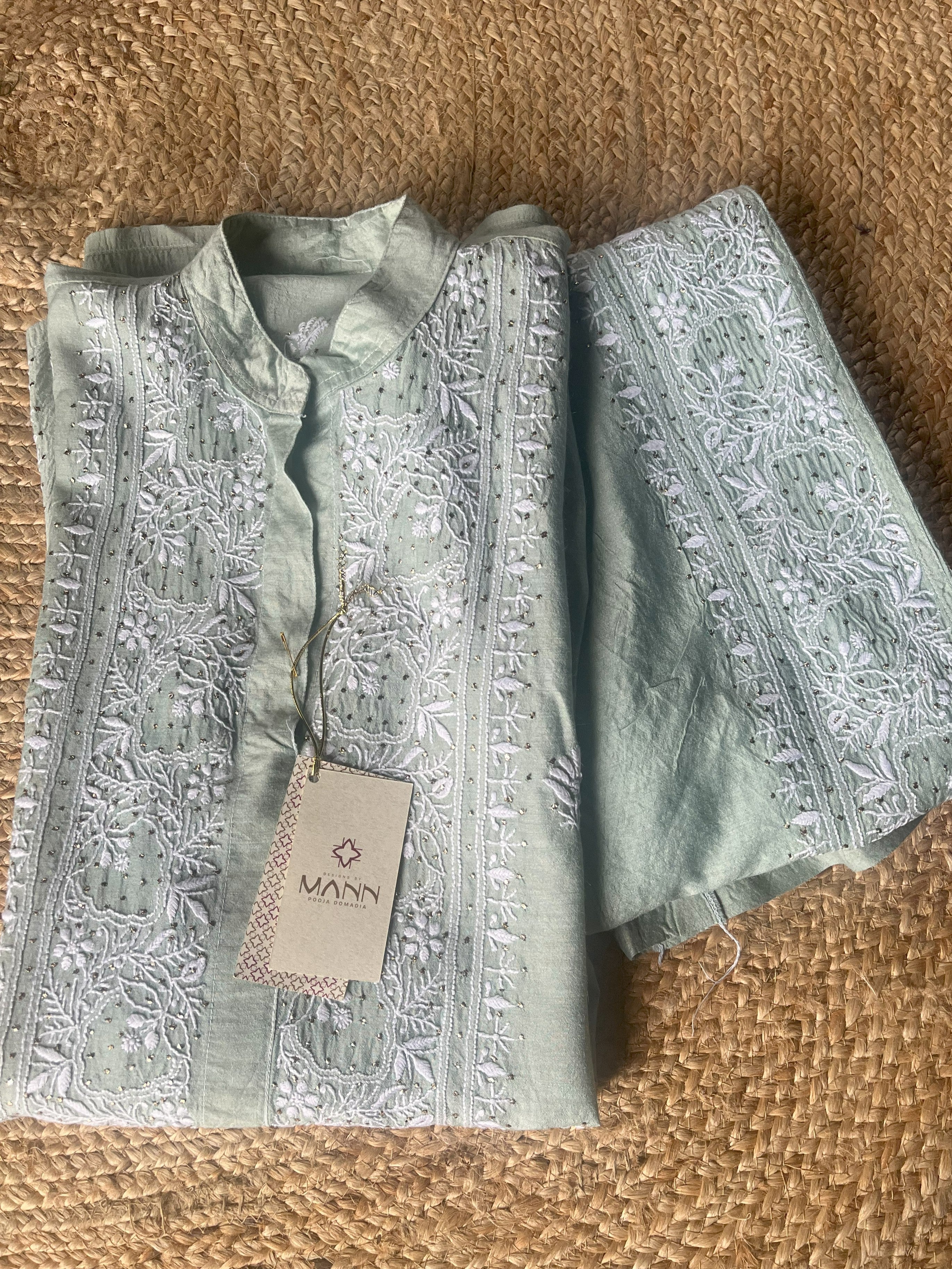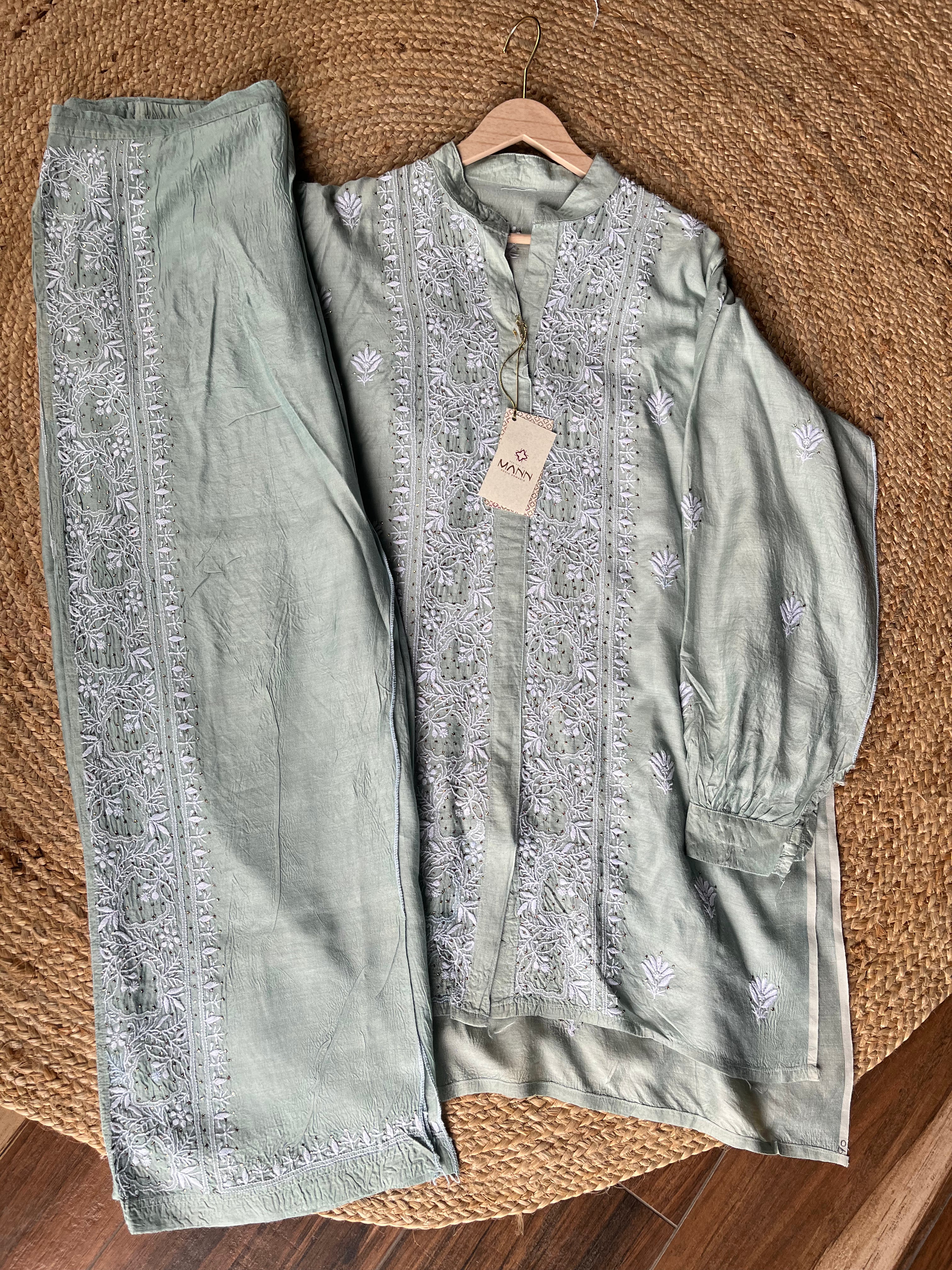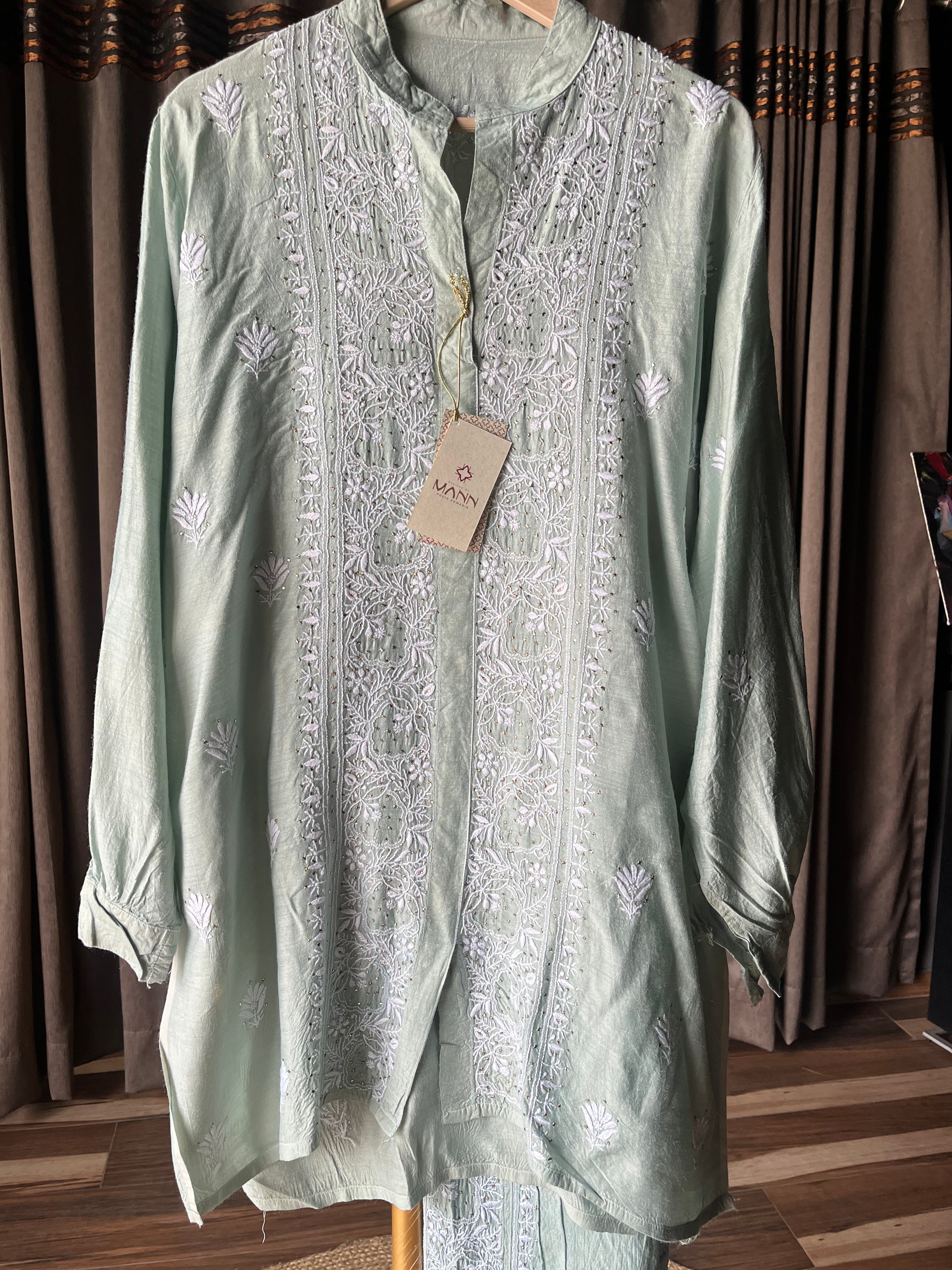Pastel teal Green Moonga Silk Chikankari Co-ord Set