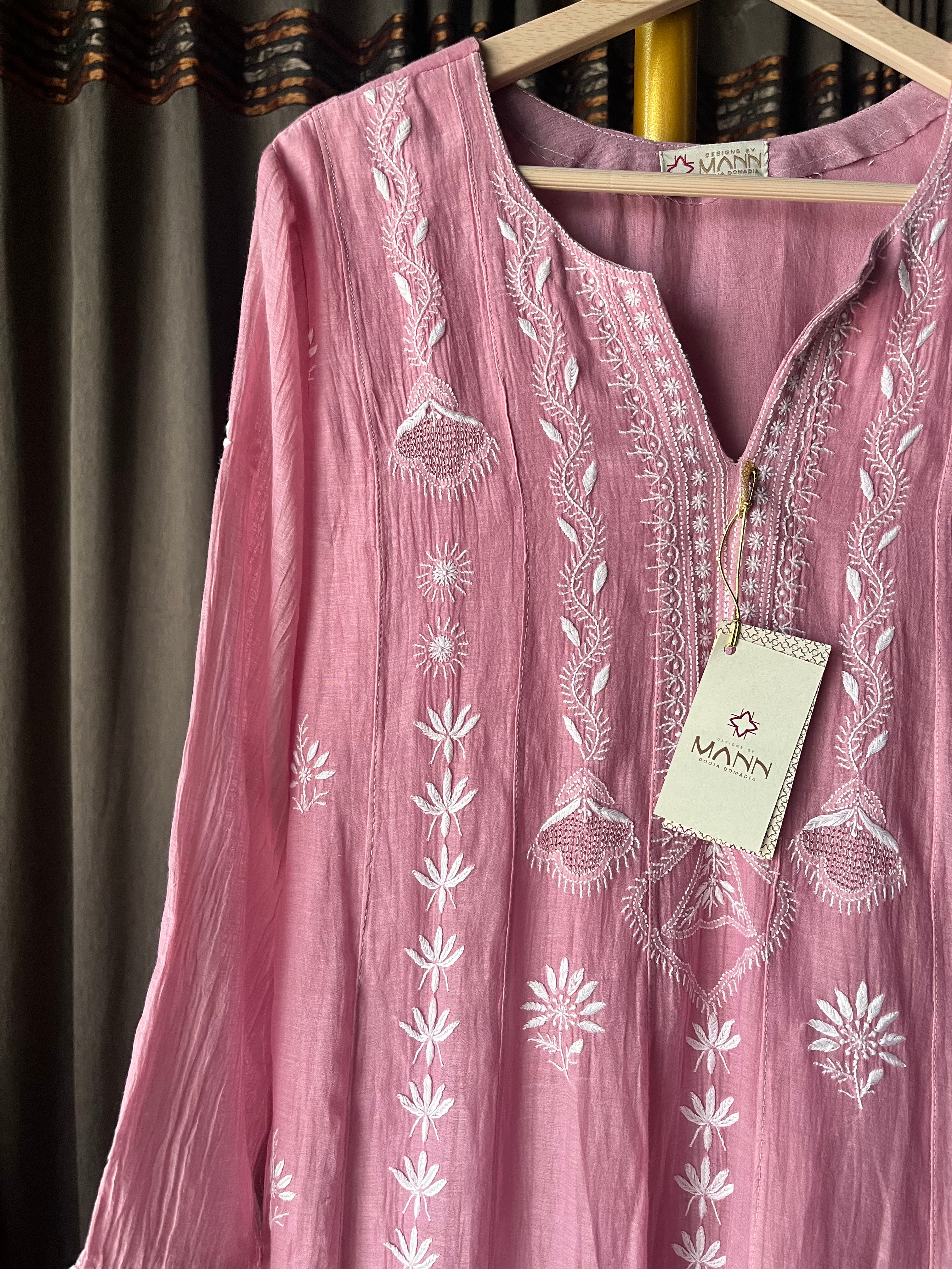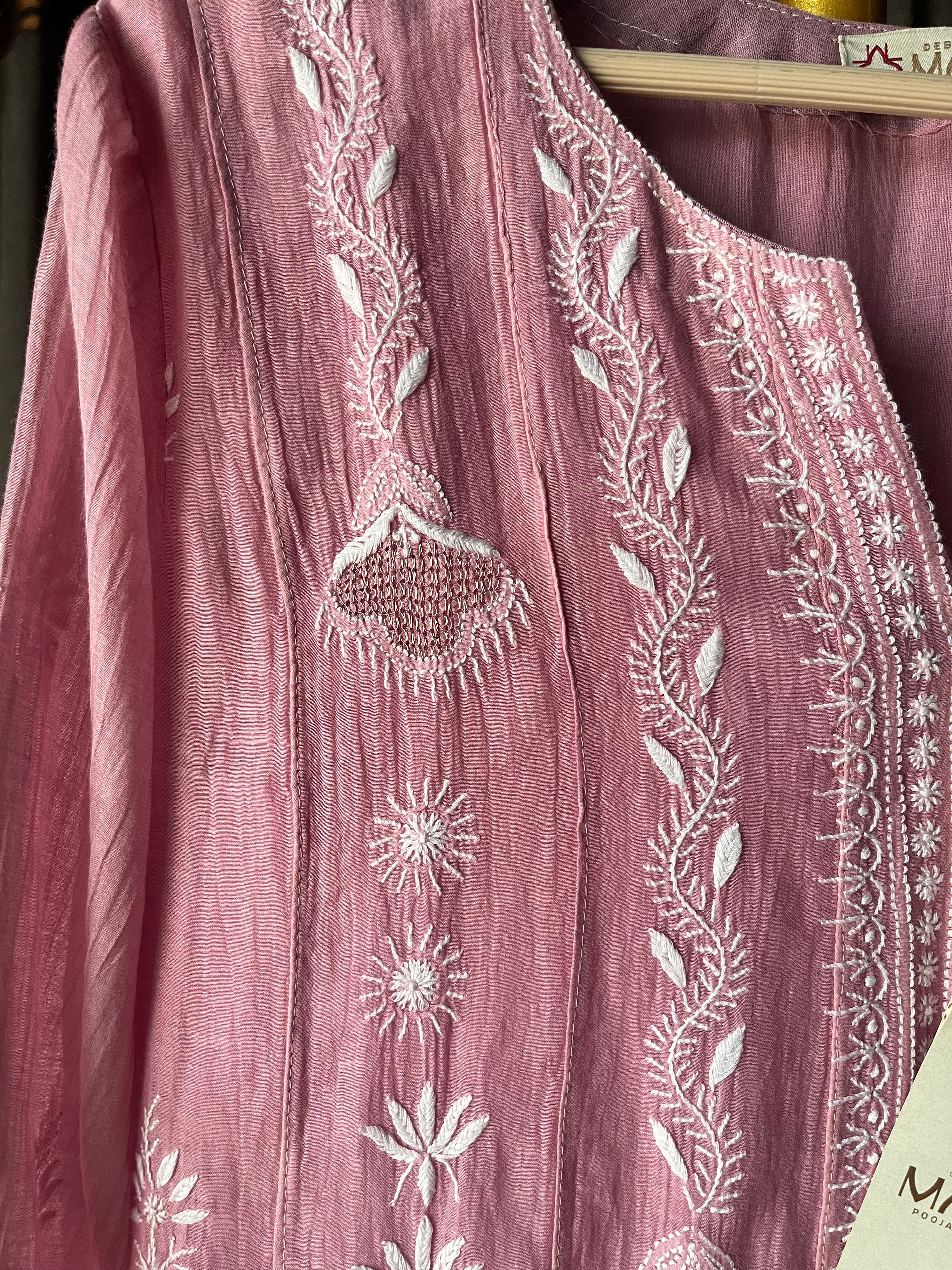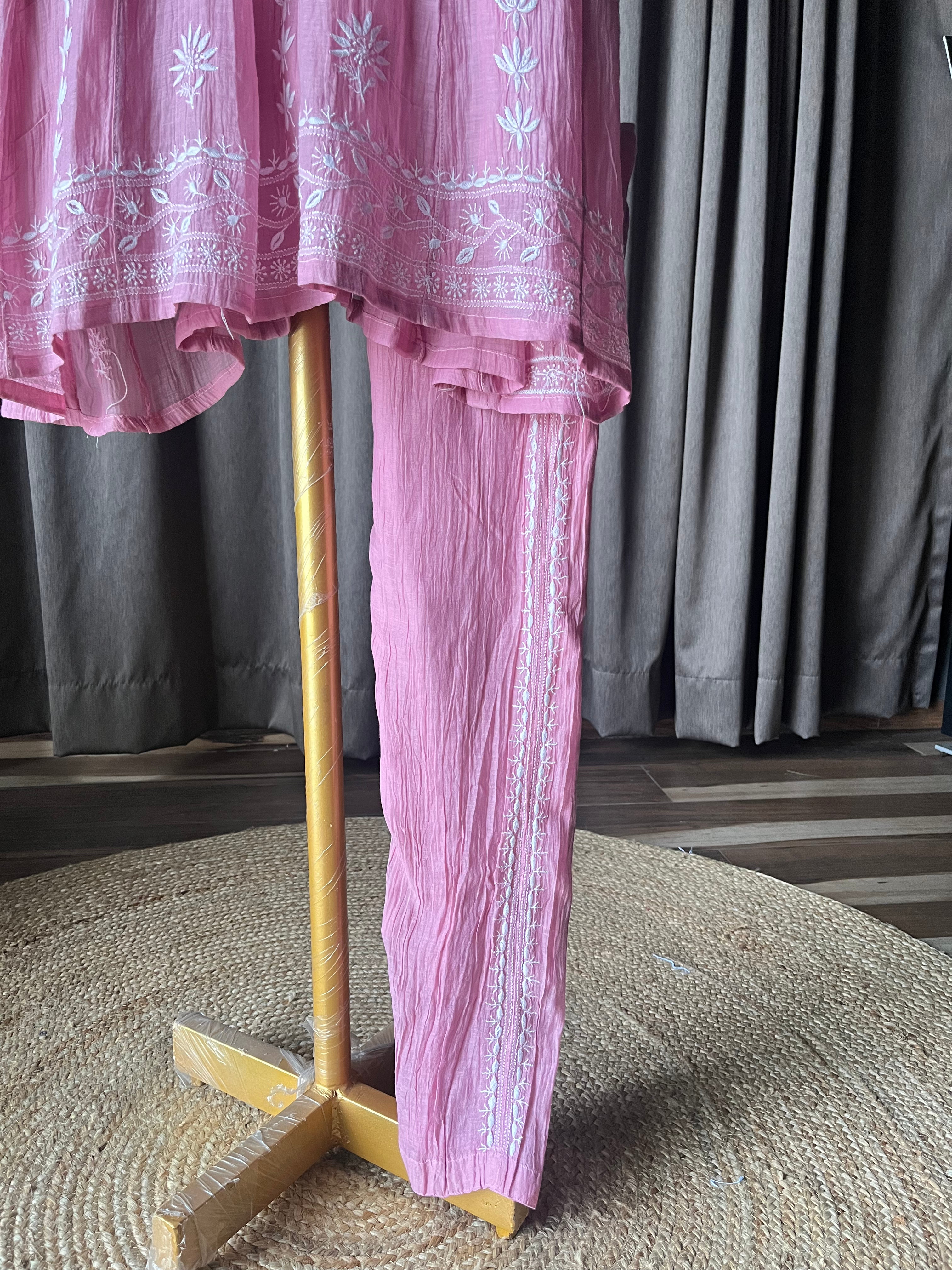 Fullly Stitched Pink Mal Chanderi Chikankari Co-ord Set