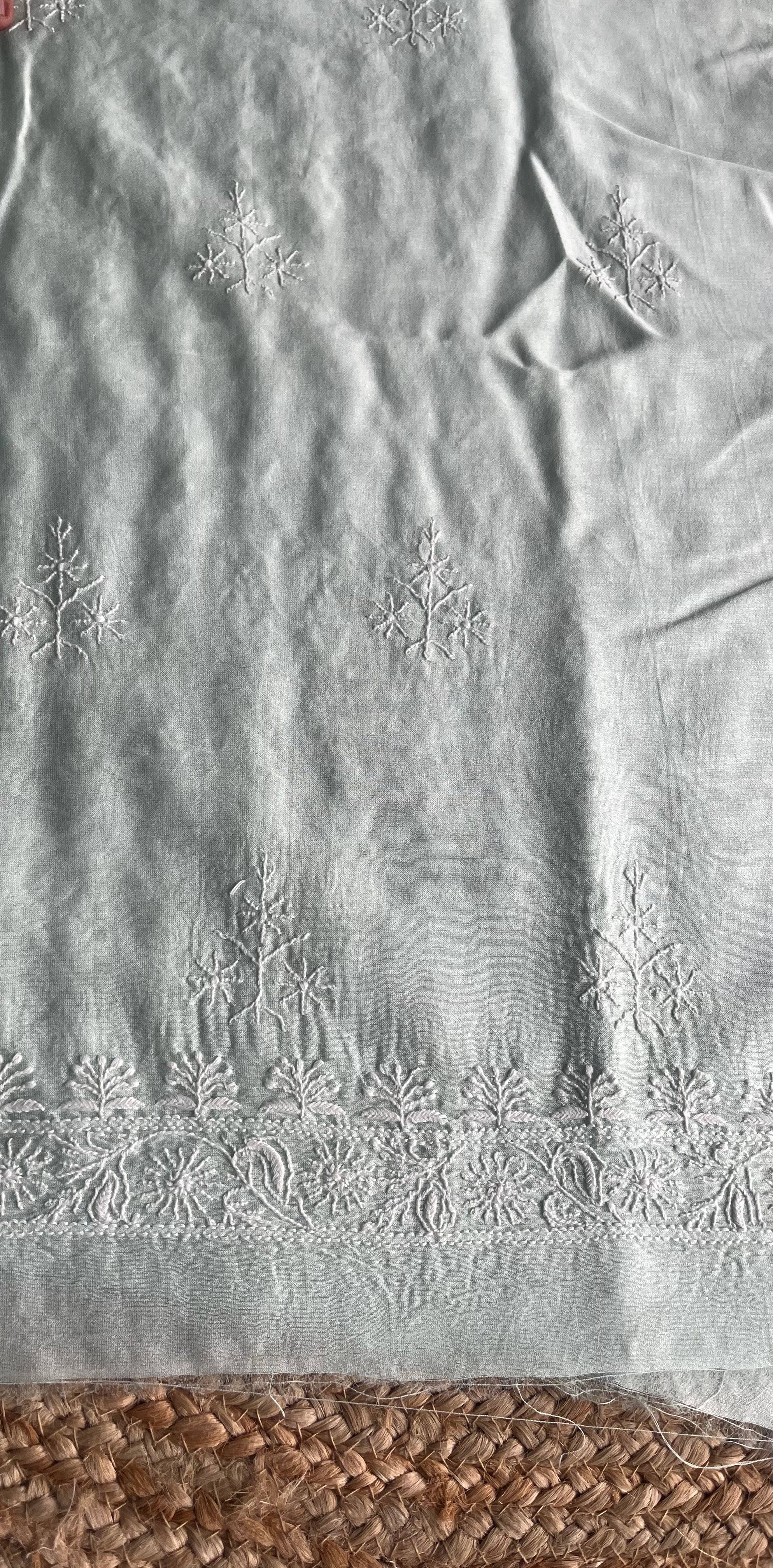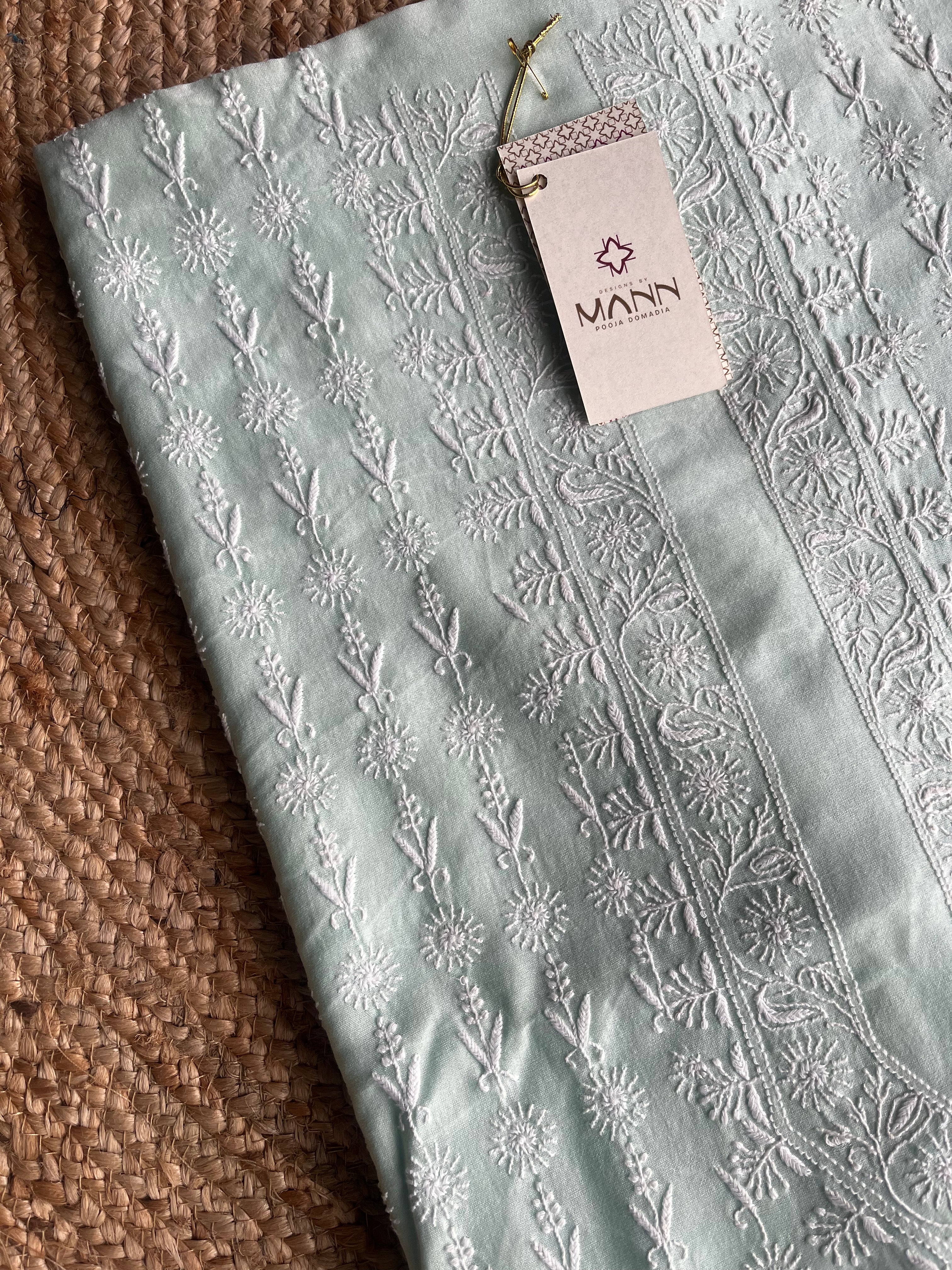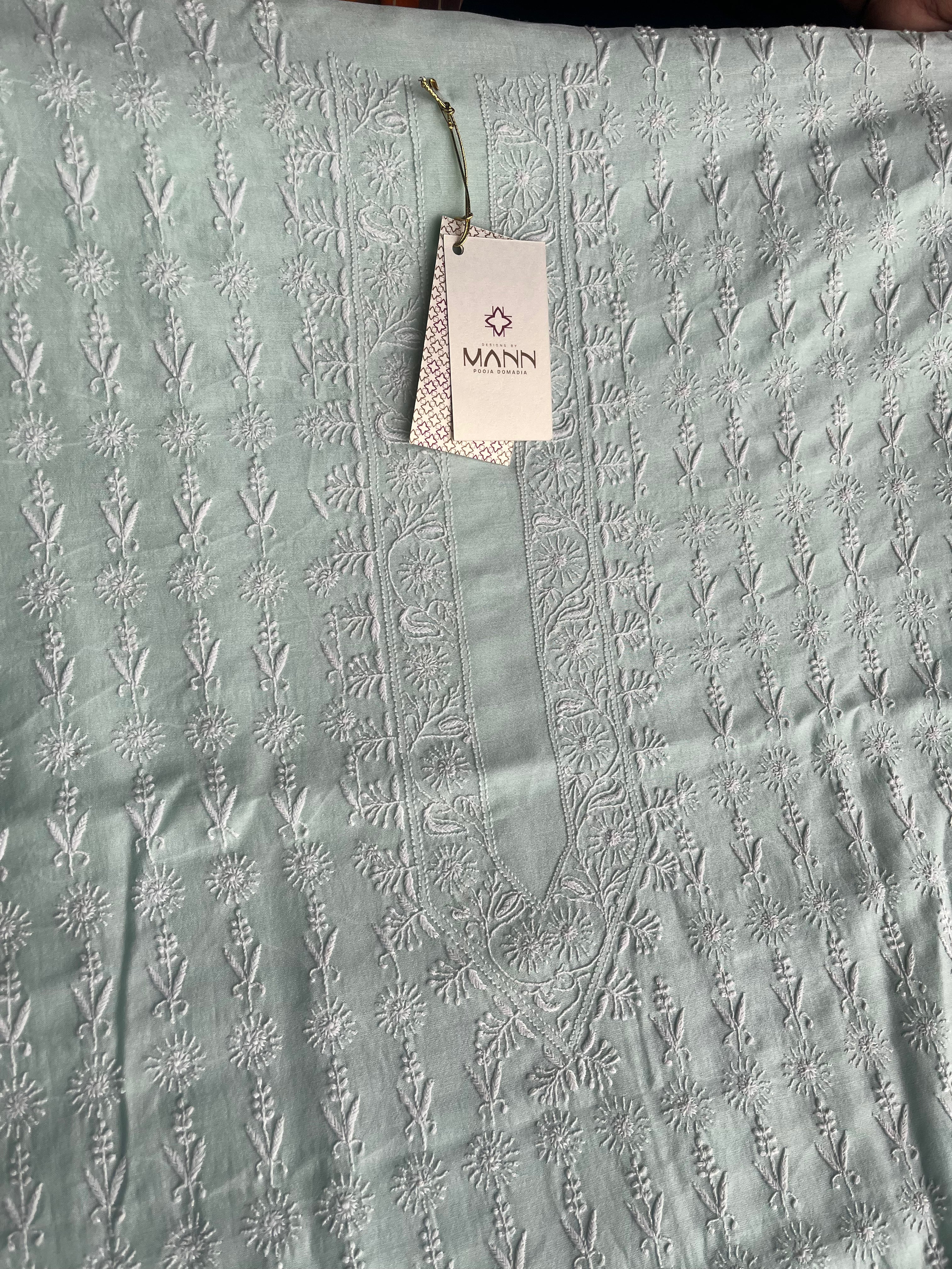 Pista green chanderi silk men's kurta fabric with intricate chikankari embroidery
