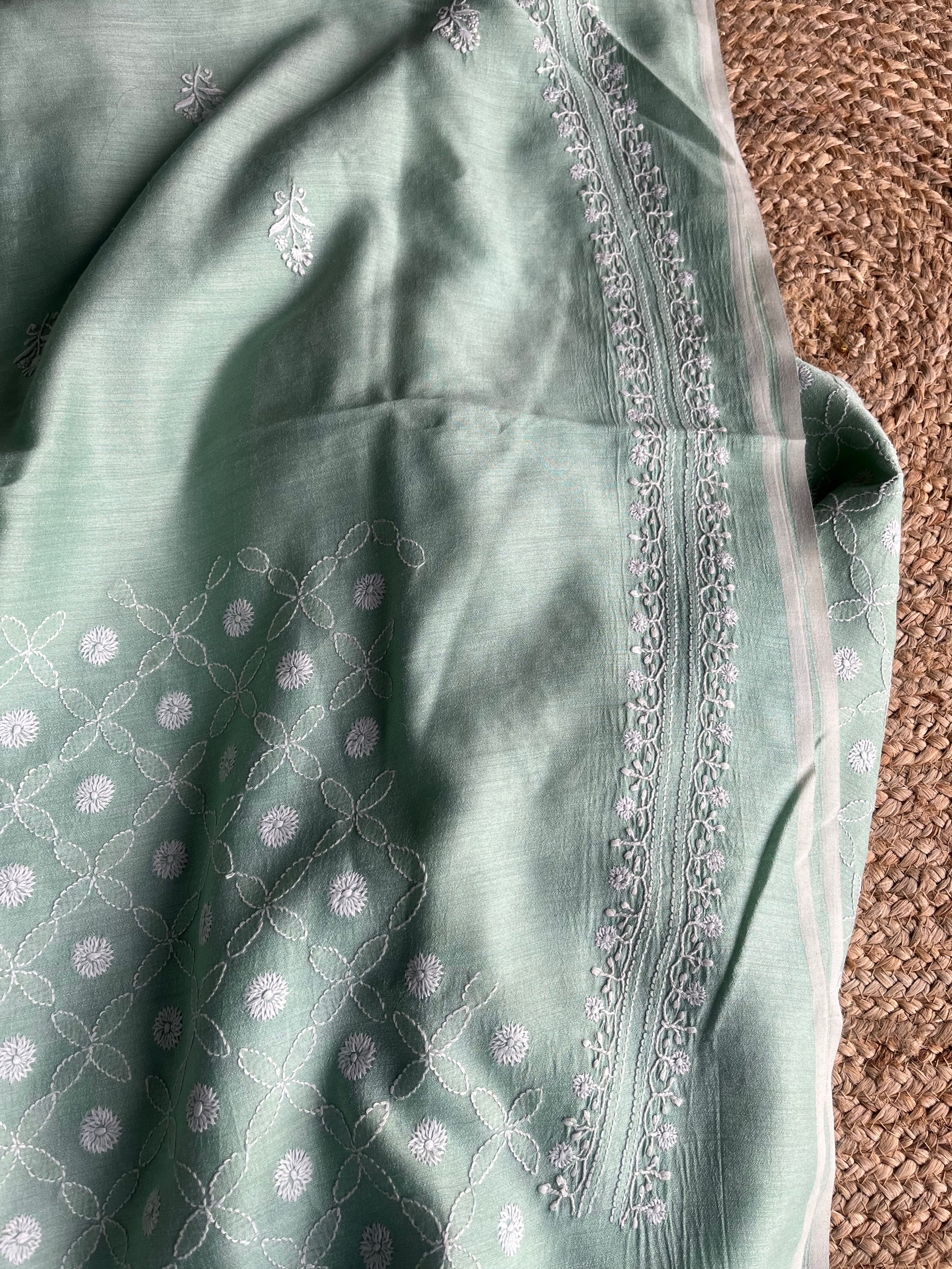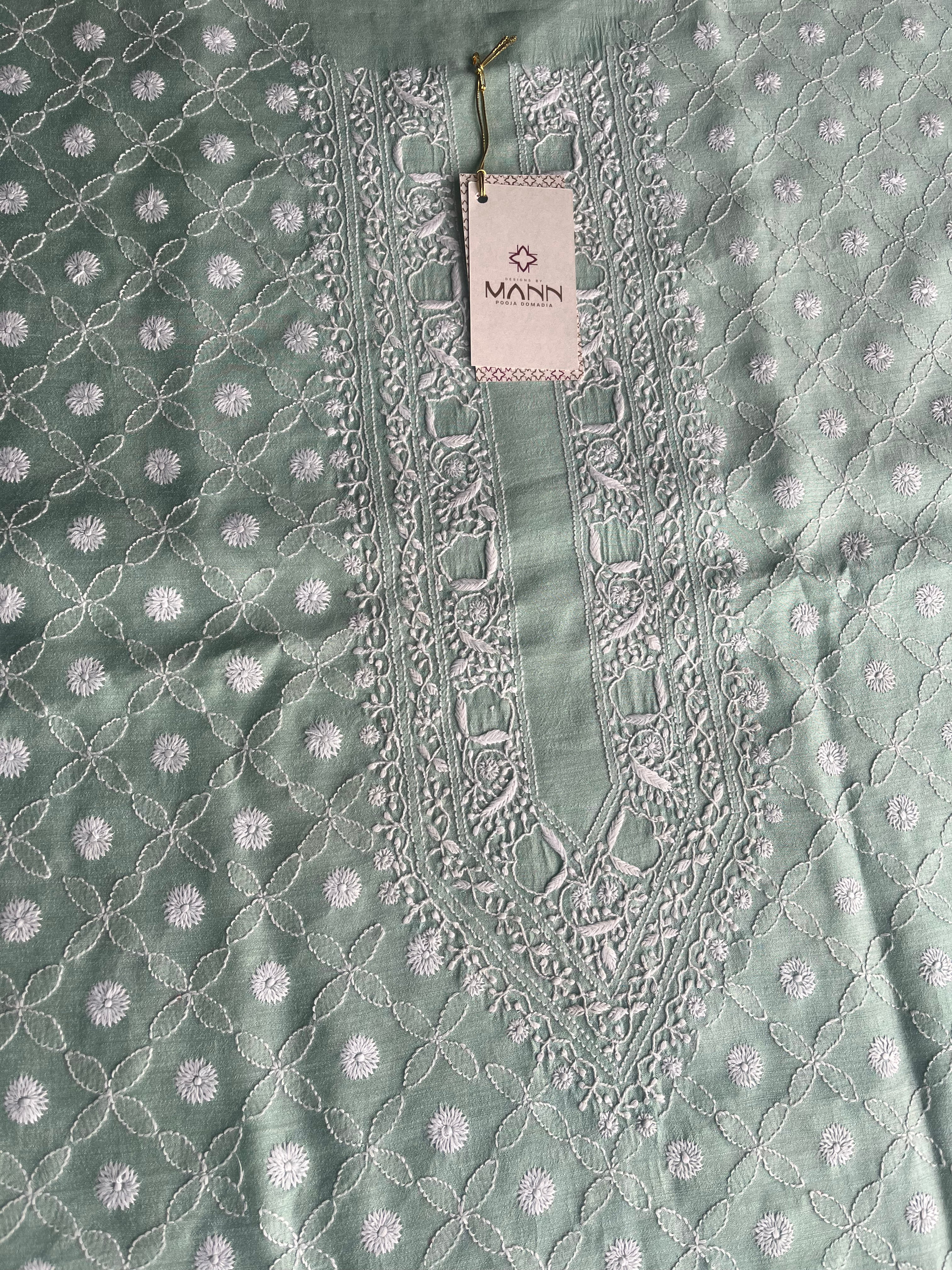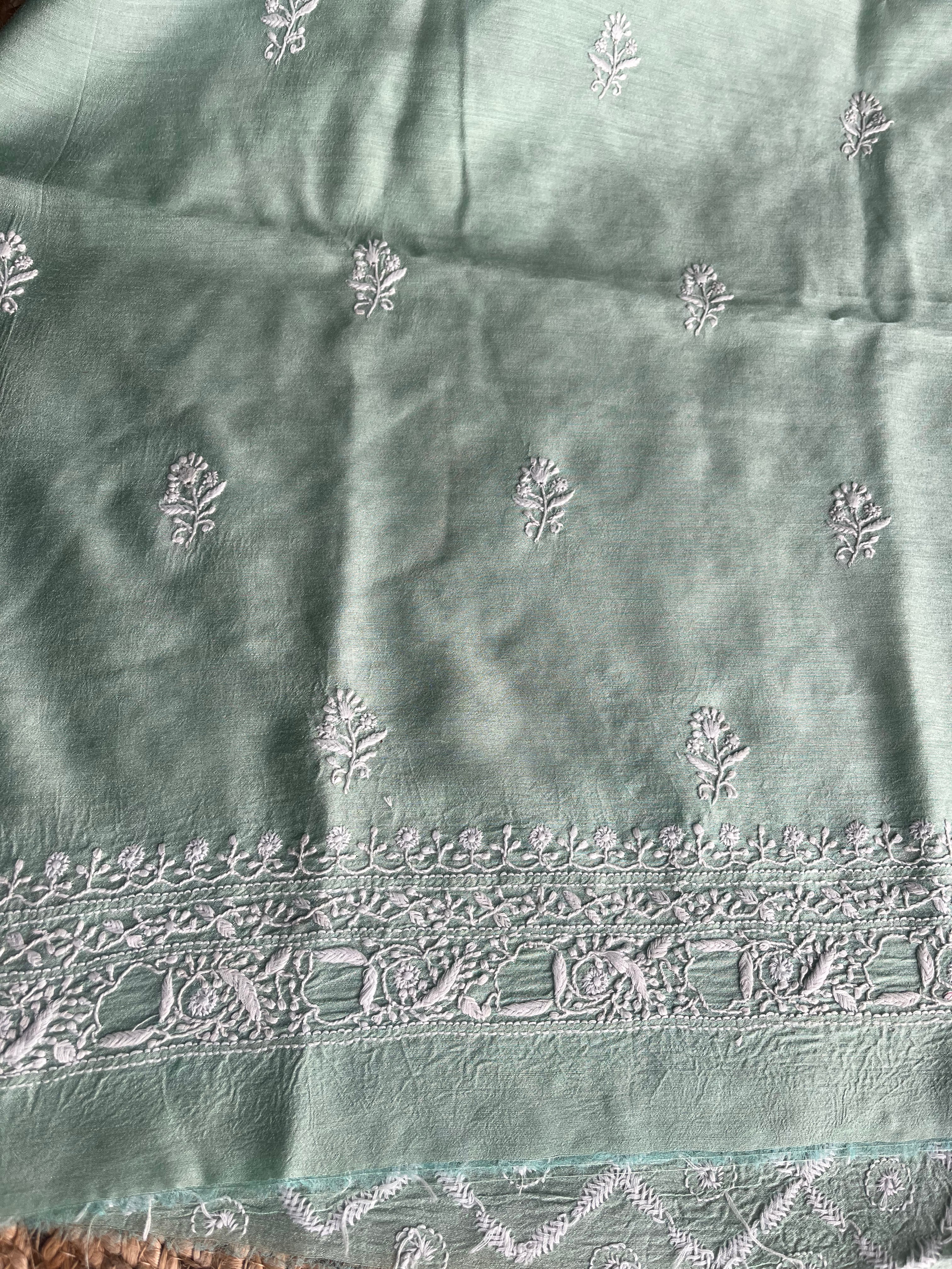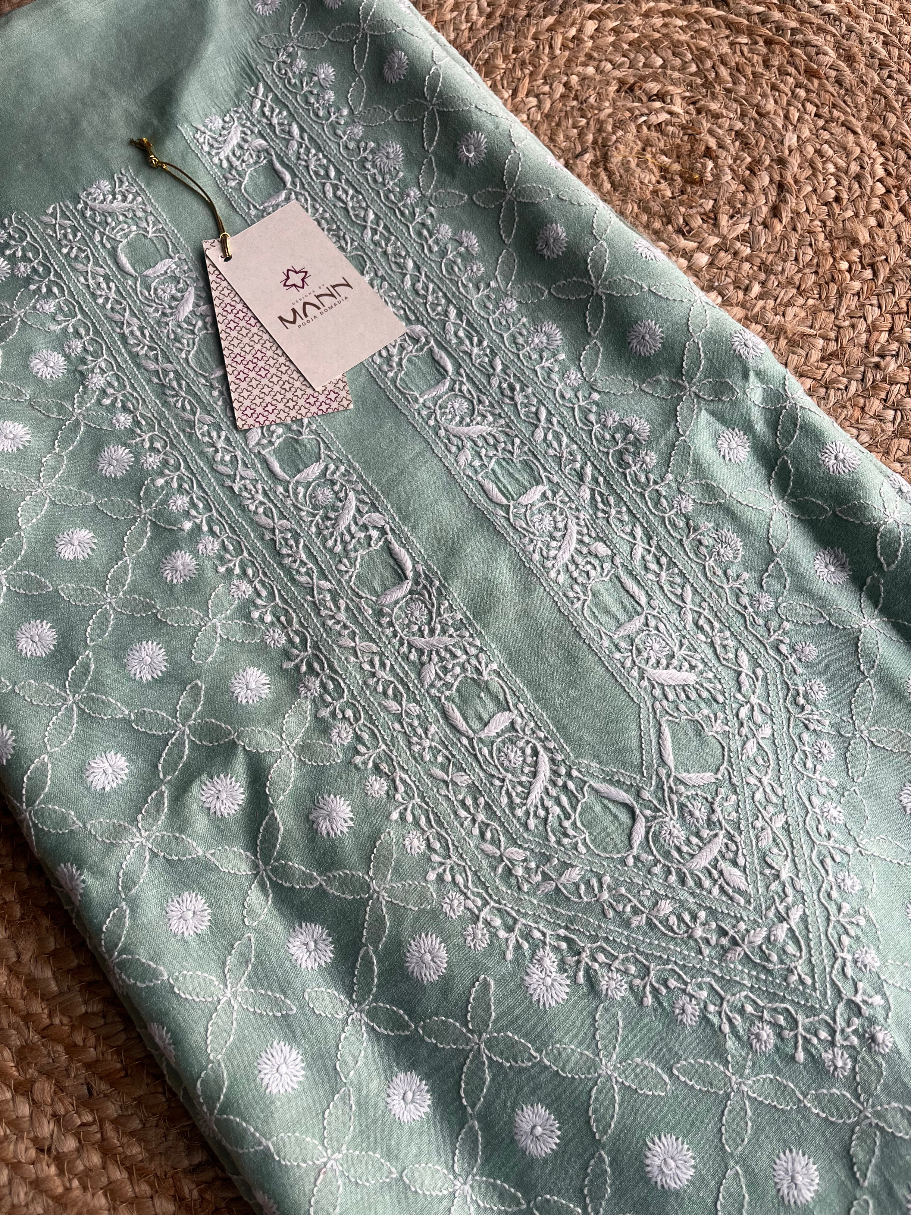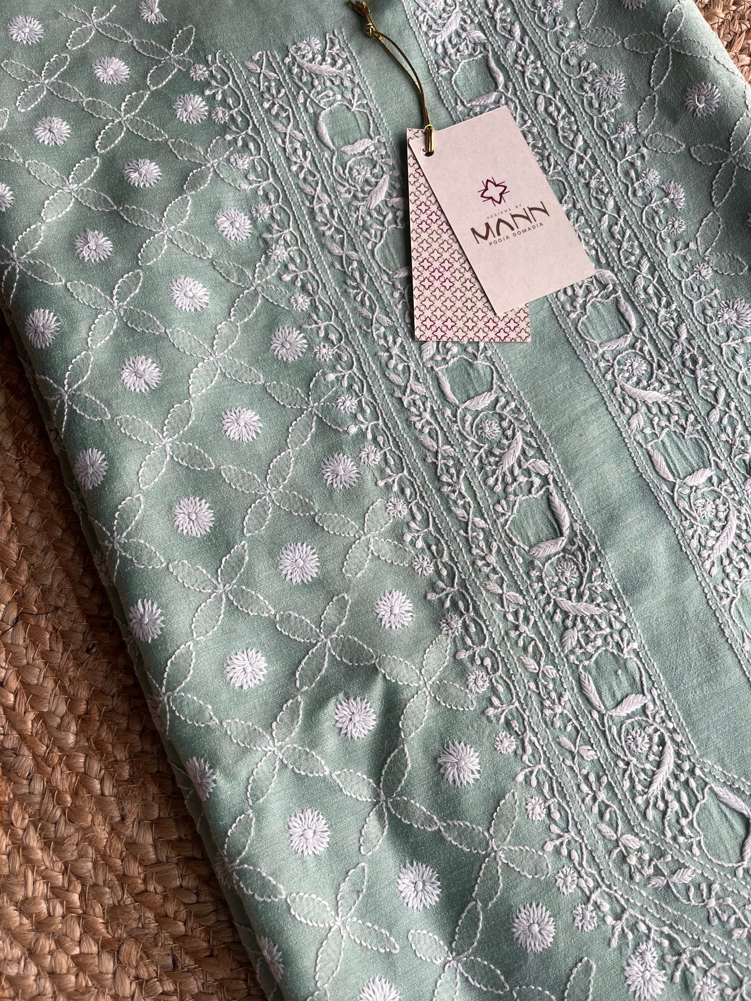 Pista green moonga silk men's kurta fabric with intricate chikankari embroidery