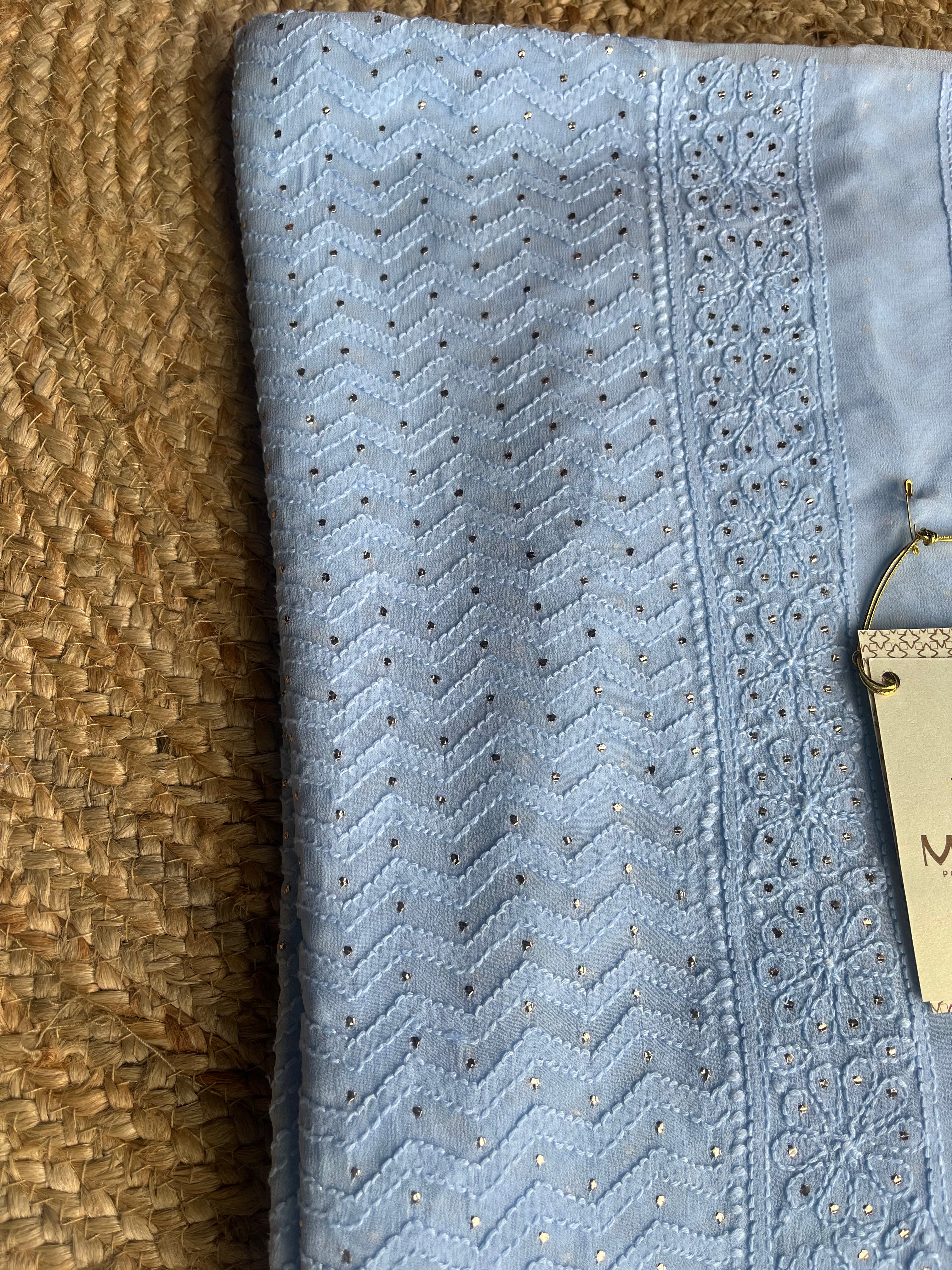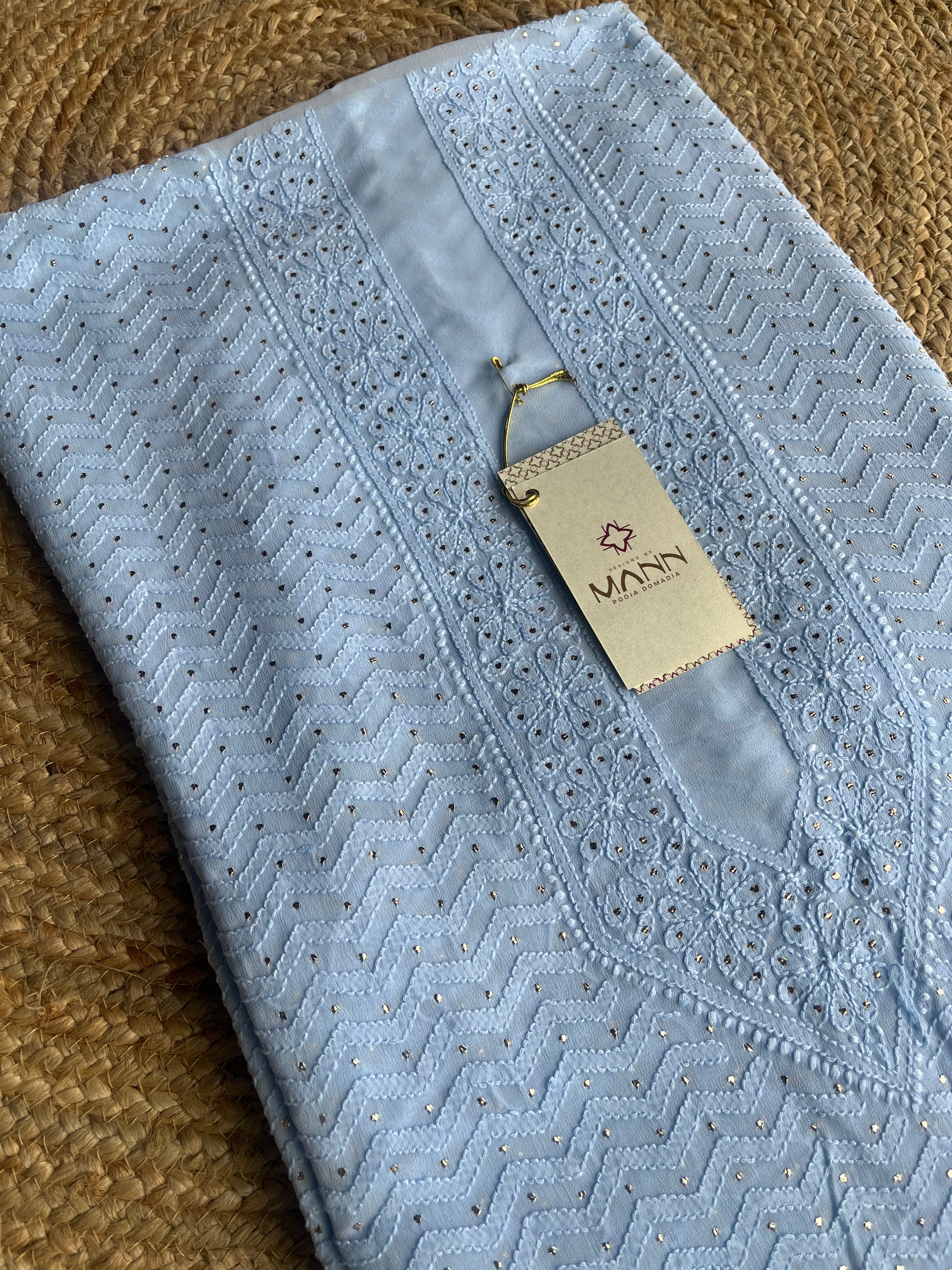 Powder blue georgette men's kurta fabric with chikankari & Mukaish/badla embroidery