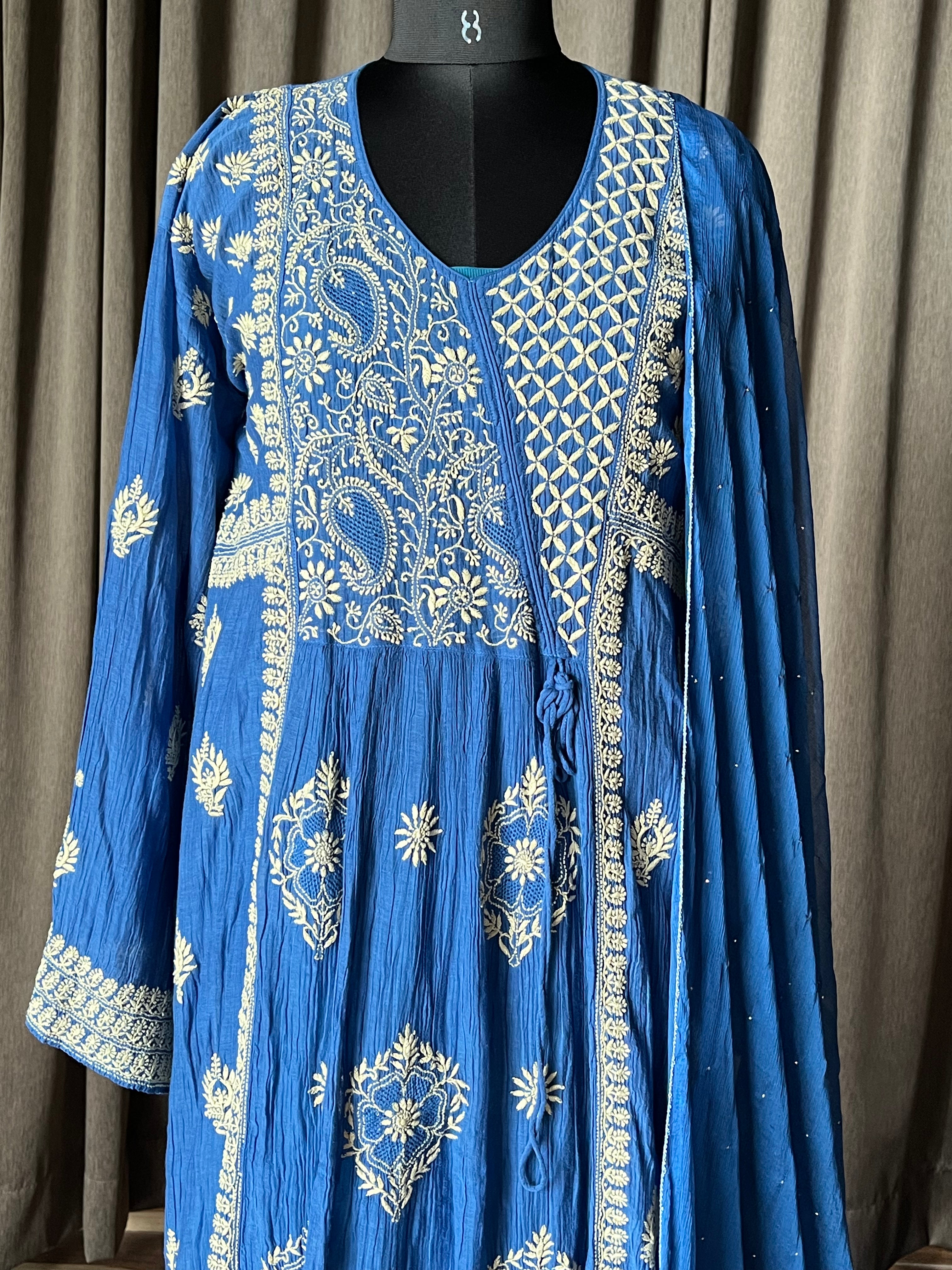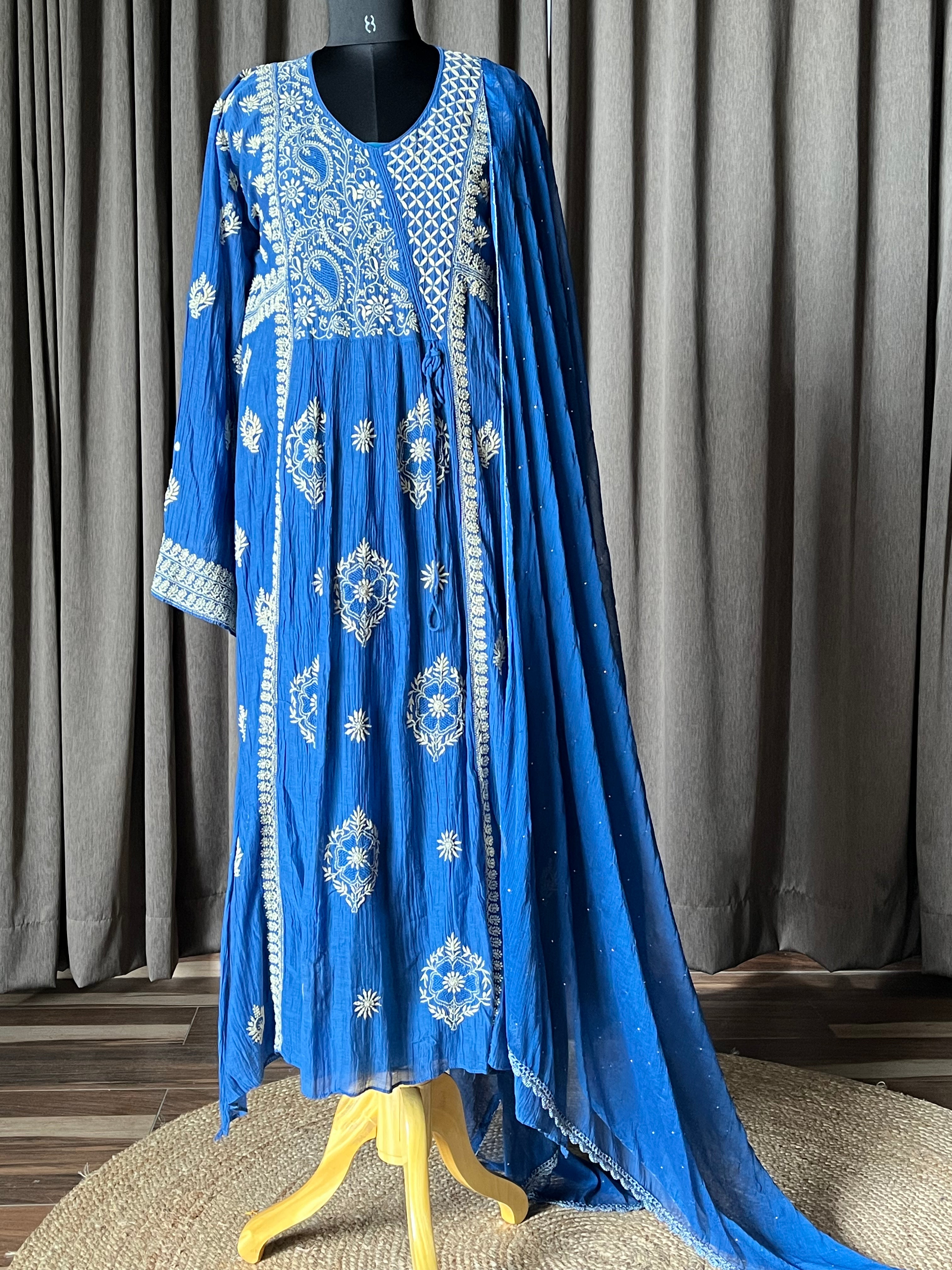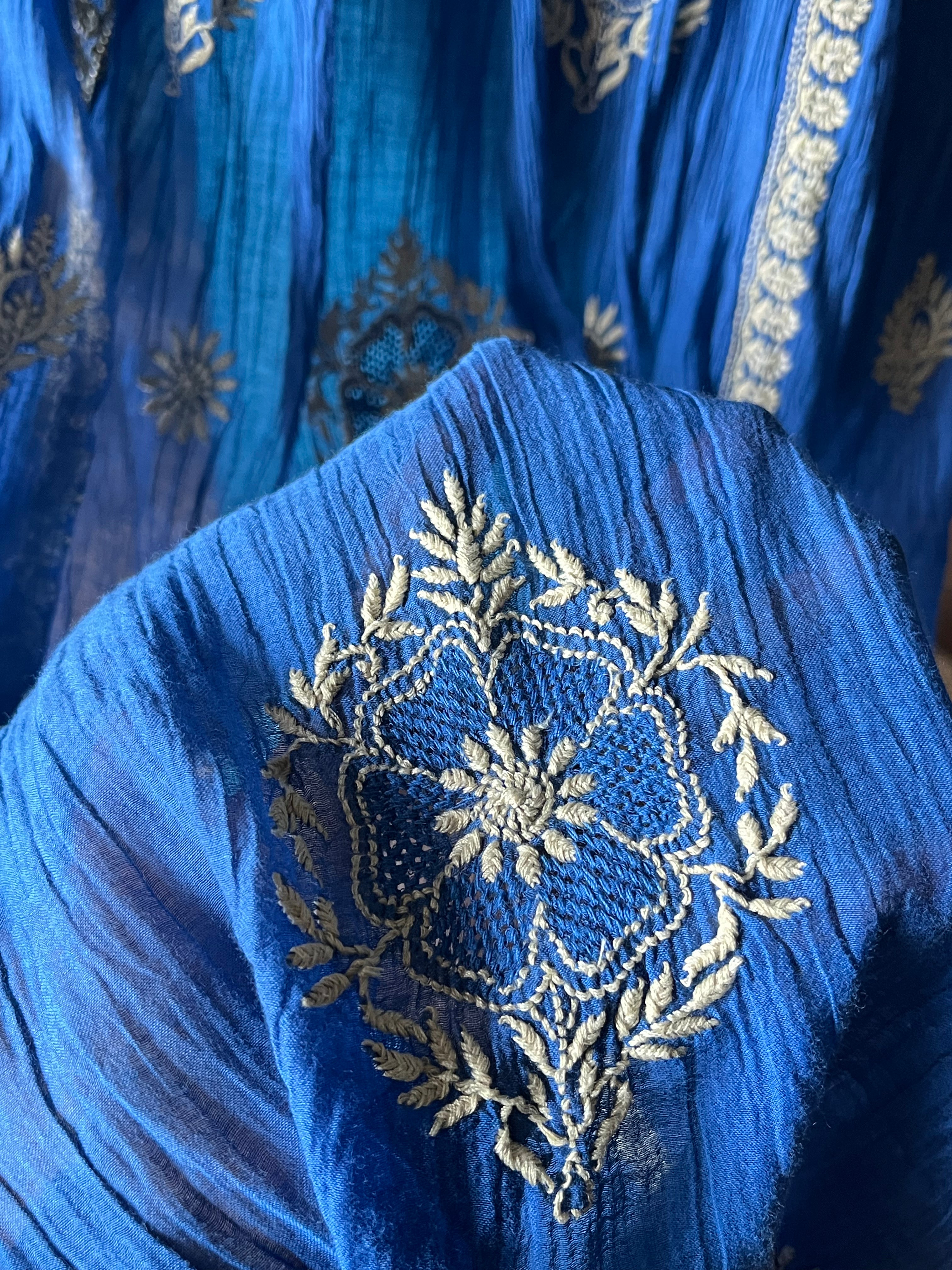 Royal blue colour mal chanderi kalidar kurta/suit set with chikankari work and worked pants