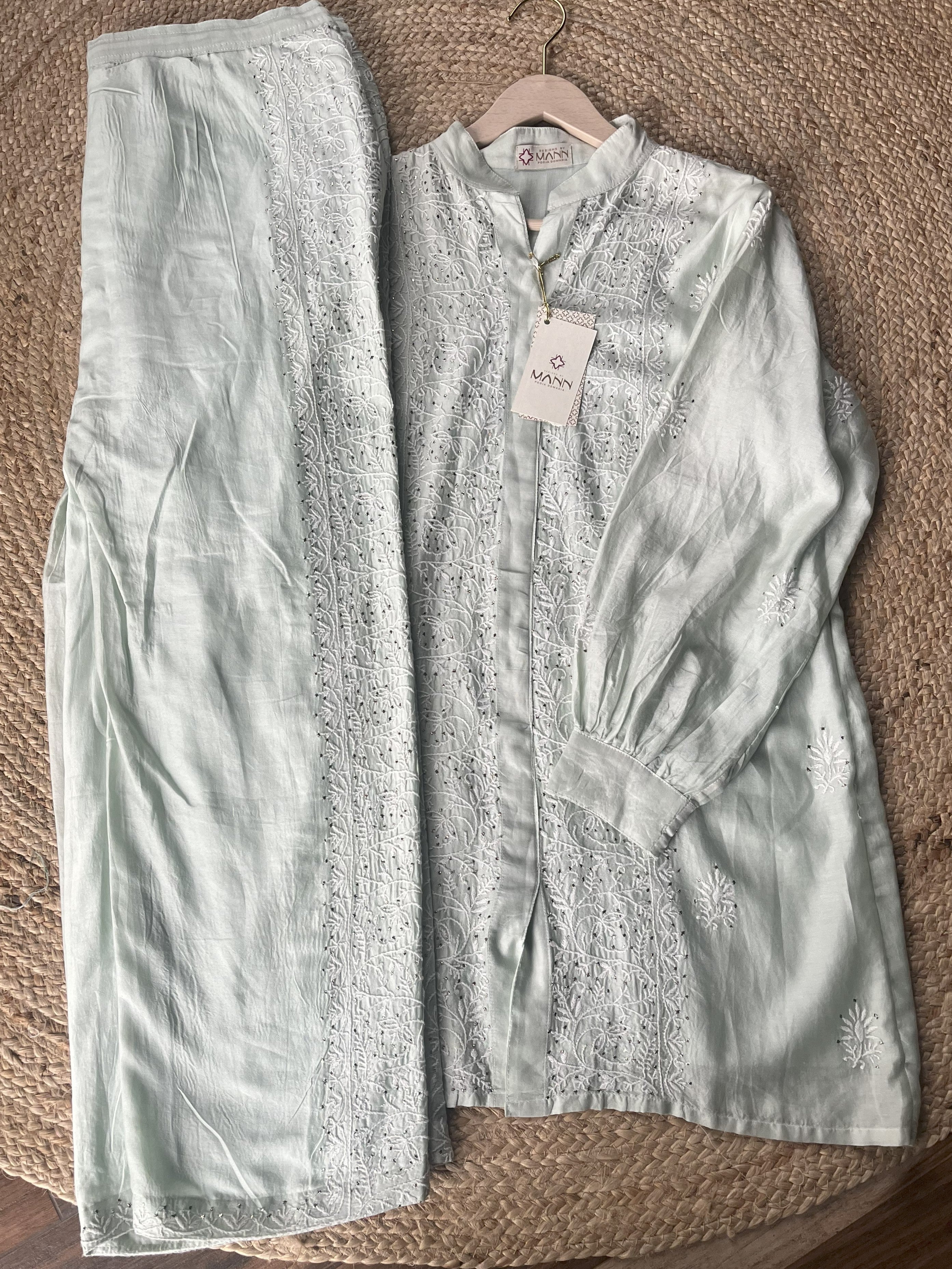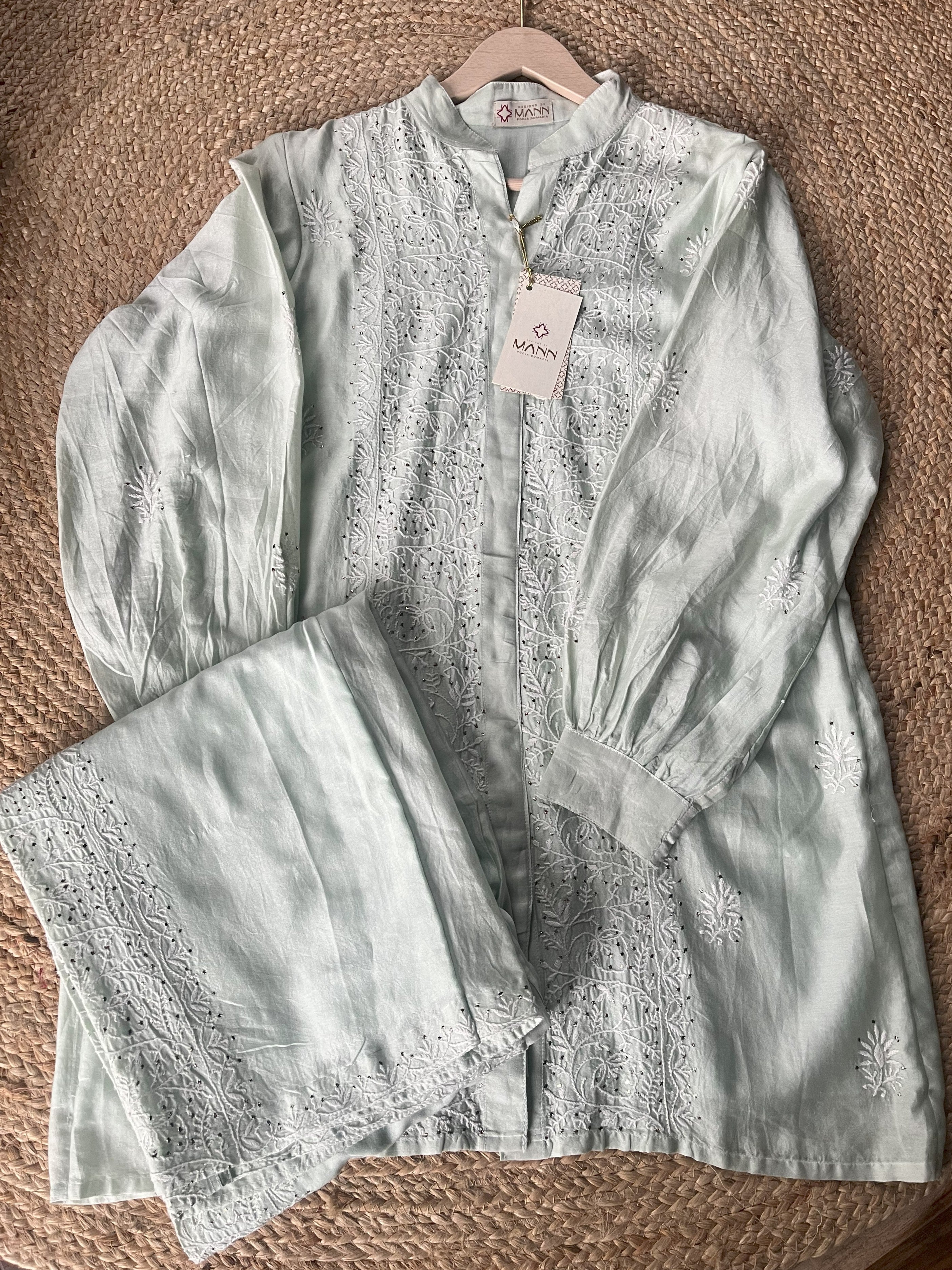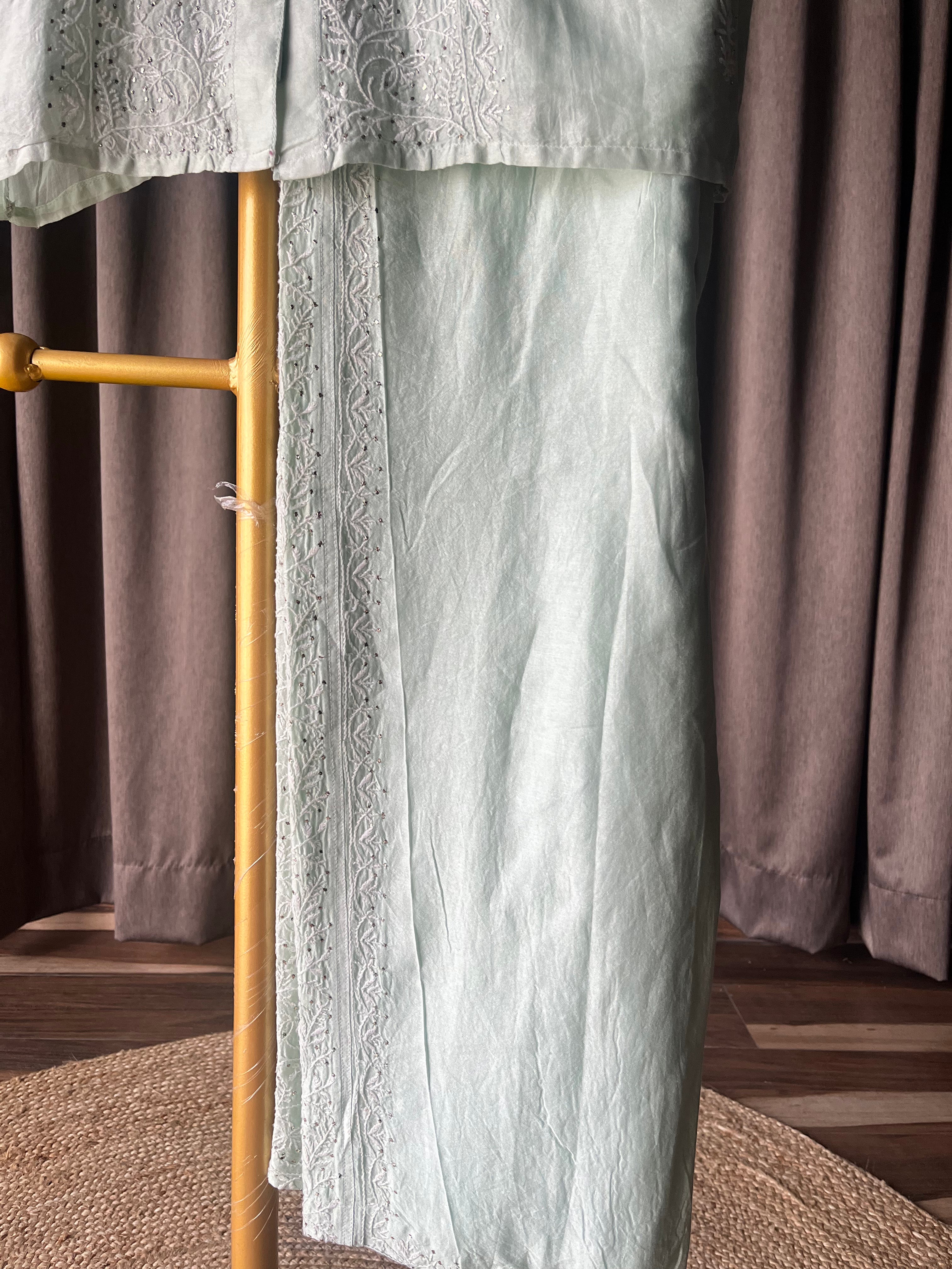 Sea Green Co-ord Set in chanderi silk adorned with chikankari and mukaish/badla work