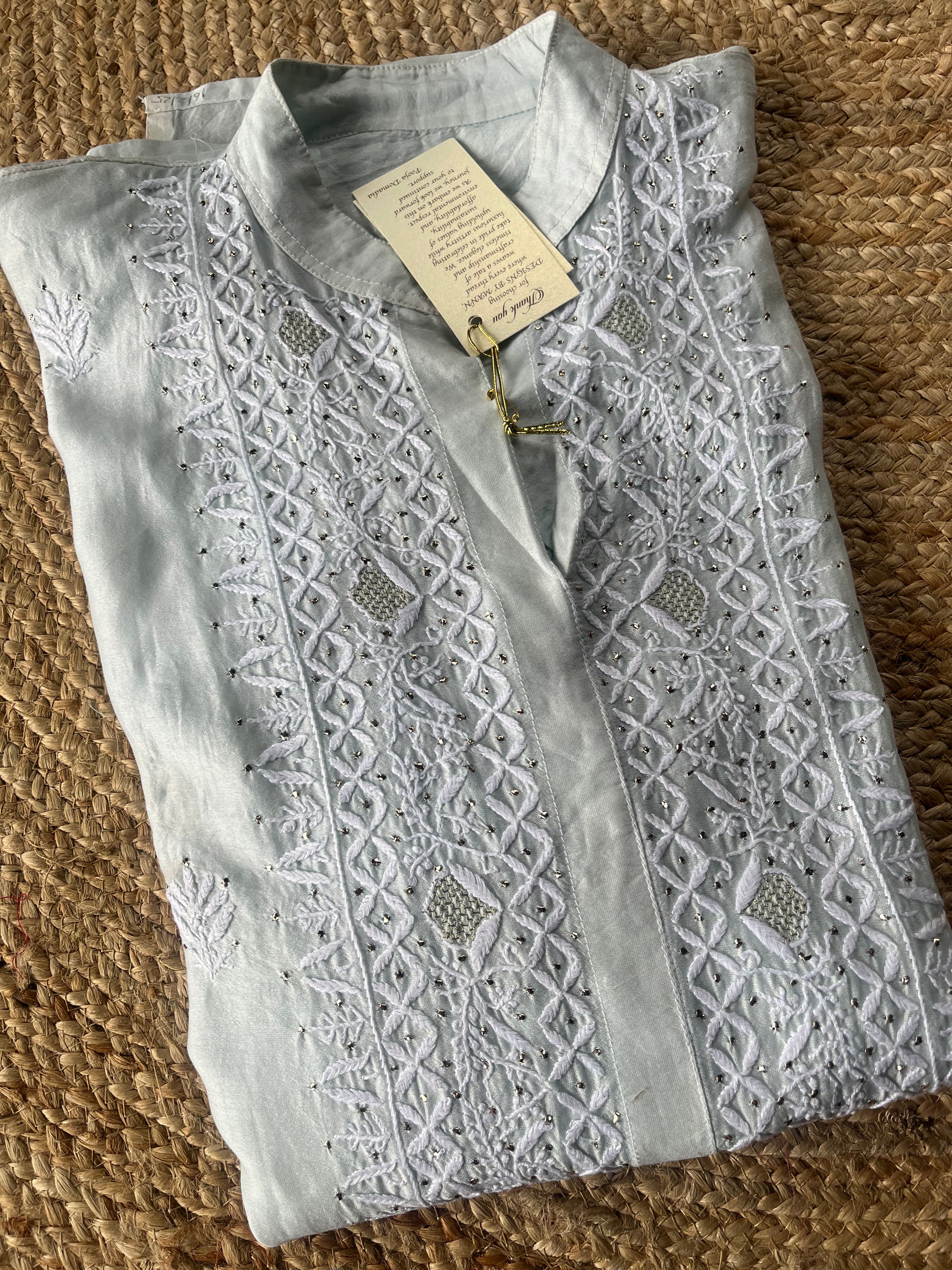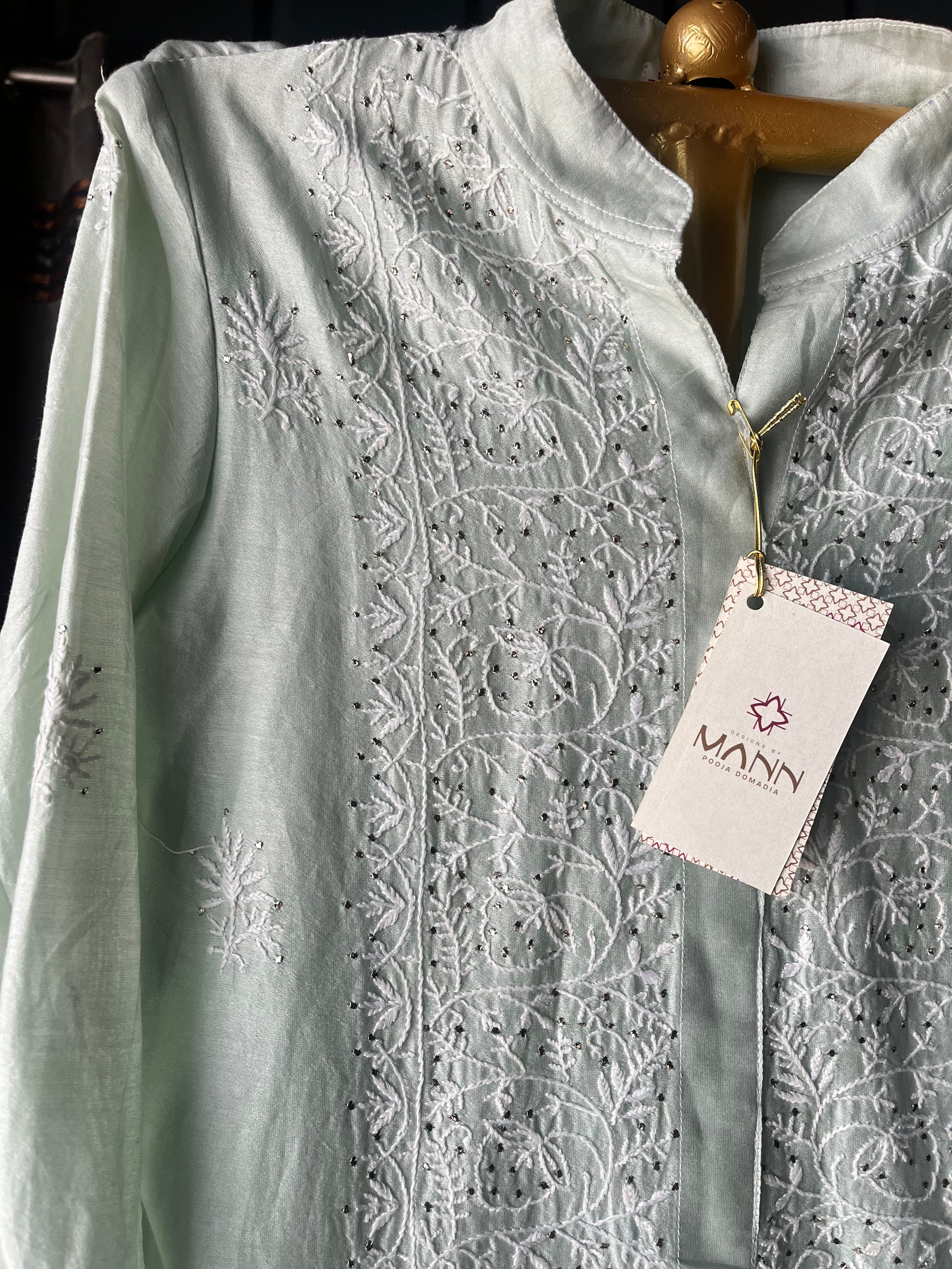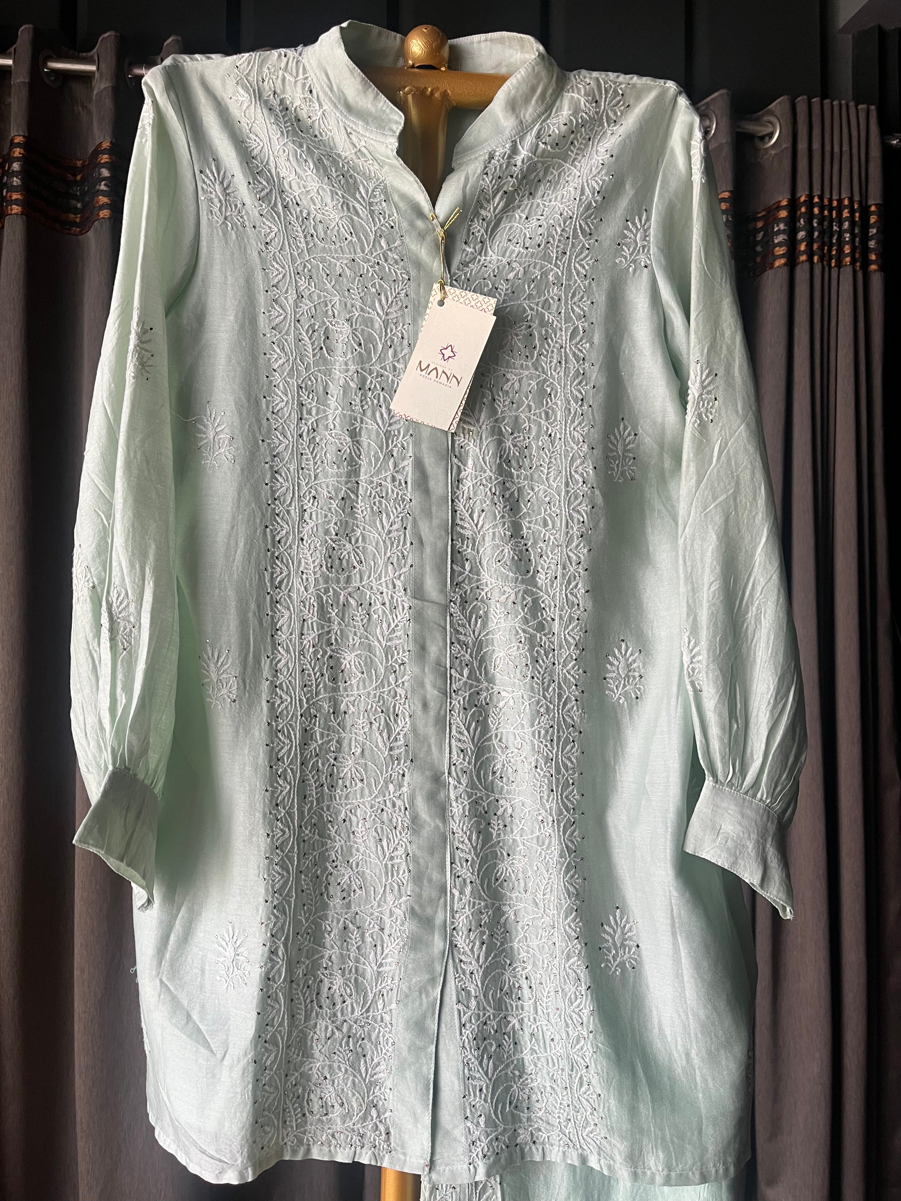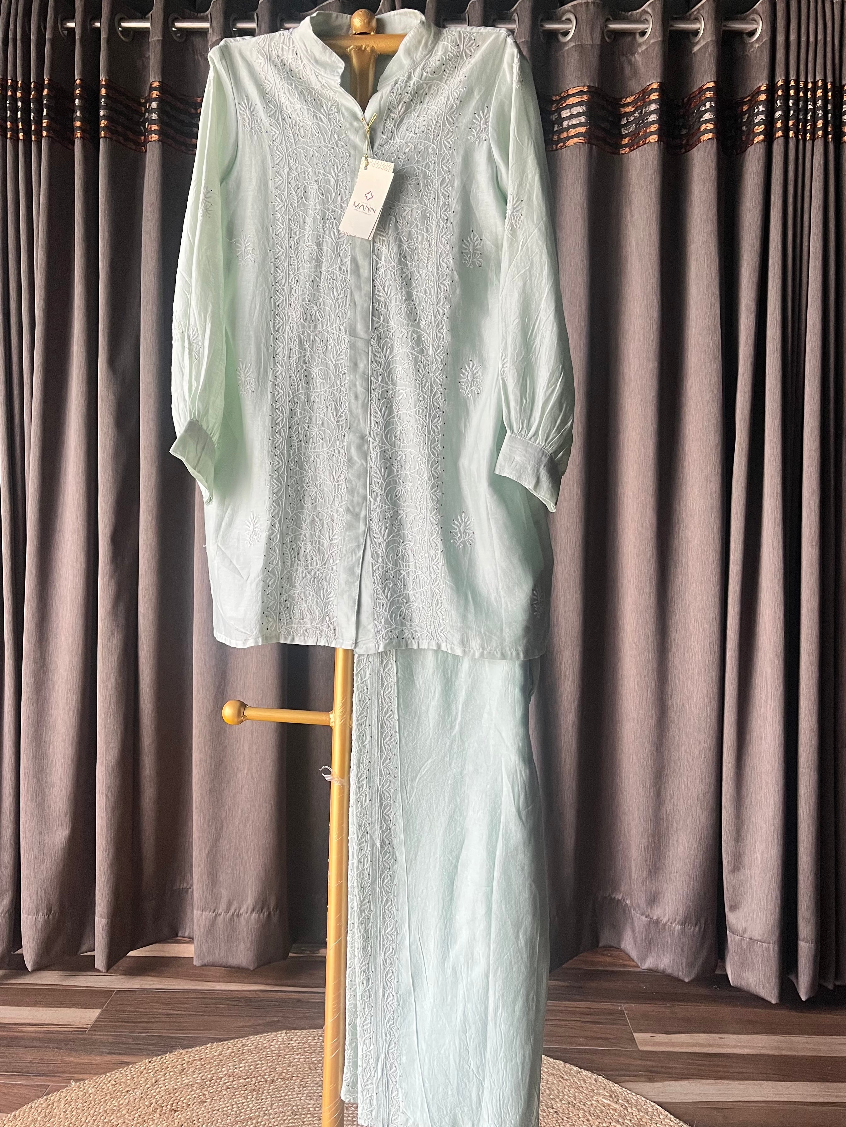 Sea Green Co-ord Set in chanderi silk adorned with chikankari and mukaish/badla work