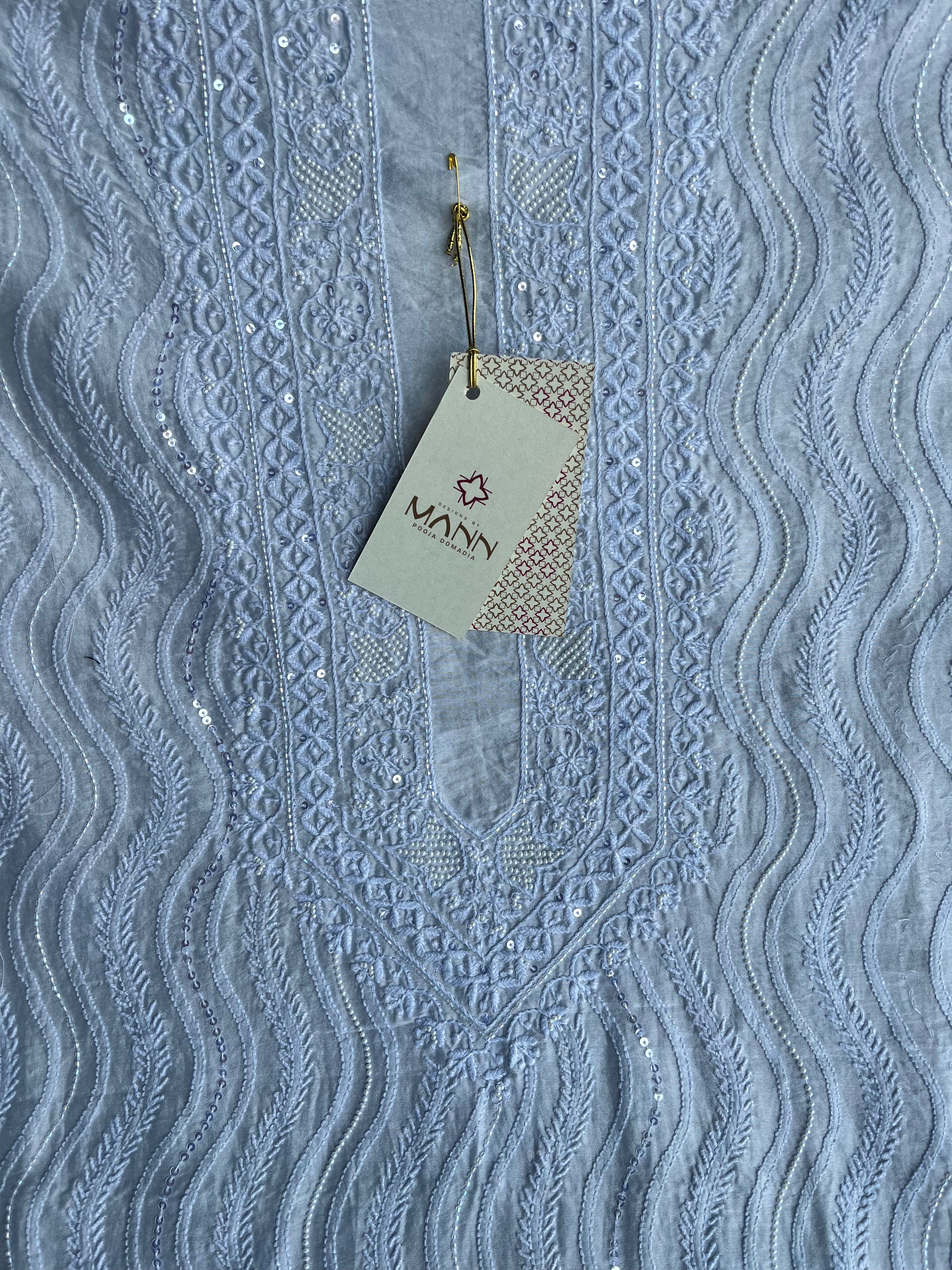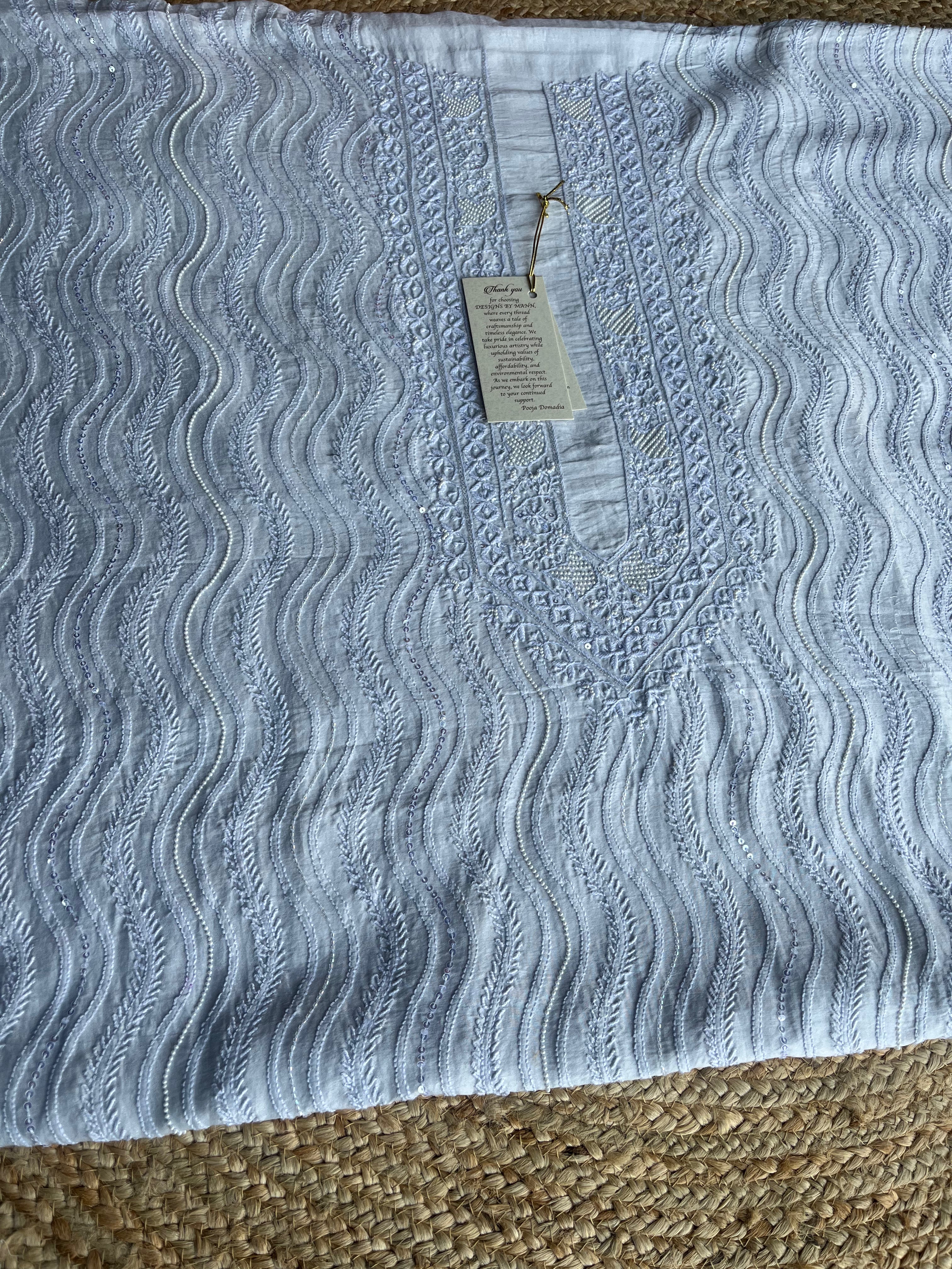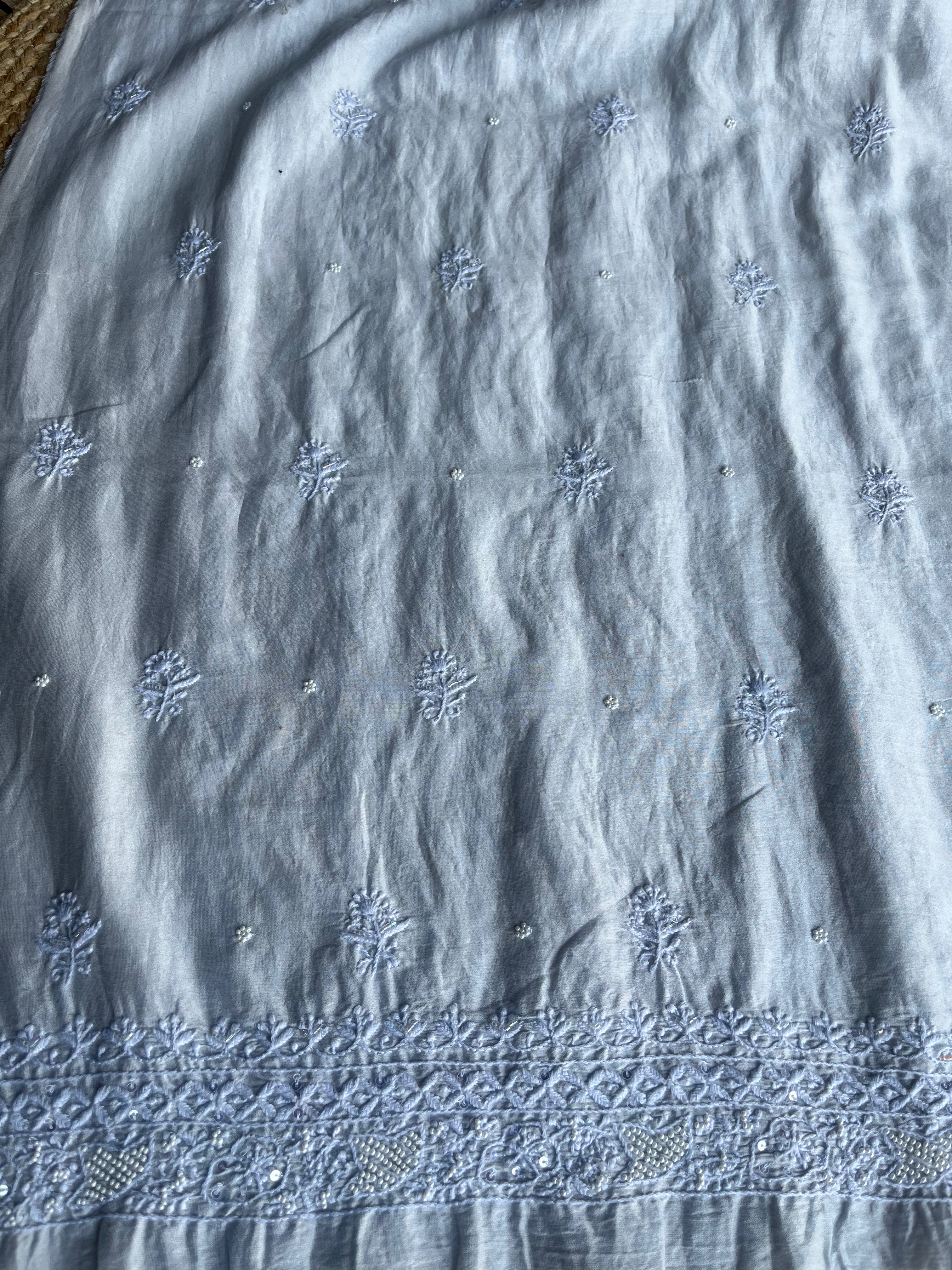 Slate blue chanderi silk chikankari men kurta fabric with embellishments in pearl cutdaana and sequins