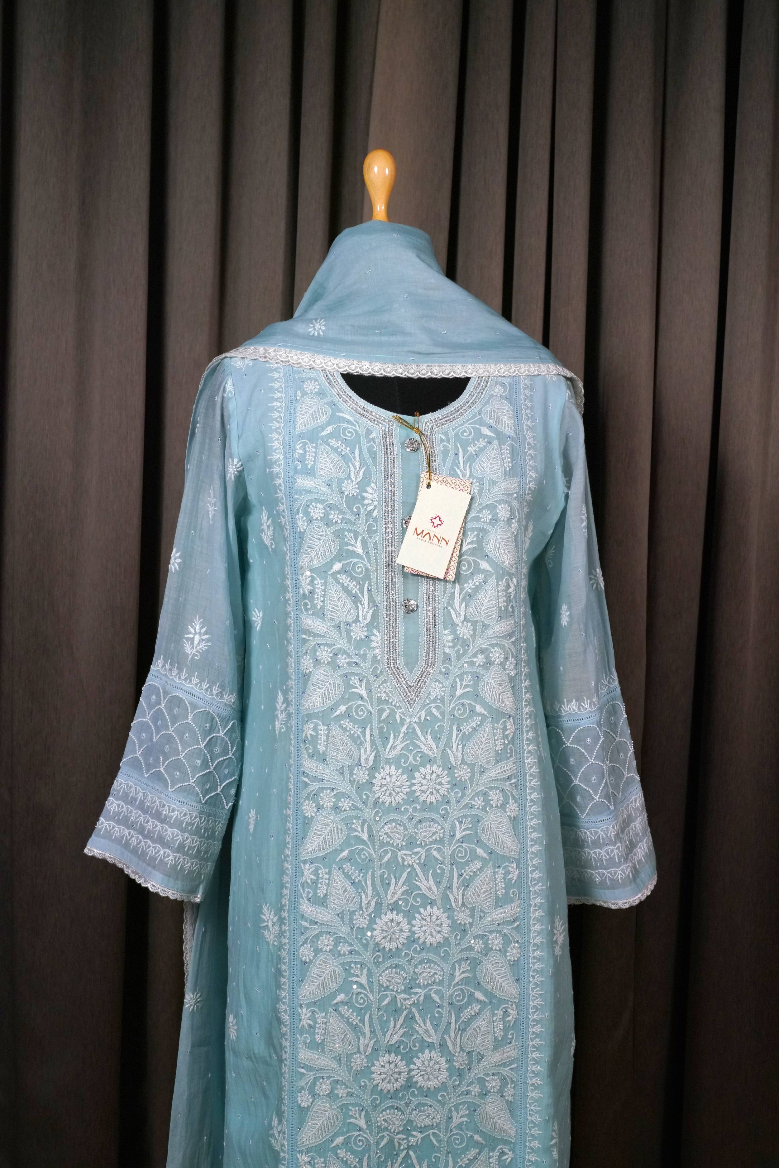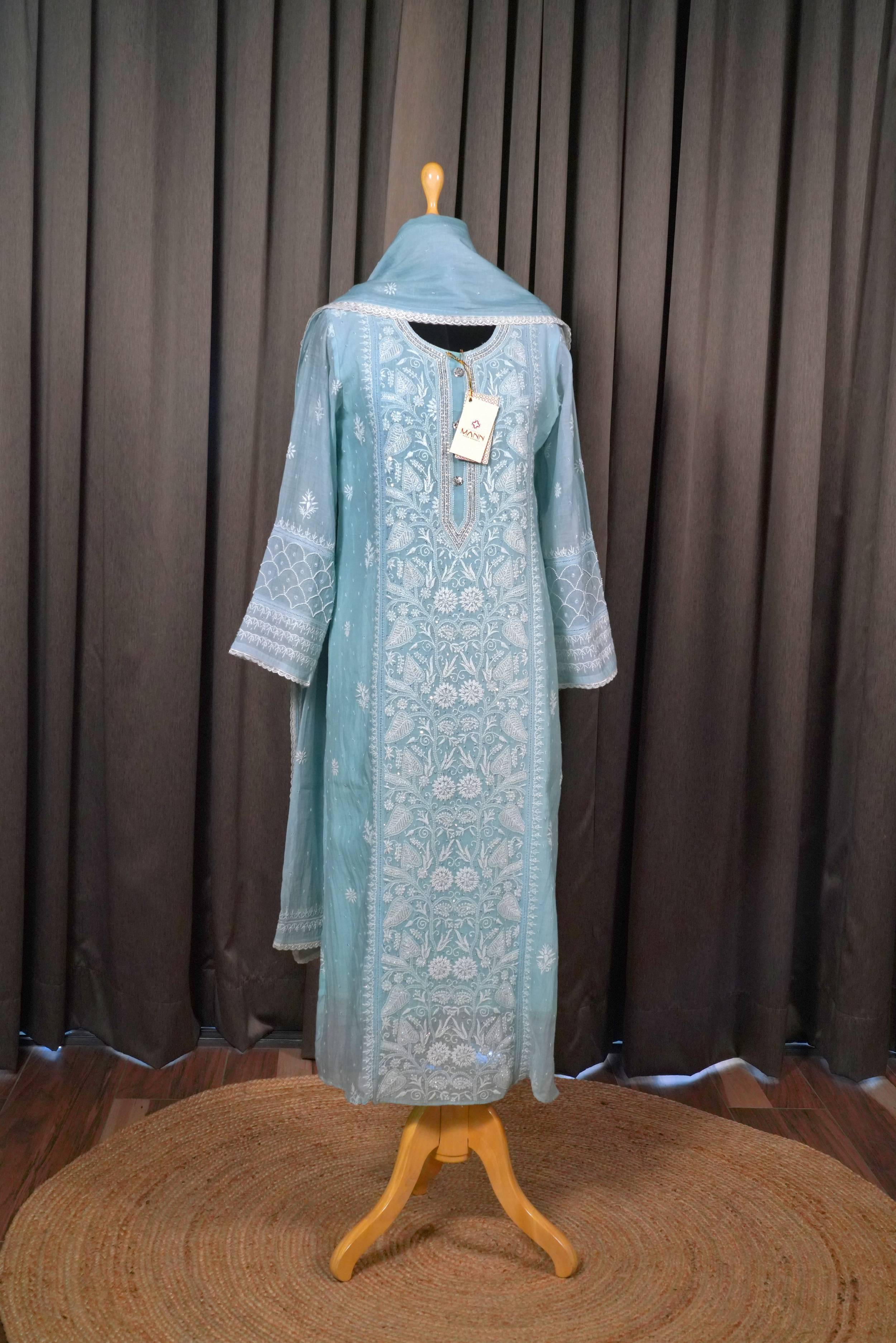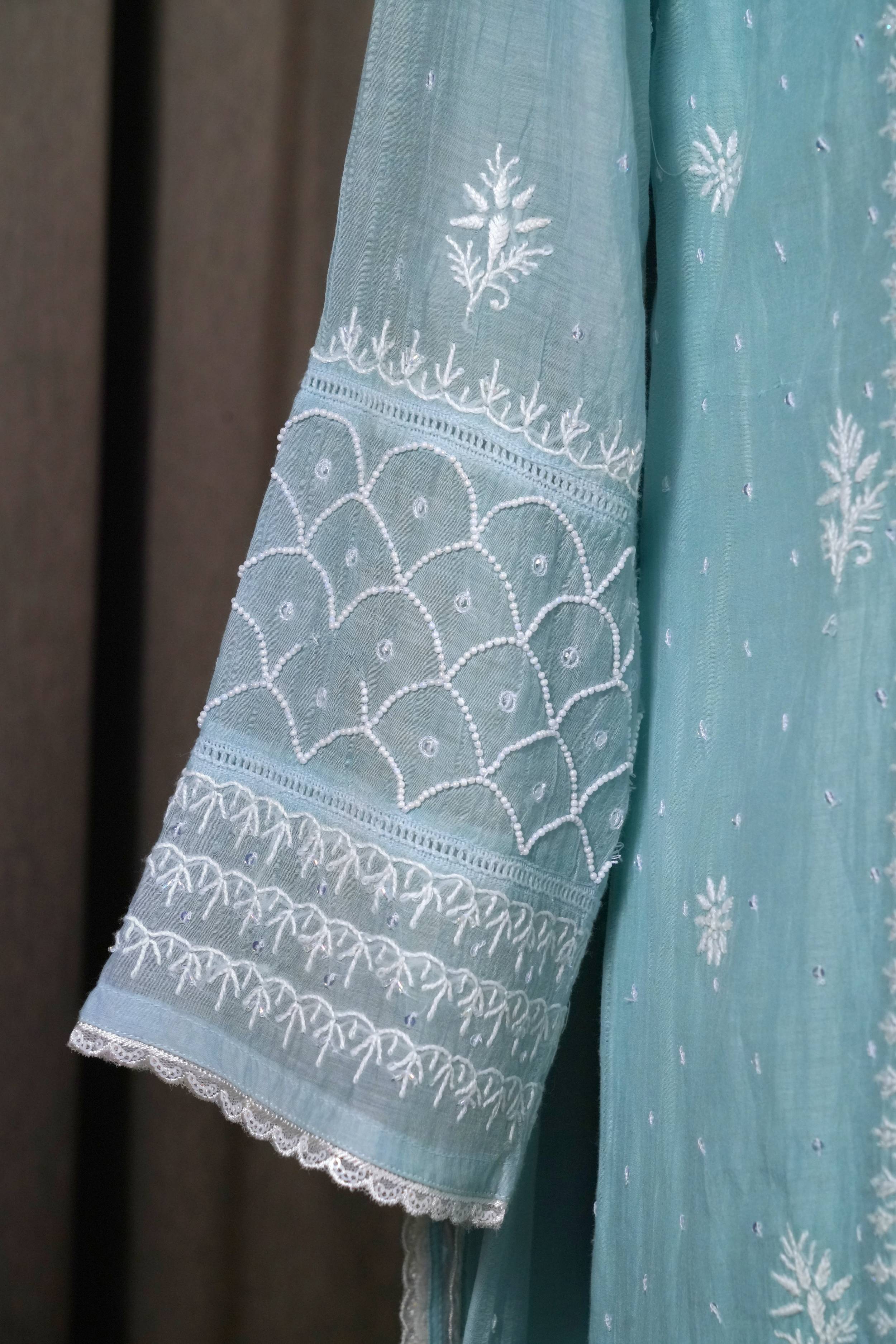 Teal Blue Mal Chanderi Suit Set in chikanakri with embellishments