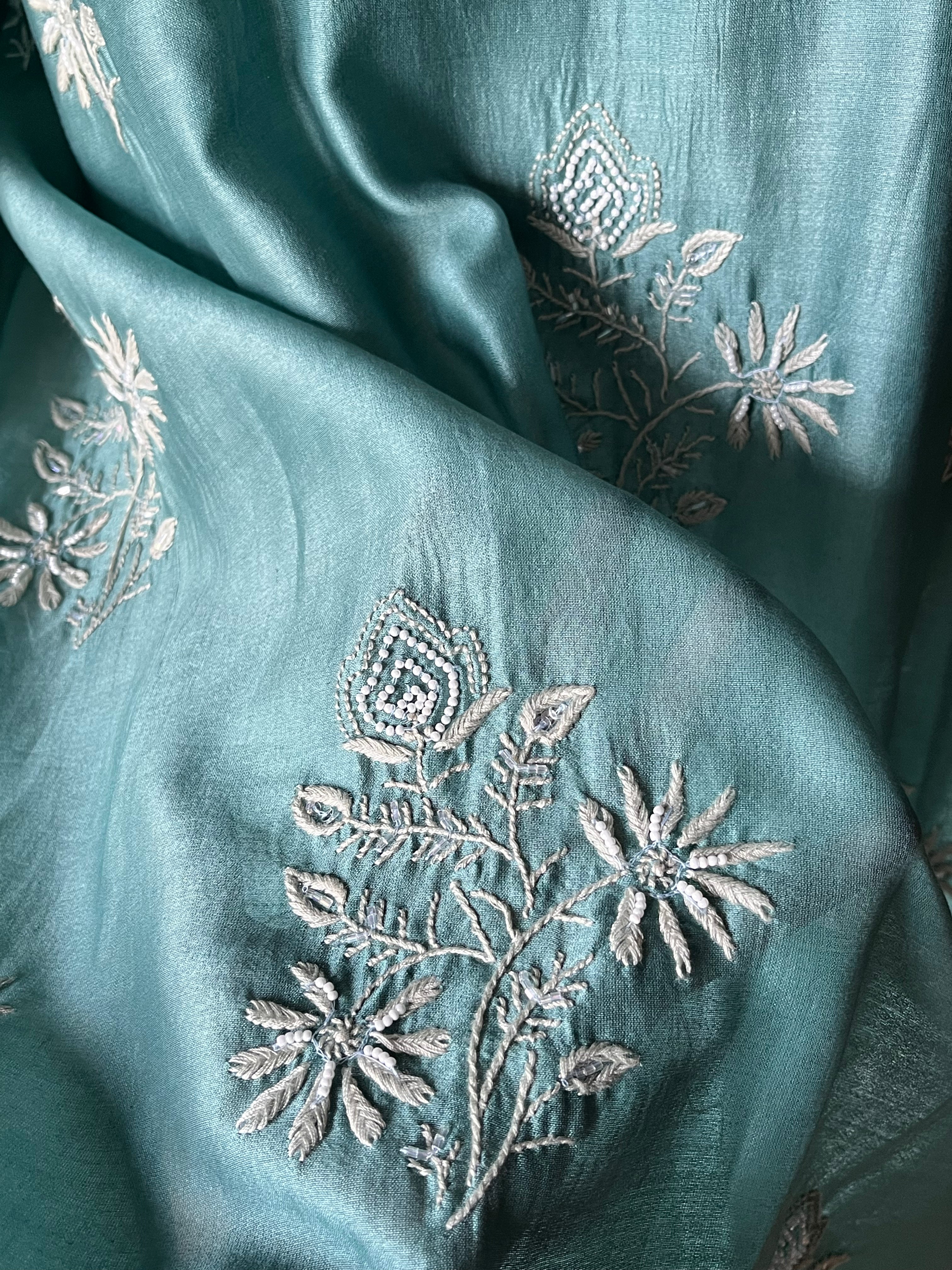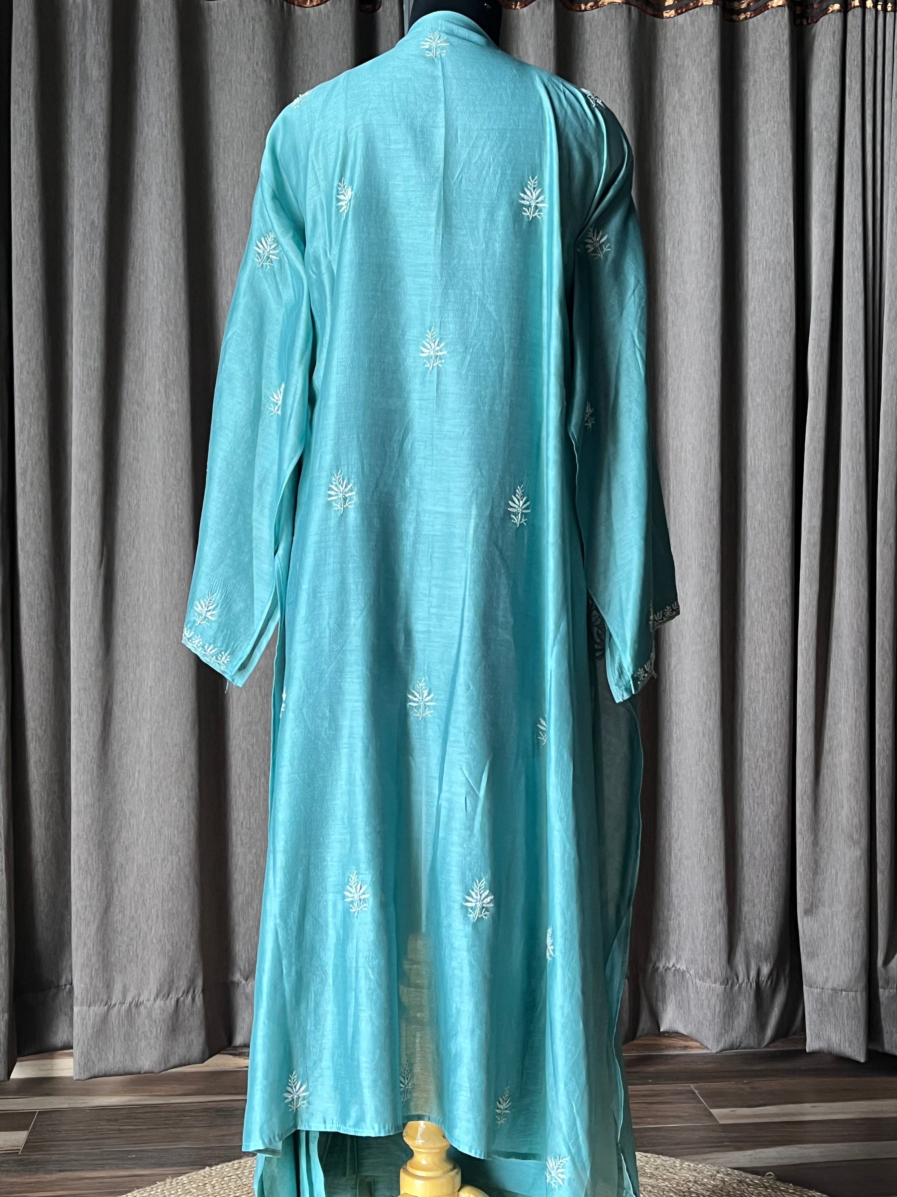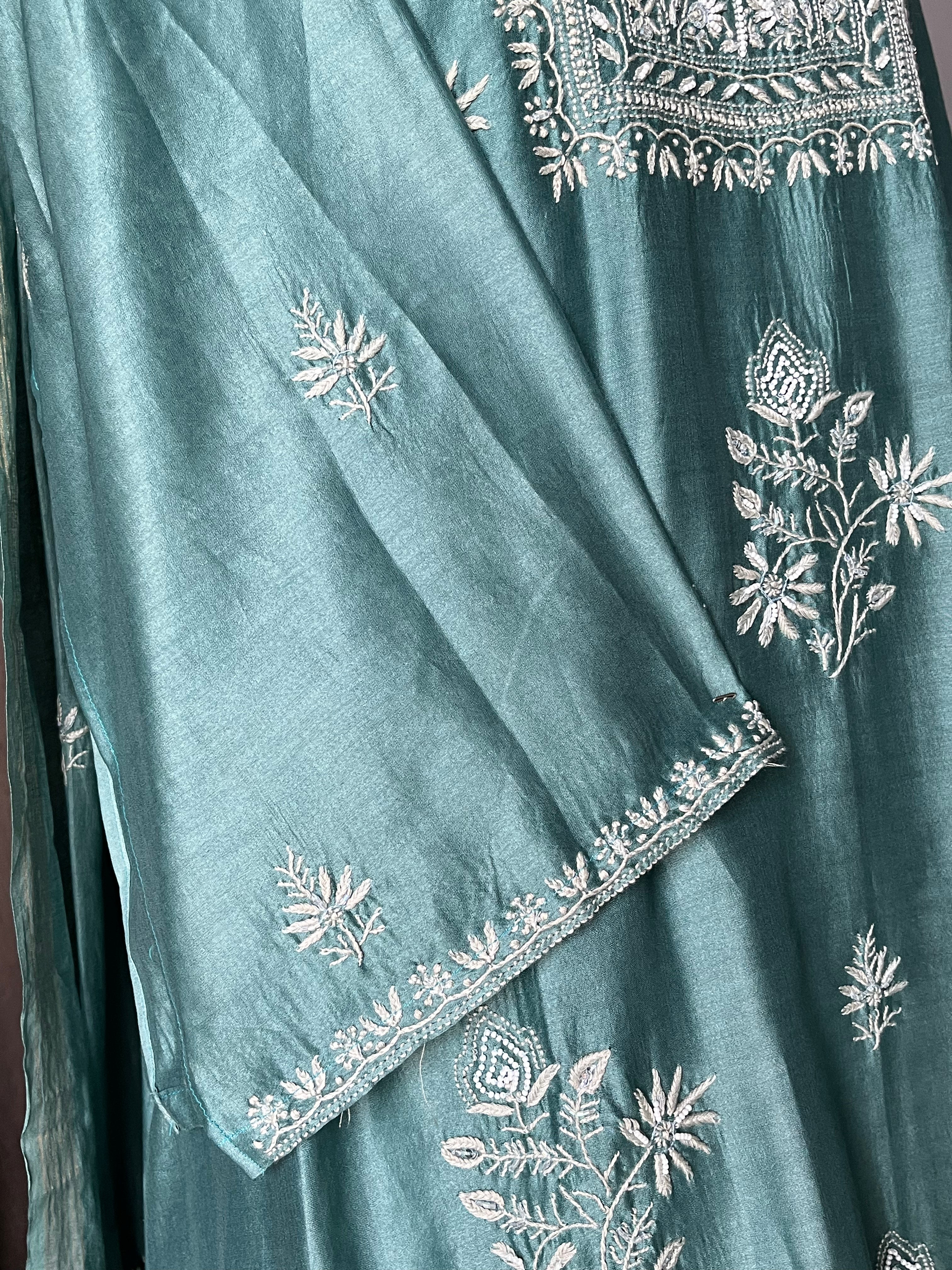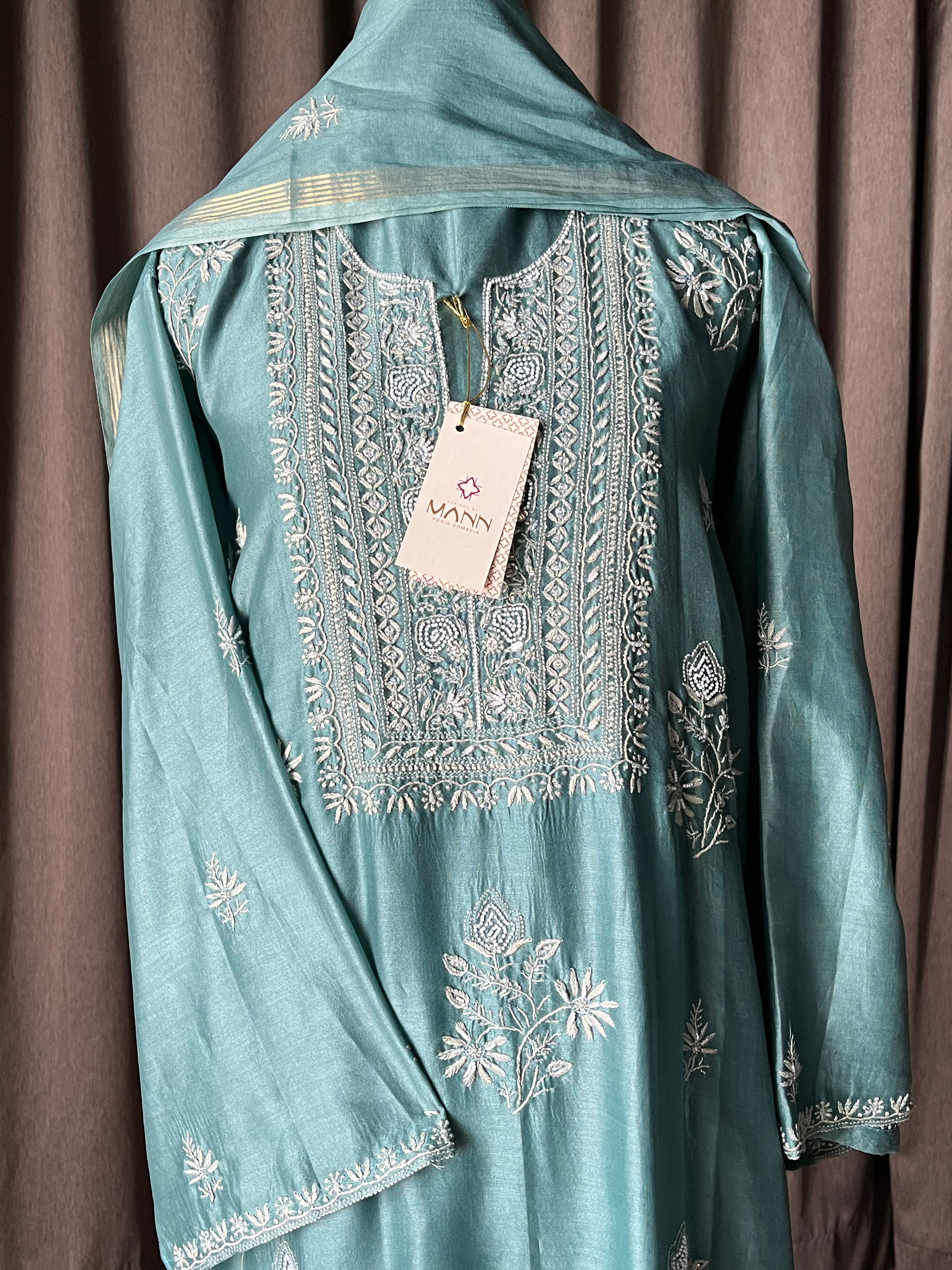 Semi-stitched turquoise blouse colour suit set in chanderi silk with handcrafted chikankari work and moti, cutdana and sequins embellishments